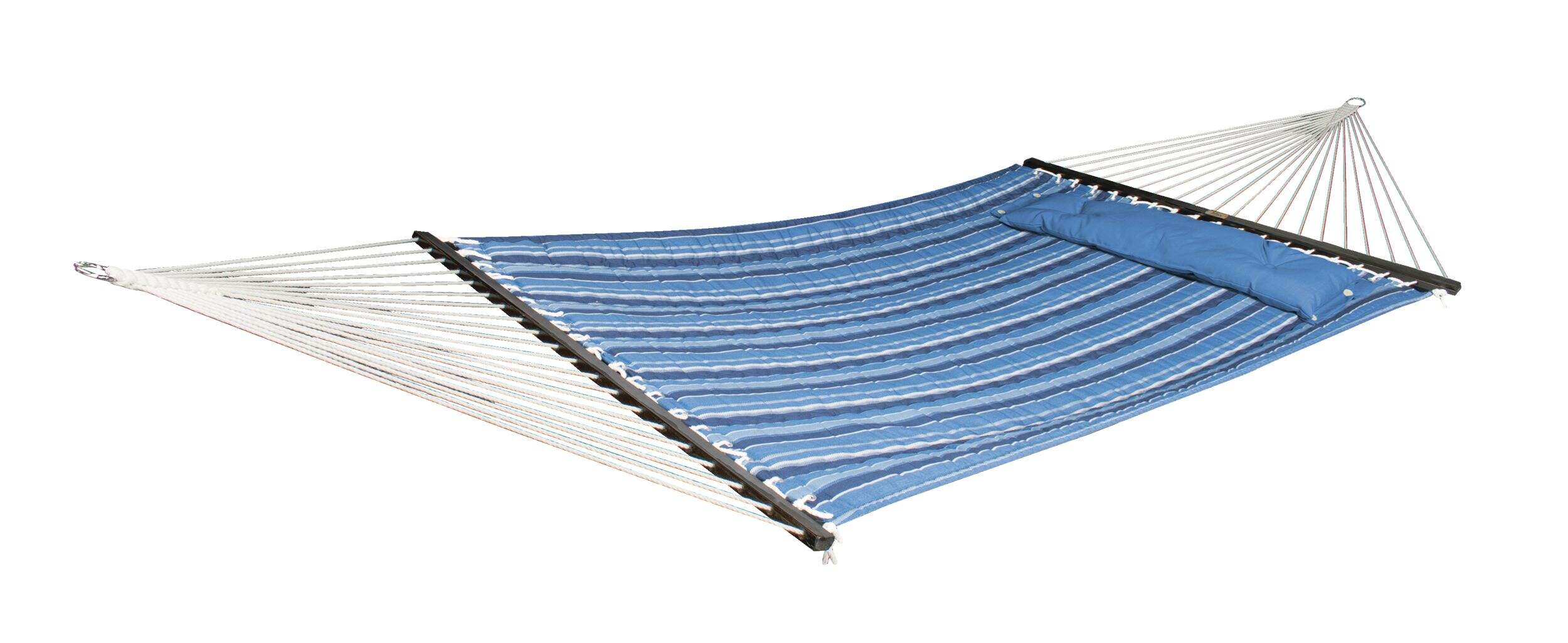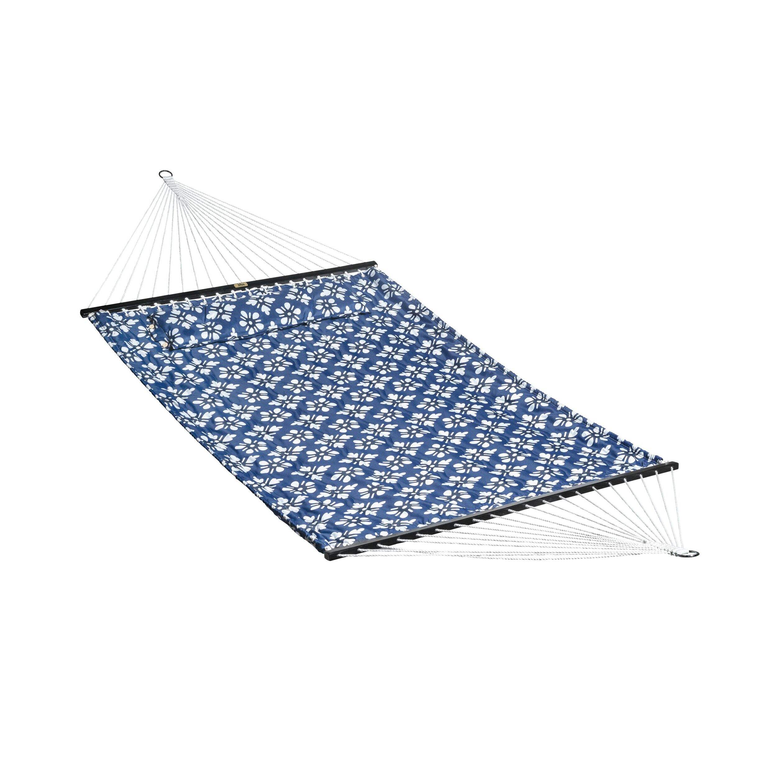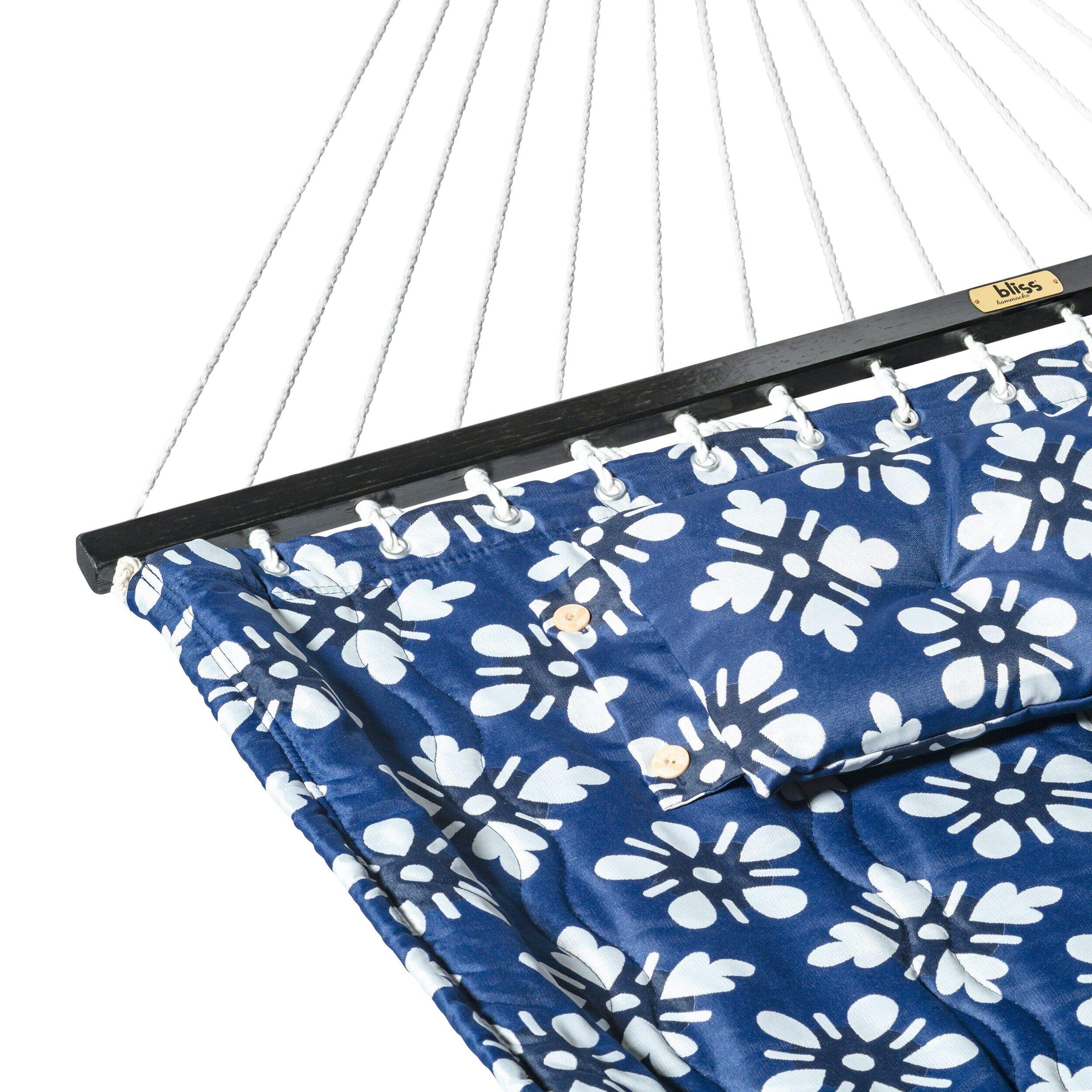 Lounge in comfort with the Bliss Hammocks Double Hammock with Pillow for Patio/Backyard. Its reversible, quilted bed features durable double stitching and a detachable button-tufted pillow for added relaxation. Made from quick-drying, weather-treated olefin fabric, it contours to your body while keeping the poly-fill in place. Hardwood spreader bars and sturdy zinc-coated hardware make setup easy and secure, perfect for sharing or solo unwinding outdoors.