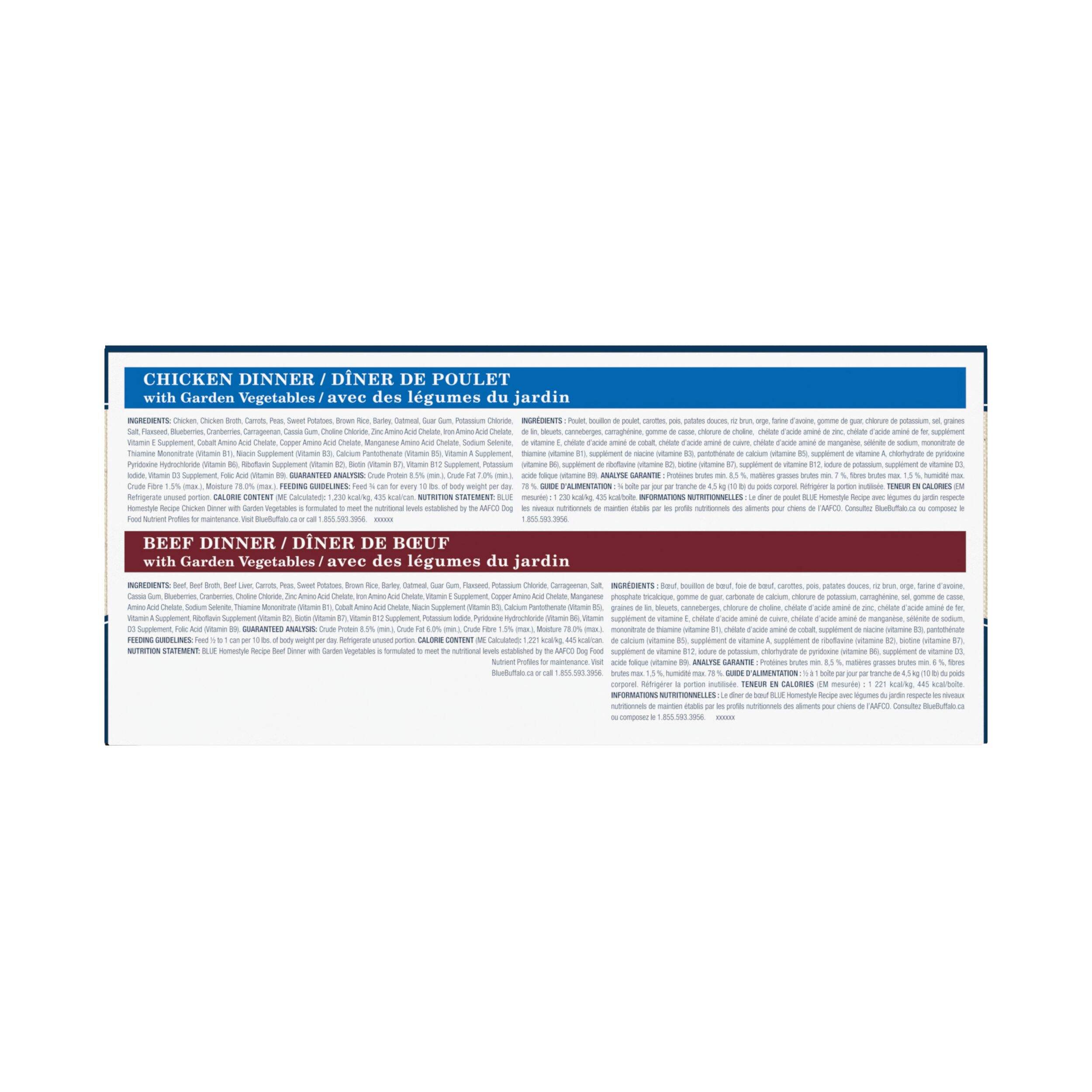 BLUE Homestyle Recipe Chicken Dinner provides your dog with delicious, high-quality chicken, wholesome whole grains and garden fruits and vegetables including carrots, sweet potatoes, blueberries and cranberries. BLUE Homestyle Recipe Beef Dinner wet dog food provides your buddy with delicious, high-quality beef, wholesome whole grains, and garden fruits and vegetables including carrots, sweet potatoes, blueberries, and cranberries.