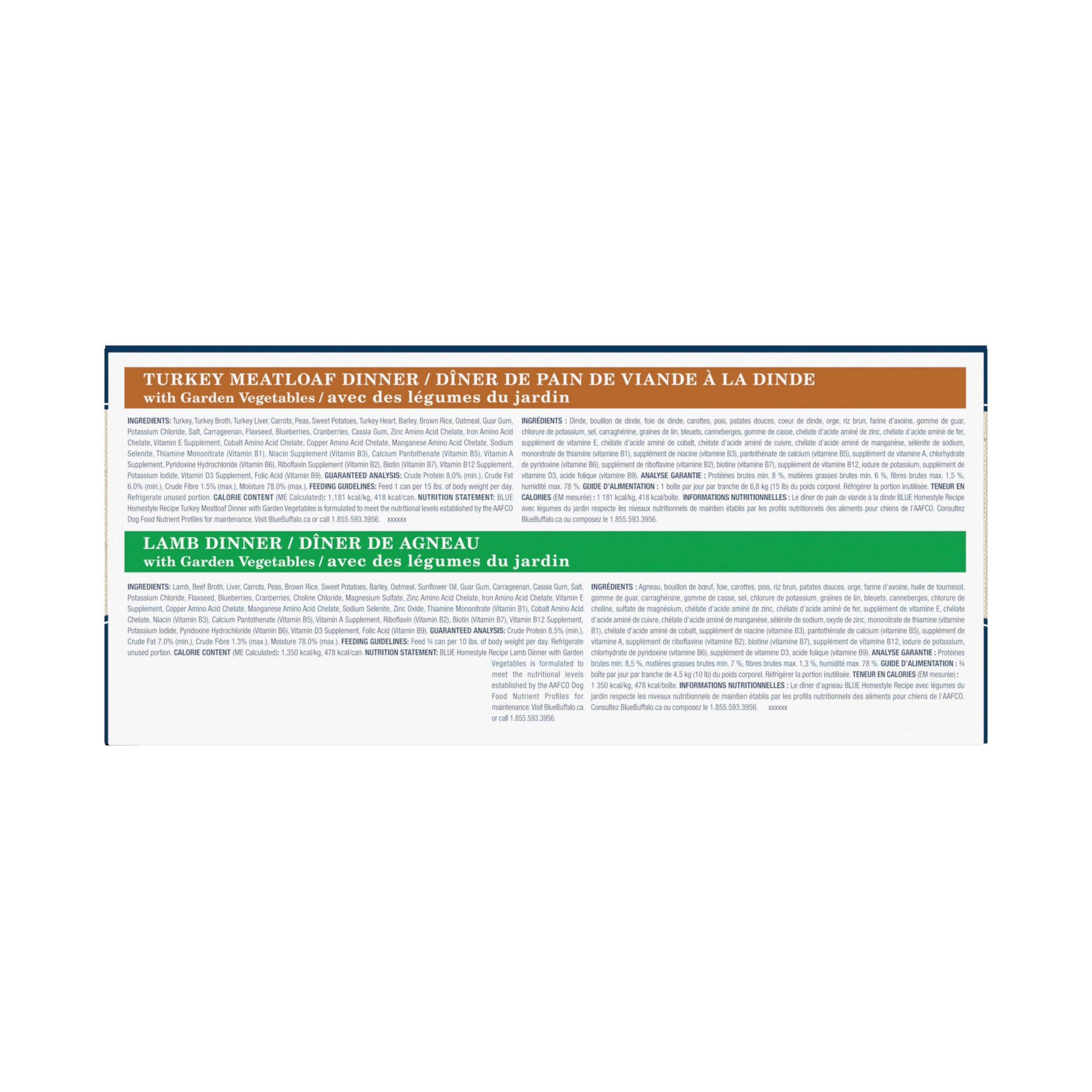 BLUE Homestyle Recipe Turkey Meatloaf Dinner provides your dog with delicious, high-quality turkey, wholesome whole grains and garden fruits and vegetables including carrots, sweet potatoes, blueberries and cranberries. BLUE Homestyle Recipe Lamb Dinner provides your dog with delicious, high-quality lamb, wholesome whole grains and garden fruits and vegetables including carrots, sweet potatoes, blueberries and cranberries.