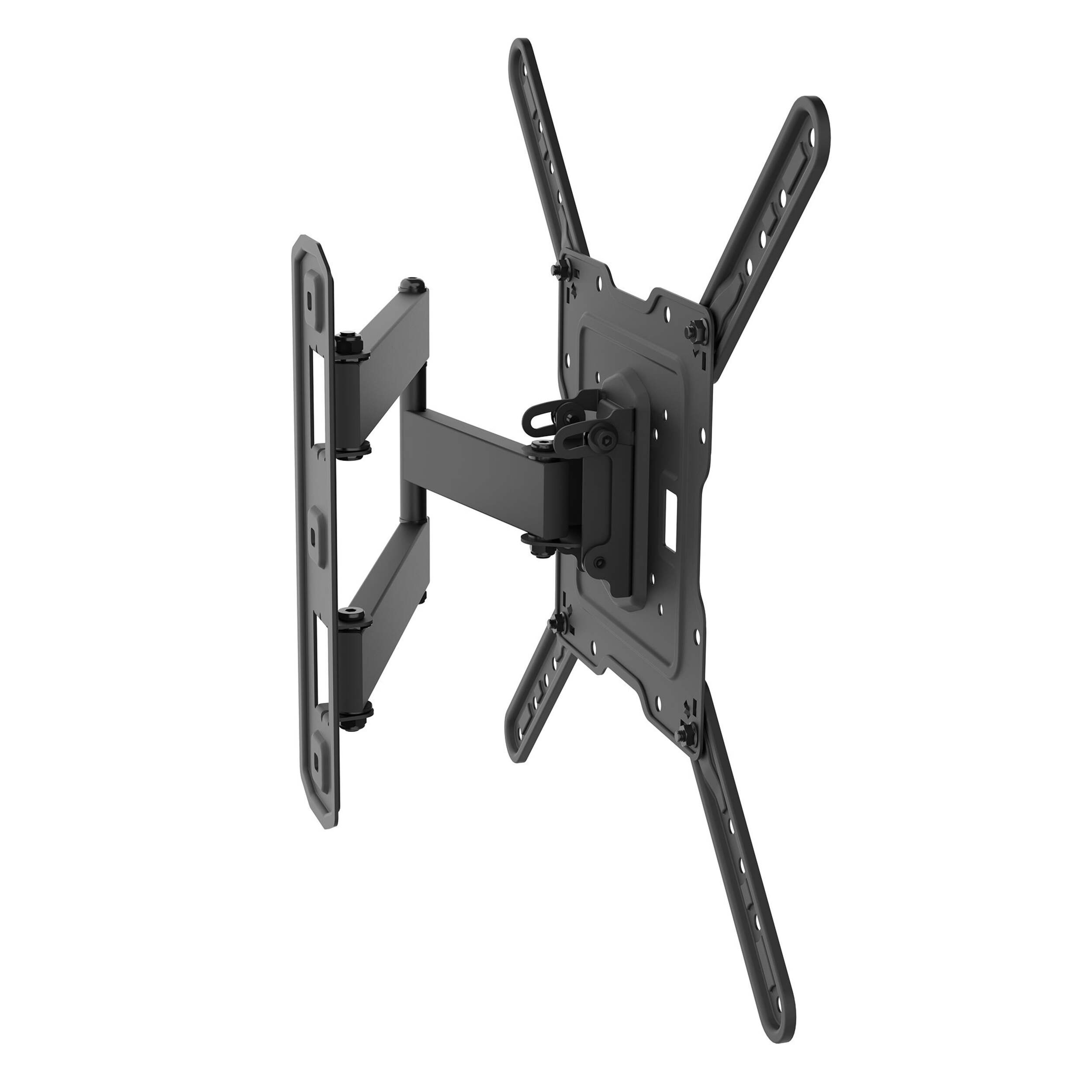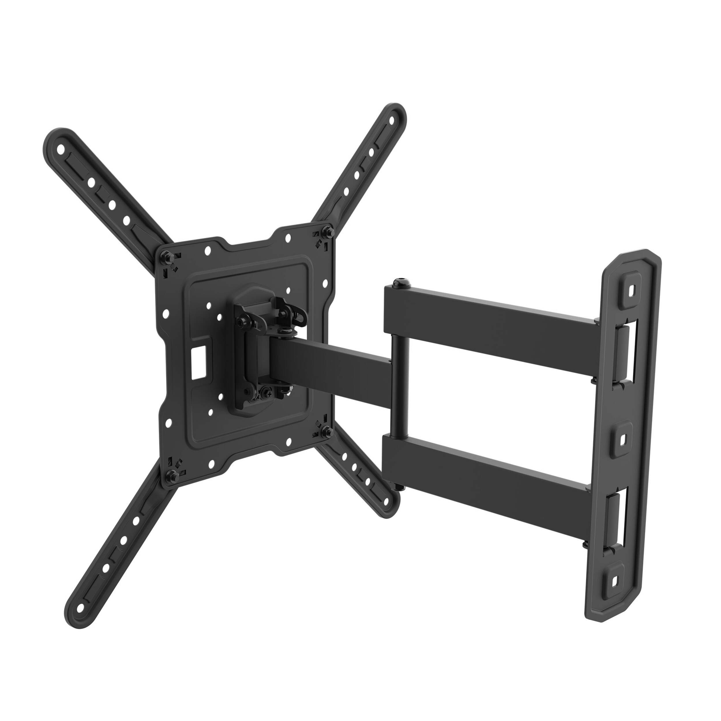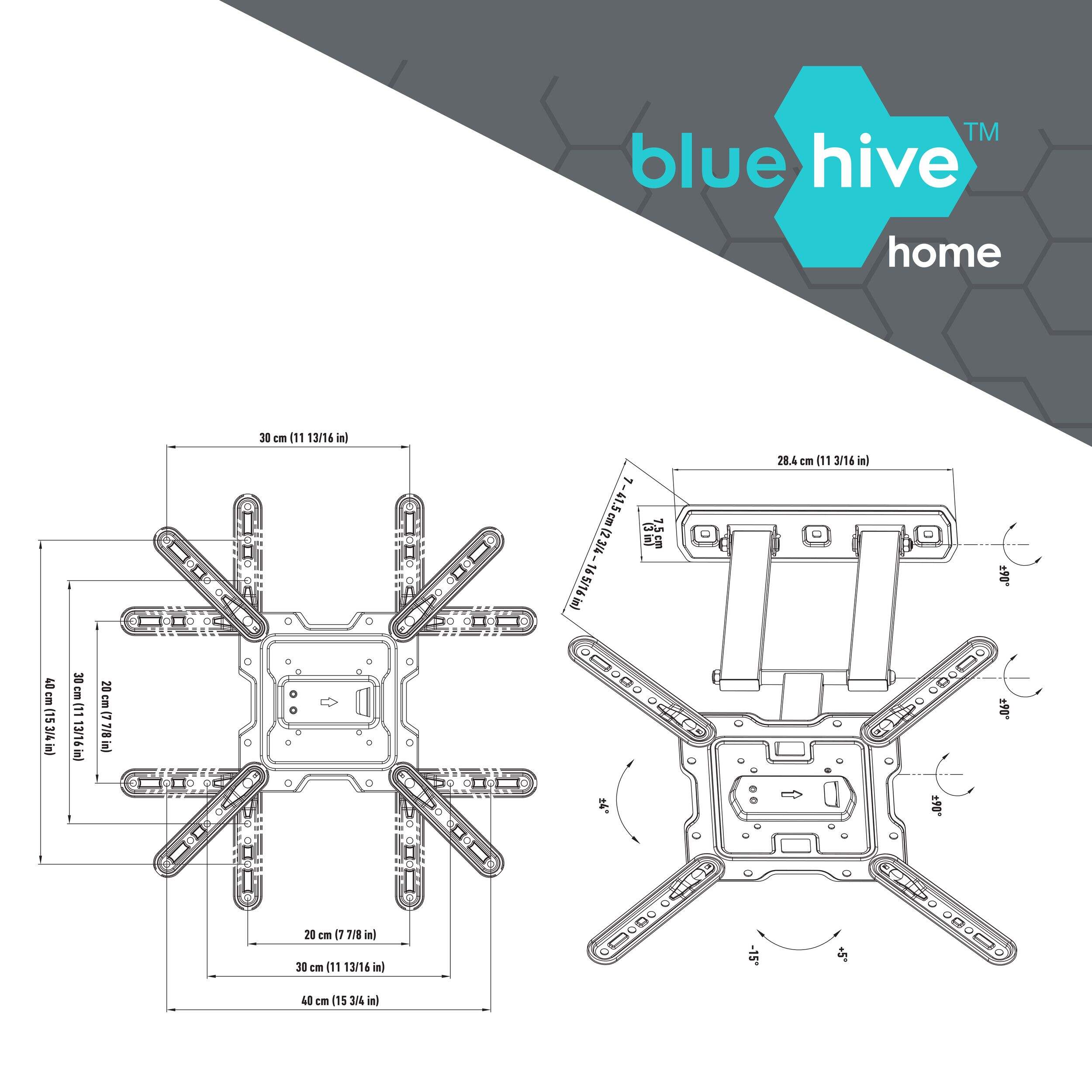 The Bluehive Full Motion TV Wall Mount eliminates neck craning and couch wrestling with its ultra-flexible design. Mount your 19" to 50" flat panel and swivel a full 180 degrees horizontally, tilt from +5° to -13°, or extend the arm from 2.5" to 16" off the wall. Its universal VESA pattern compatibility welcomes any screen from 75x75 mm to 400x400 mm. With this wall mount, you call the shots on the optimal viewing experience, whether that's a wide pan for movie night or a subtle tilt for avoiding glare.