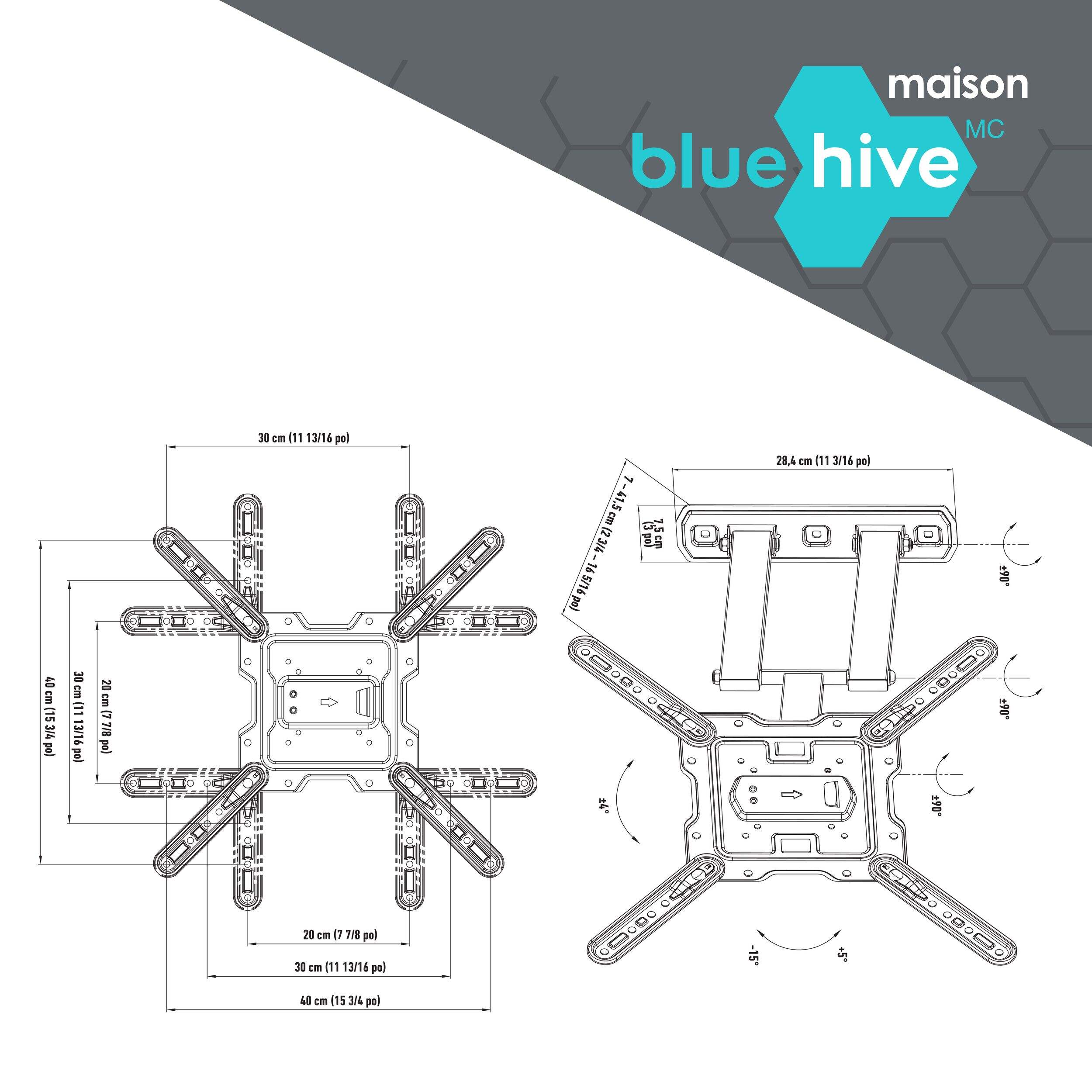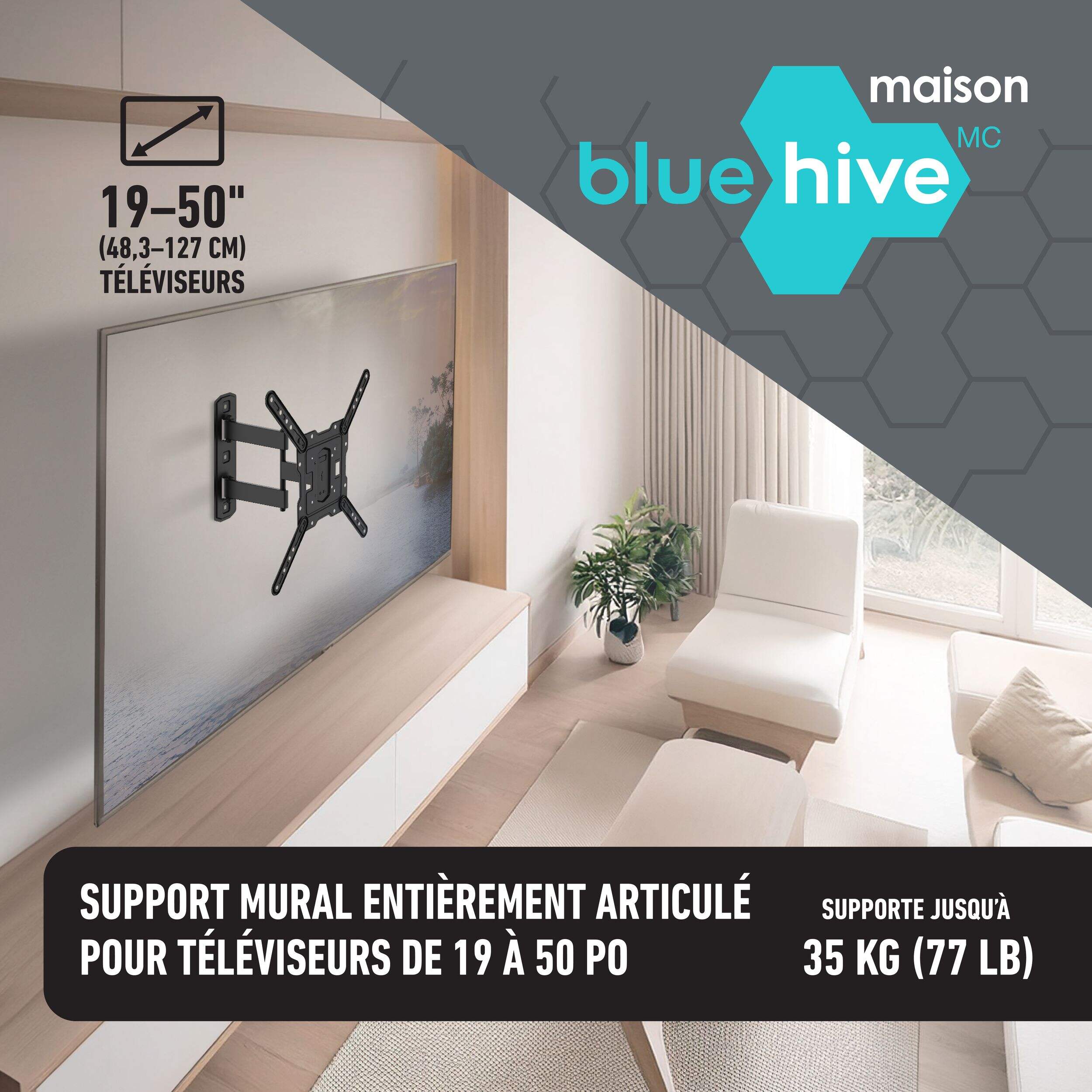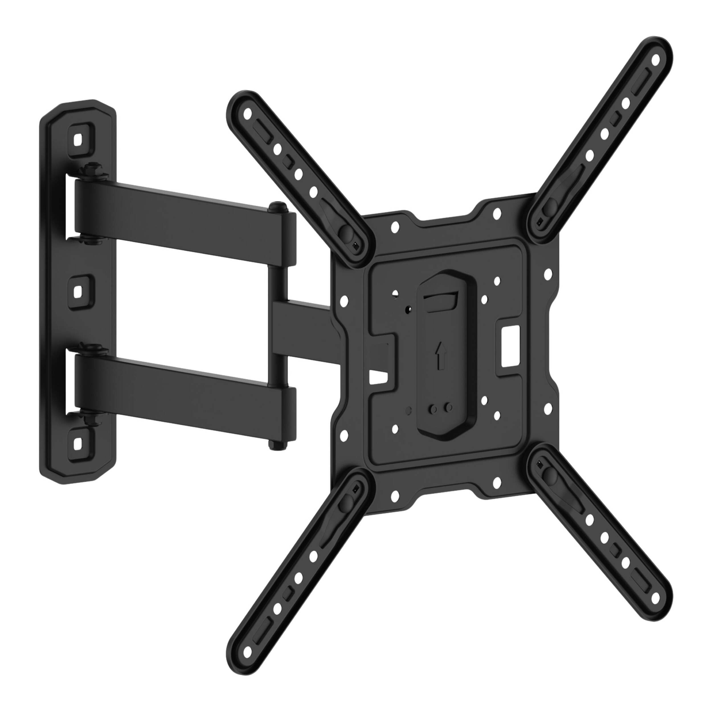 The Bluehive Full Motion TV Wall Mount eliminates neck craning and couch wrestling with its ultra-flexible design. Mount your 19" to 50" flat panel and swivel a full 180 degrees horizontally, tilt from +5° to -13°, or extend the arm from 2.5" to 16" off the wall. Its universal VESA pattern compatibility welcomes any screen from 75x75 mm to 400x400 mm. With this wall mount, you call the shots on the optimal viewing experience, whether that's a wide pan for movie night or a subtle tilt for avoiding glare.