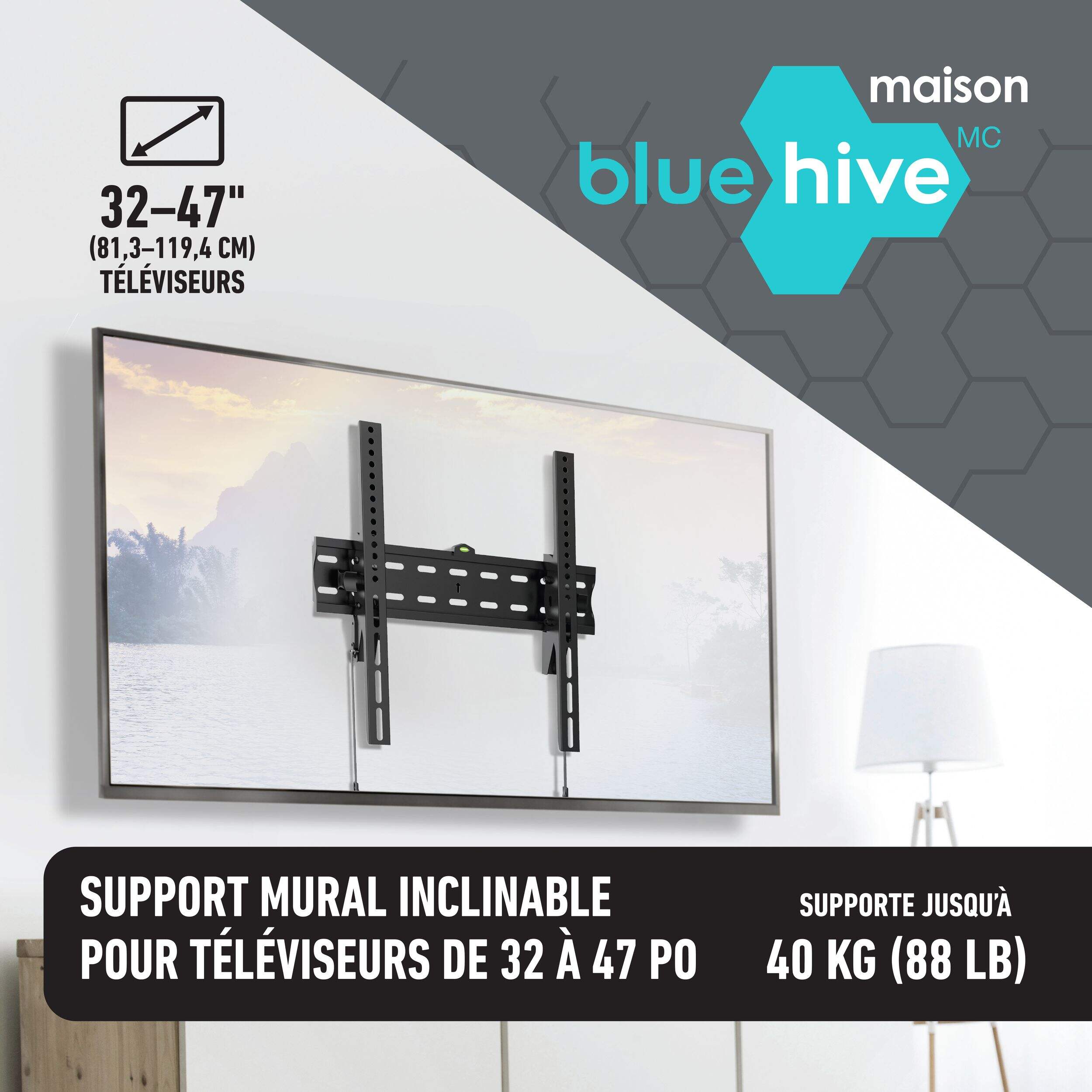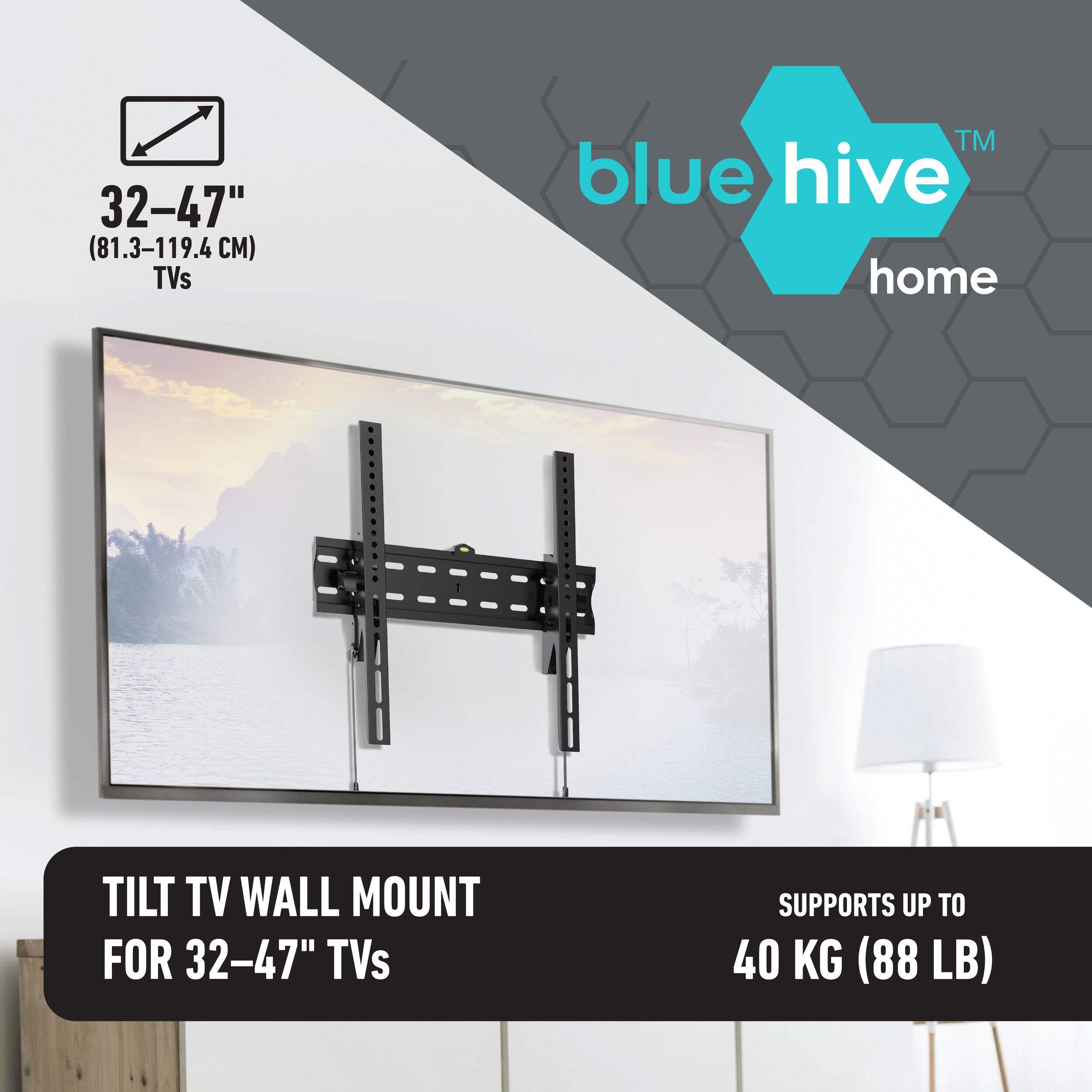 The Bluehive Tilting TV Wall Mount allows you to securely mount 32" to 47" flat panel televisions. Easily optimize your viewing experience and reduce glare by tilting the TV forward or backward. Install this sturdy mount to keep your television securely in place while taking advantage of the adjustable tilt for the perfect viewing angle.