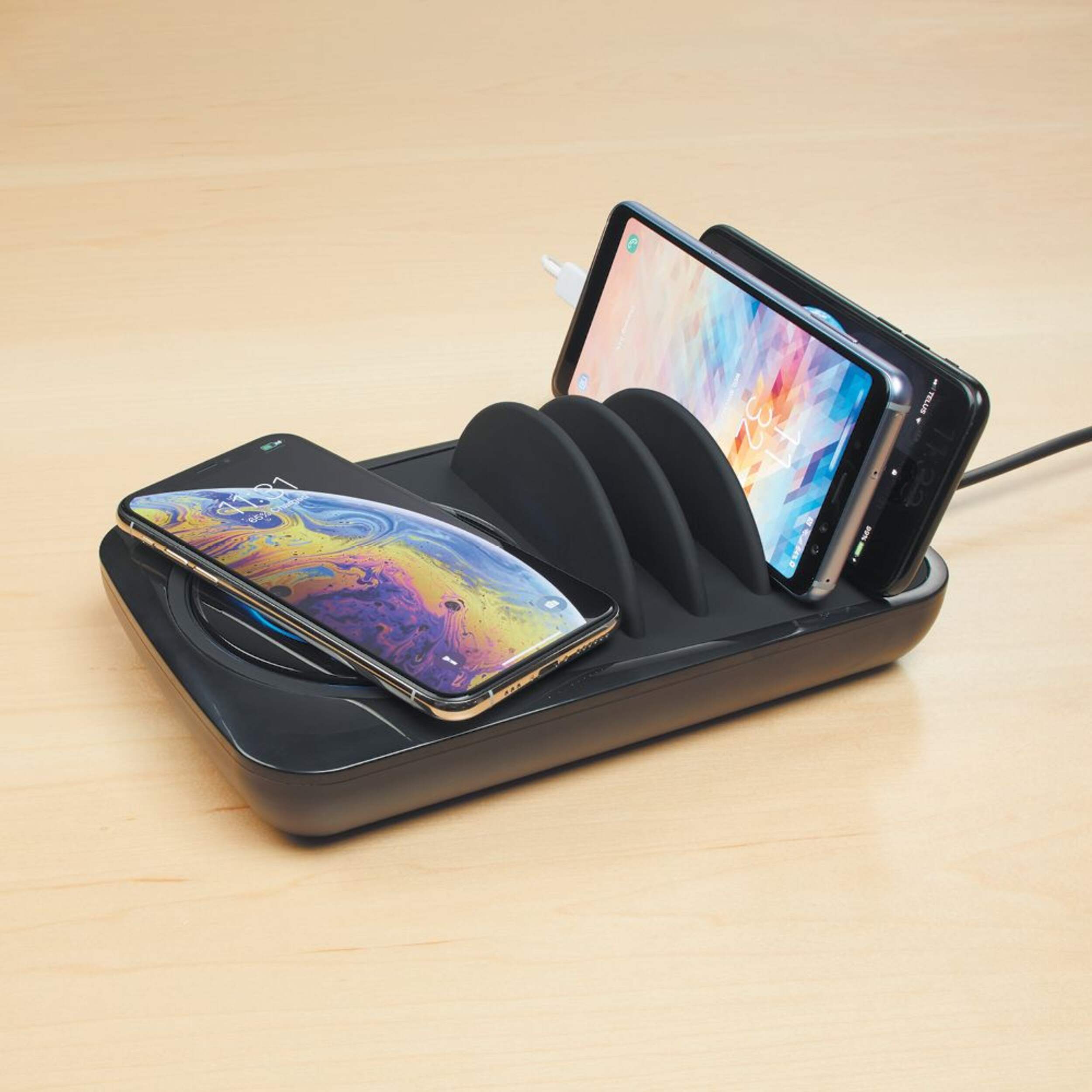 Charges one device wirelessly and the rest of the devices using USB cables