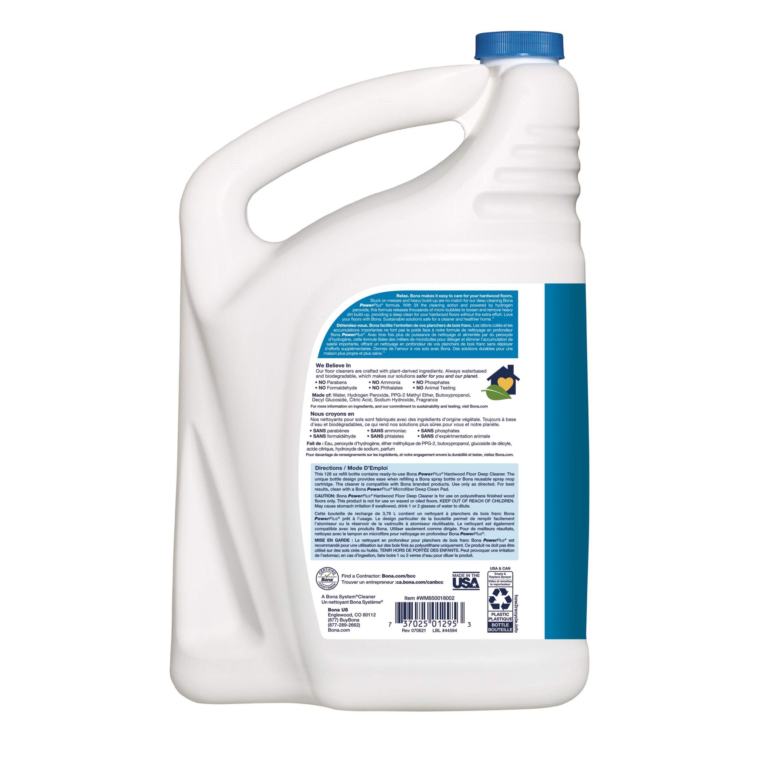 The Bona PowerPlus Hardwood Floor Deep Cleaner is an oxygenated formula that penetrates for a deep clean, loosening heavy build-up while its bubbling action lifts away debris. This ready-to-use cleaner simply requires you to spray and mop. It leaves no residue and dries fast using hydrogen peroxide for a deeper clean. Water-based and biodegradable, this cleaner contains no ammonia, petroleum, phosphates, phthalates or added dyes.