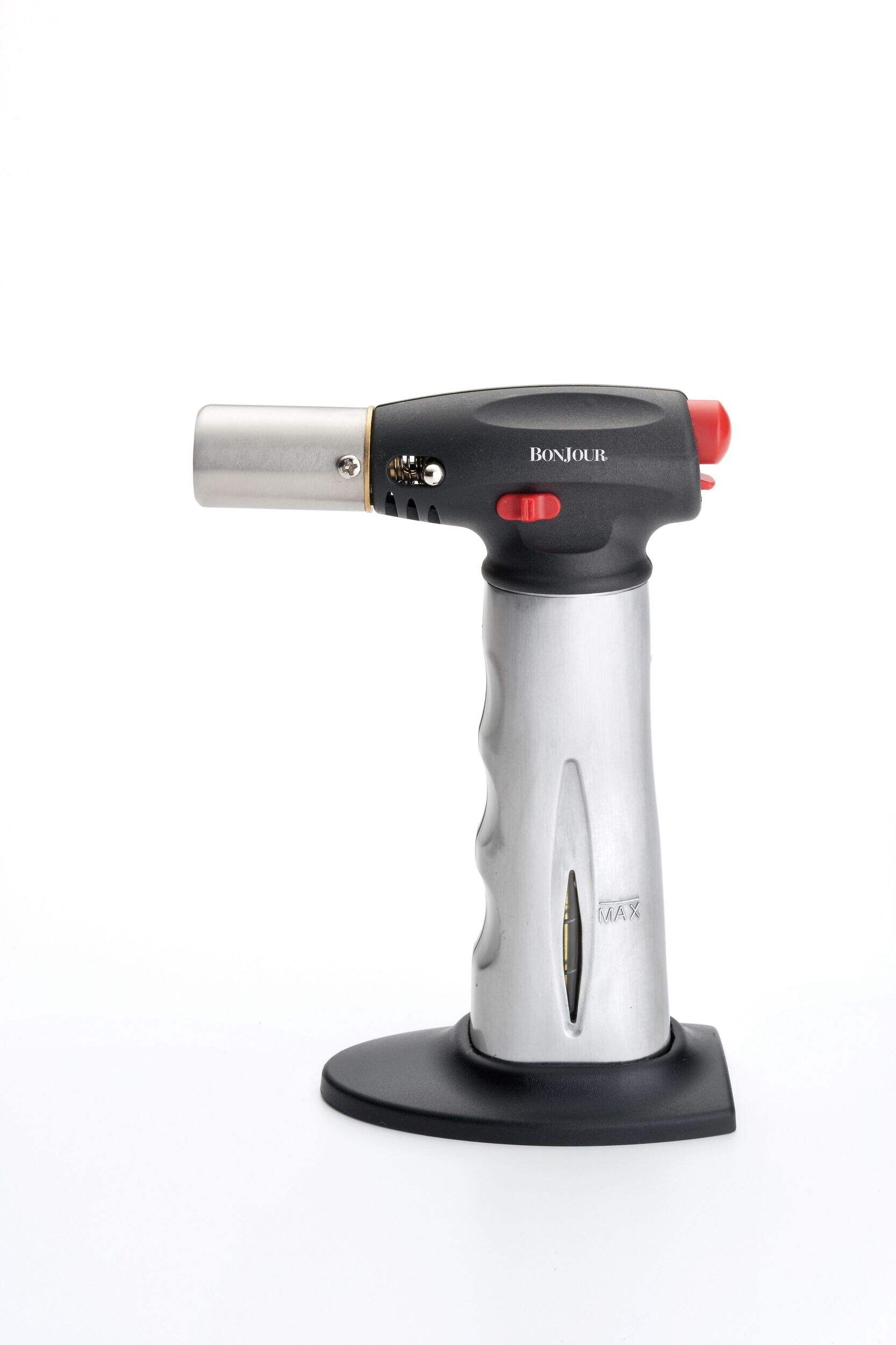 BonJour Chef's Aluminum Crème Brûlée Torch has a fuel level indicator window that shows when it's time to refill