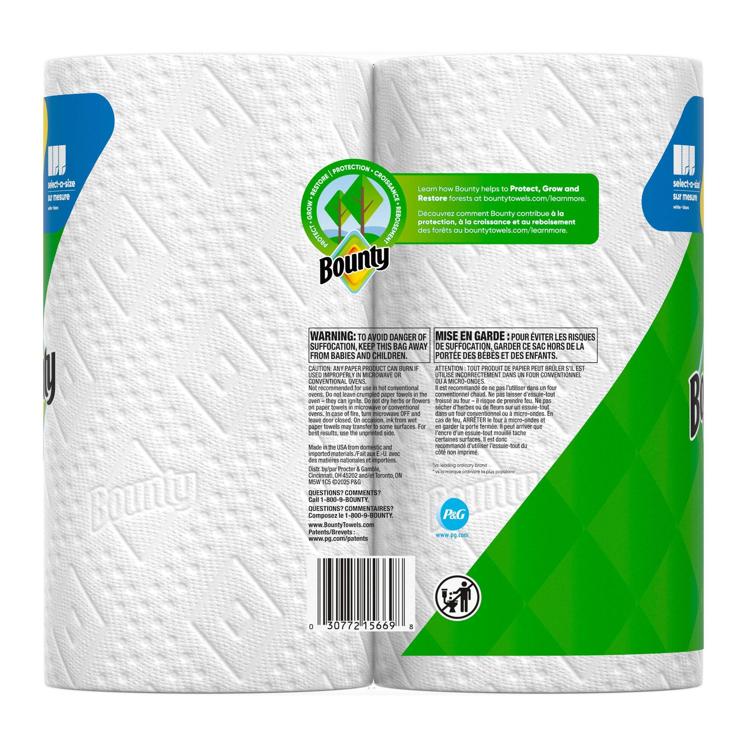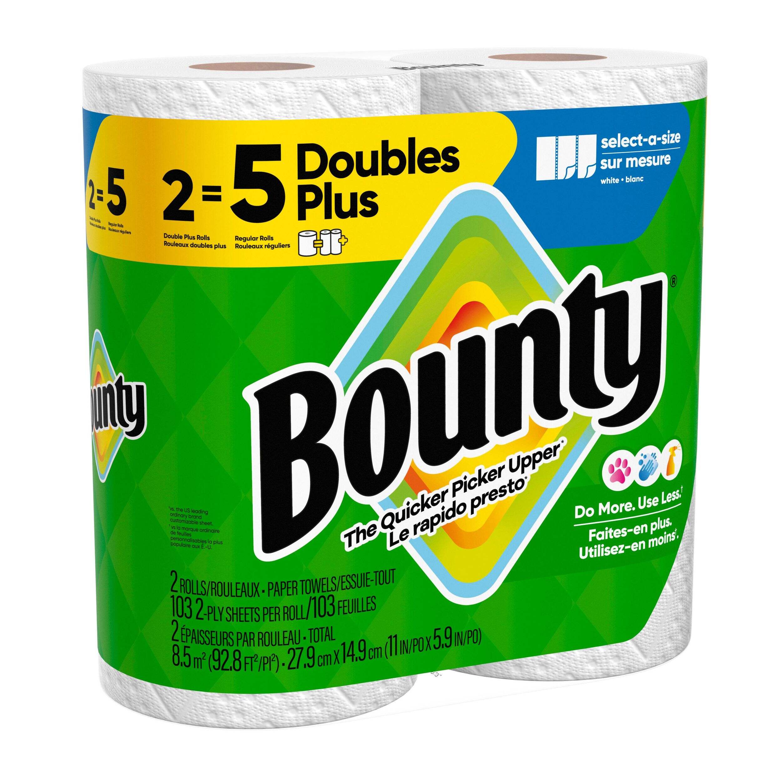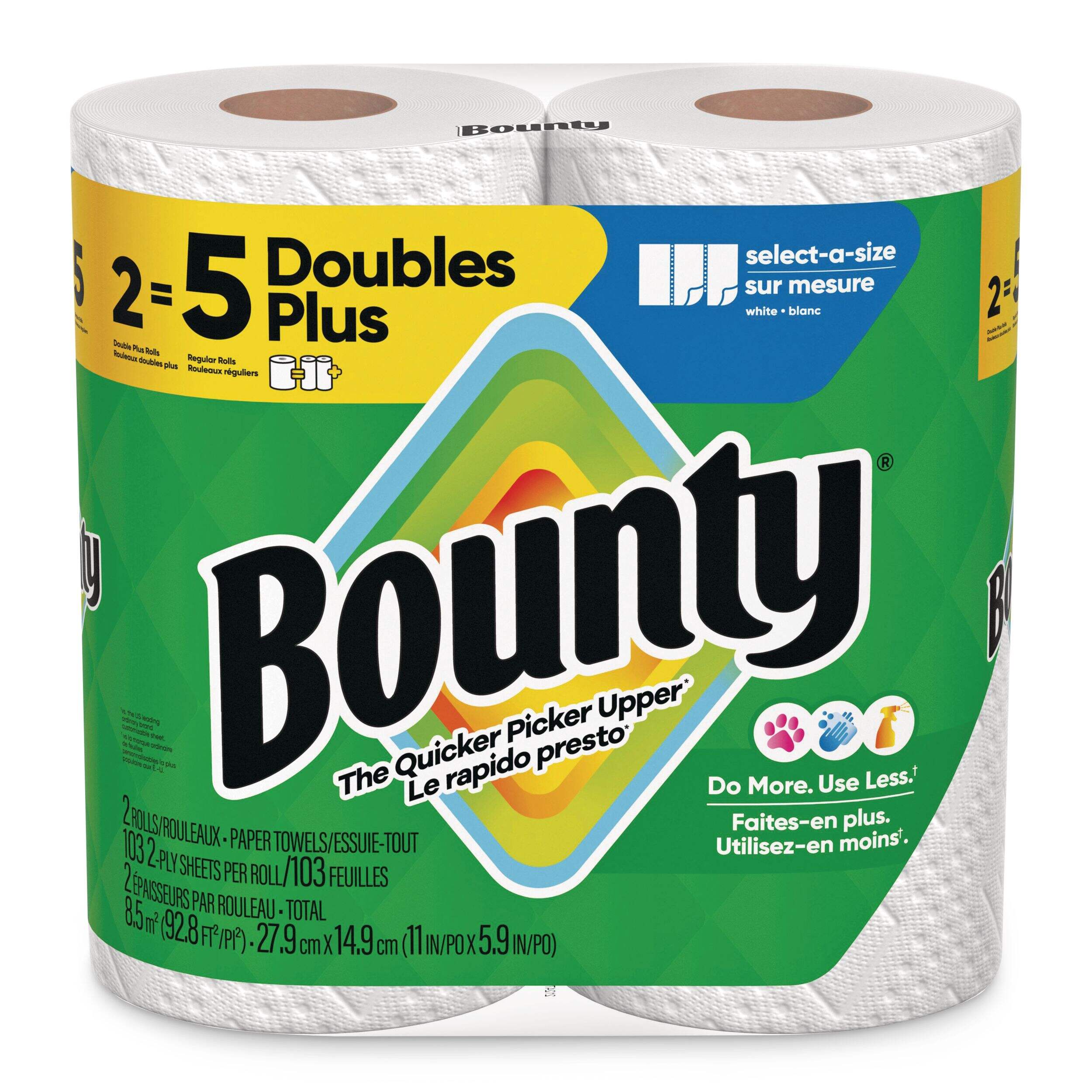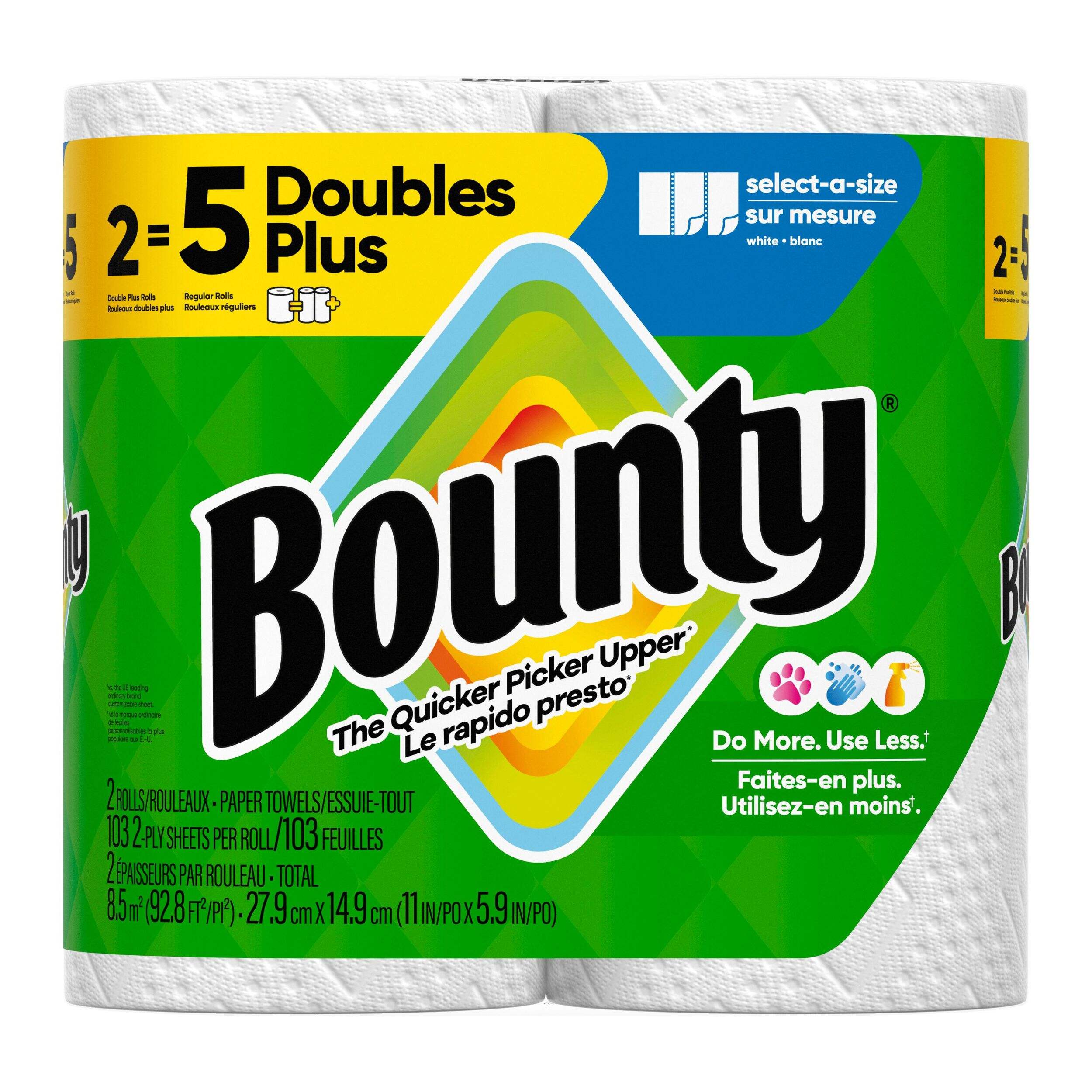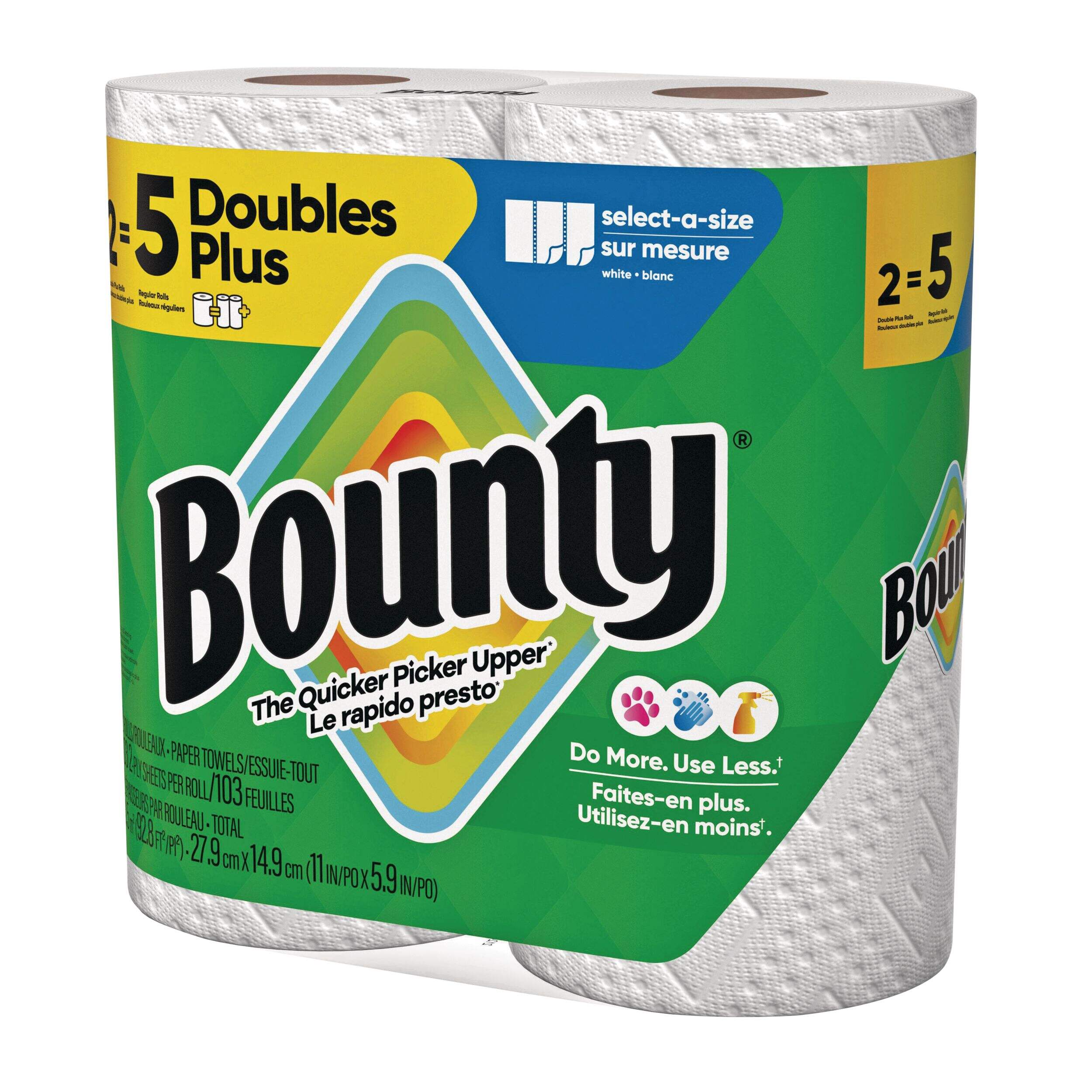 The Bounty Select-A-Size Paper Towel, Double Rolls, 2-pk, is ready to take on any mess that comes your way. The Select-A-Size Double Plus format lets you easily choose the right amount of absorbency for different kinds of spills. A single Bounty sheet soaks up liquid fast so you can move on to the next task. The strong, durable paper blend stands up to the toughest jobs without ripping or falling apart, even when completely saturated. Excellent for busy kitchens and households, Bounty Select-A-Size paper towels handle all cleaning tasks while saving you money.