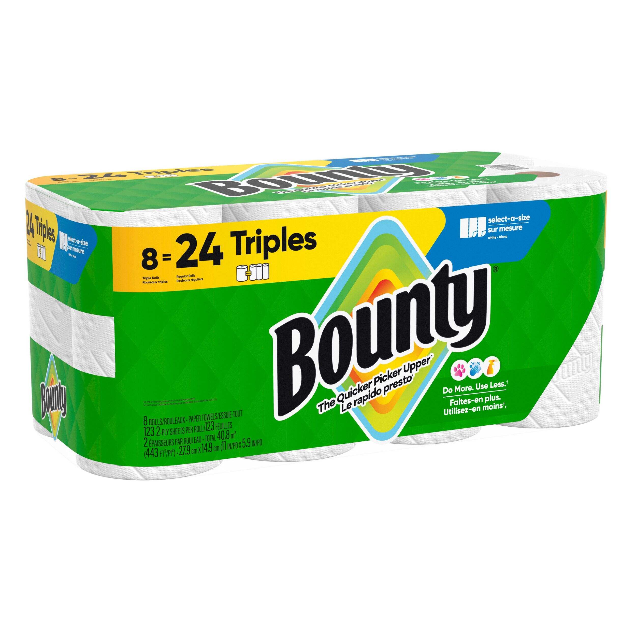 Contains 8 Triple Rolls of white Bounty Select-A-Size Paper Towels