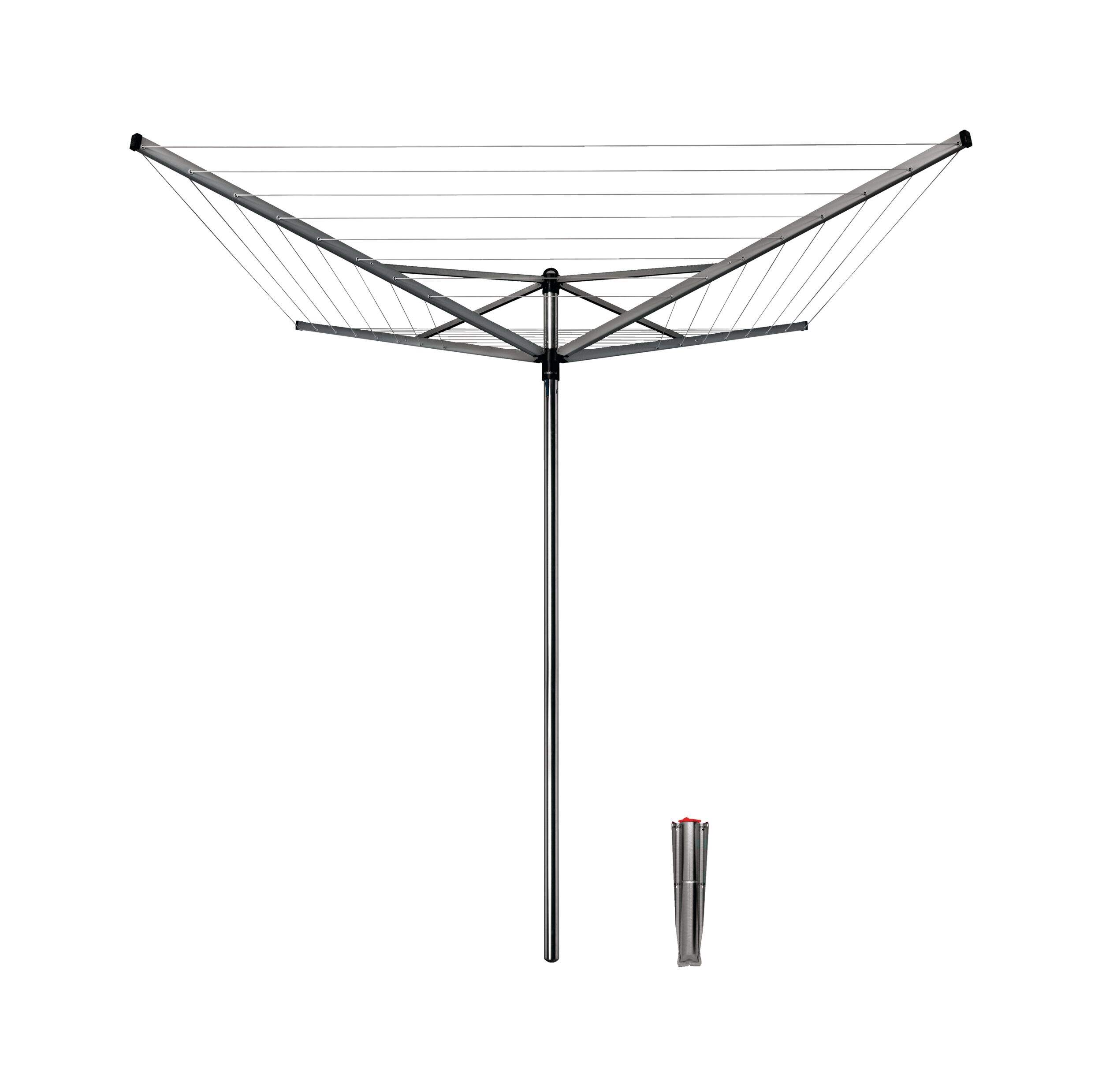 The Brabantia Topspinner Rotary Dryer is easy to use with its simple "Umbrella" system for opening and closing. Its UV-resistant drying lines feature a non-slip design, and the 3-way adjustable tension keeps the lines tight at all times. For easy storage, it comes with a sturdy hanging loop. This durable, weather-resistant rotary dryer is perfect for outdoor use, making drying clothes simple, efficient, and convenient.