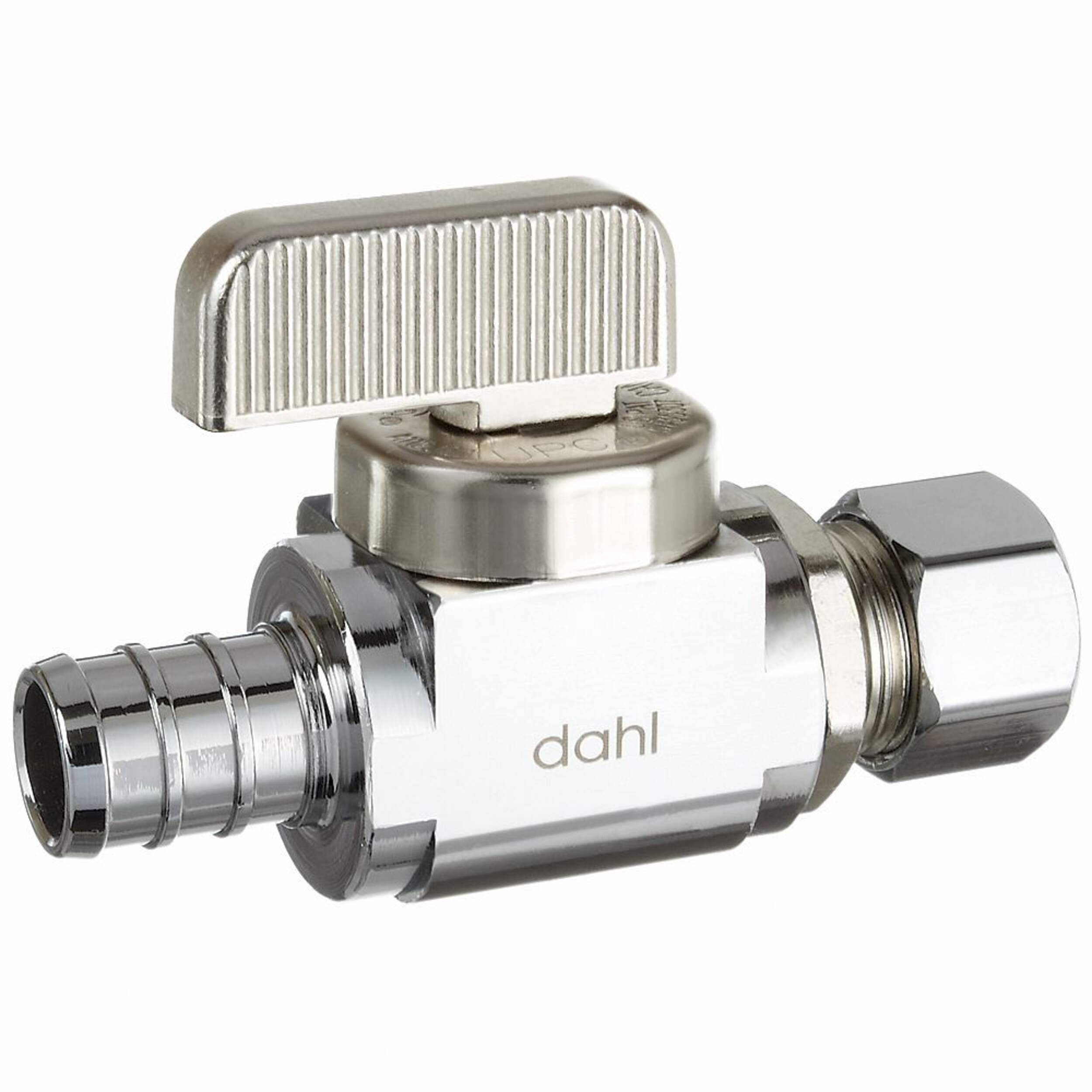 BrassCraft 1/2 in. Nom Crimp Barb for PEX Inlet x 3/8 in. OD Compression Outlet 1/4-Turn Straight Valve controls water flow to household plumbing fixtures – faucets, toilets, dishwashers, icemakers, washing machines, etc. The straight valve is most often used where the water pipe enters the room from the floor. With a 90 degree turn of the valve handle, you are able to stop the flow of water leading to the plumbing fixture, allowing for maintenance and repair without shutting off the water to the entire home. Machined one-piece brass body provides strength, durability and long-lasting performance 1/2 in. Nom Crimp Barb Inlet x 3/8 in. OD Comp Outlet Compatible with PEX tubing For use in potable water distribution systems. Not intended for recirculating water systems that produce continuous use temperatures above 115° F. For those applications, use our KT™ series ball stops. One-piece shut-off mechanism provides smooth on-off operation without freeze-ups even after long periods of non-use Easy-to-remove handle protects against accidental operation during rough-ins Corrosion-resistant handle is plated in an attractive chrome finish Chrome and Brass finish 100% leak tested to ensure reliable, leak-free performance For indoor use Temperature rating: 40° to 160°F Pressure rating: 125 psi maximum Designed, machined and assembled in the USA