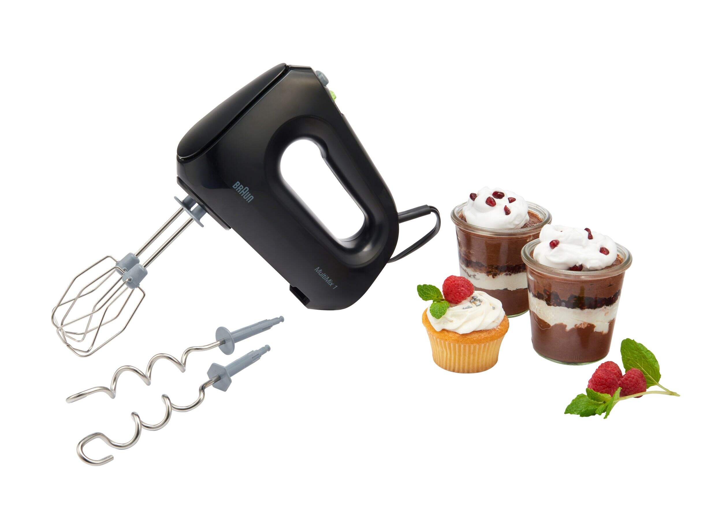 Enjoy easy baking with the new MultiMix 1 Hand Mixer. Fast and easy preparation for all your favorite baked goods with the silent 200W motor. Mix with the MultiWhisk Beater, a unique Braun design for faster whisking or use the dough hook accessory for thick doughs and breads. Choose from 5 different speeds for precise mixing results with a mixer that is designed for comfort and flexibility to let you enjoy the baking process.
