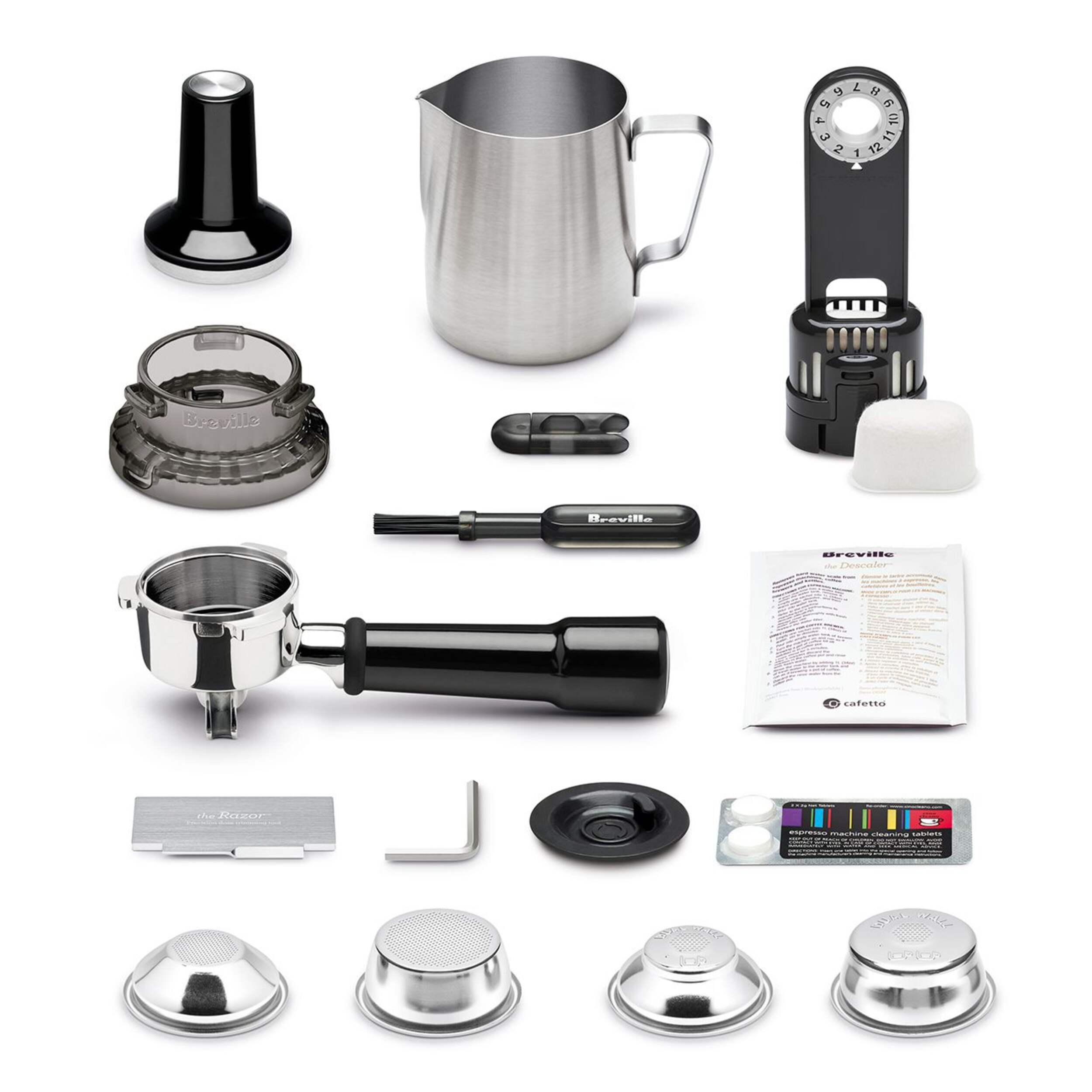 Accessories included: Razor dose trimming tool, 54mm Stainless Steel Portafilter, 1 cup and 2 cup Single and Dual wall filter baskets, Coffee scoop, Integrated Tamper, Stainless Steel Milk Jug, Cleaning disc and tablets, cleaning brush, Tool and Allen Key, Water filter holder and water filter