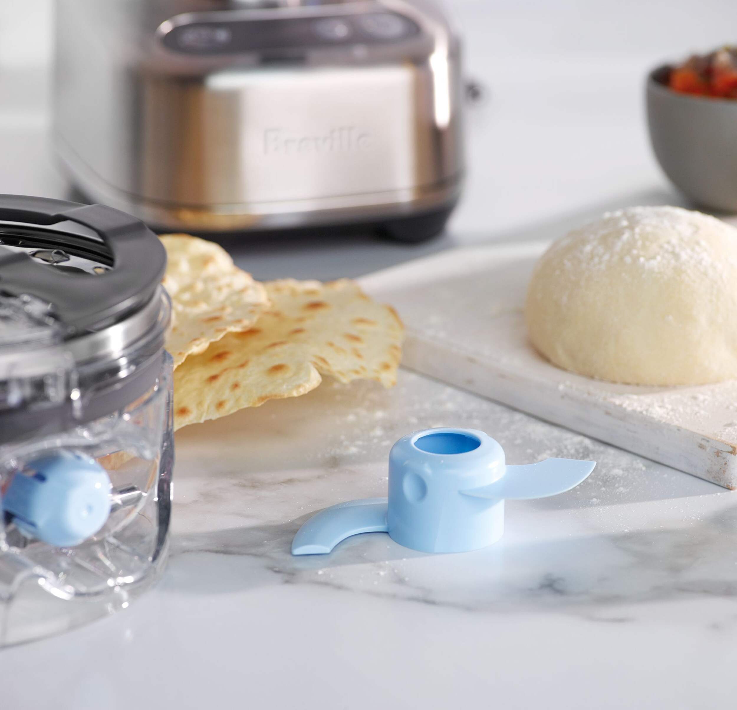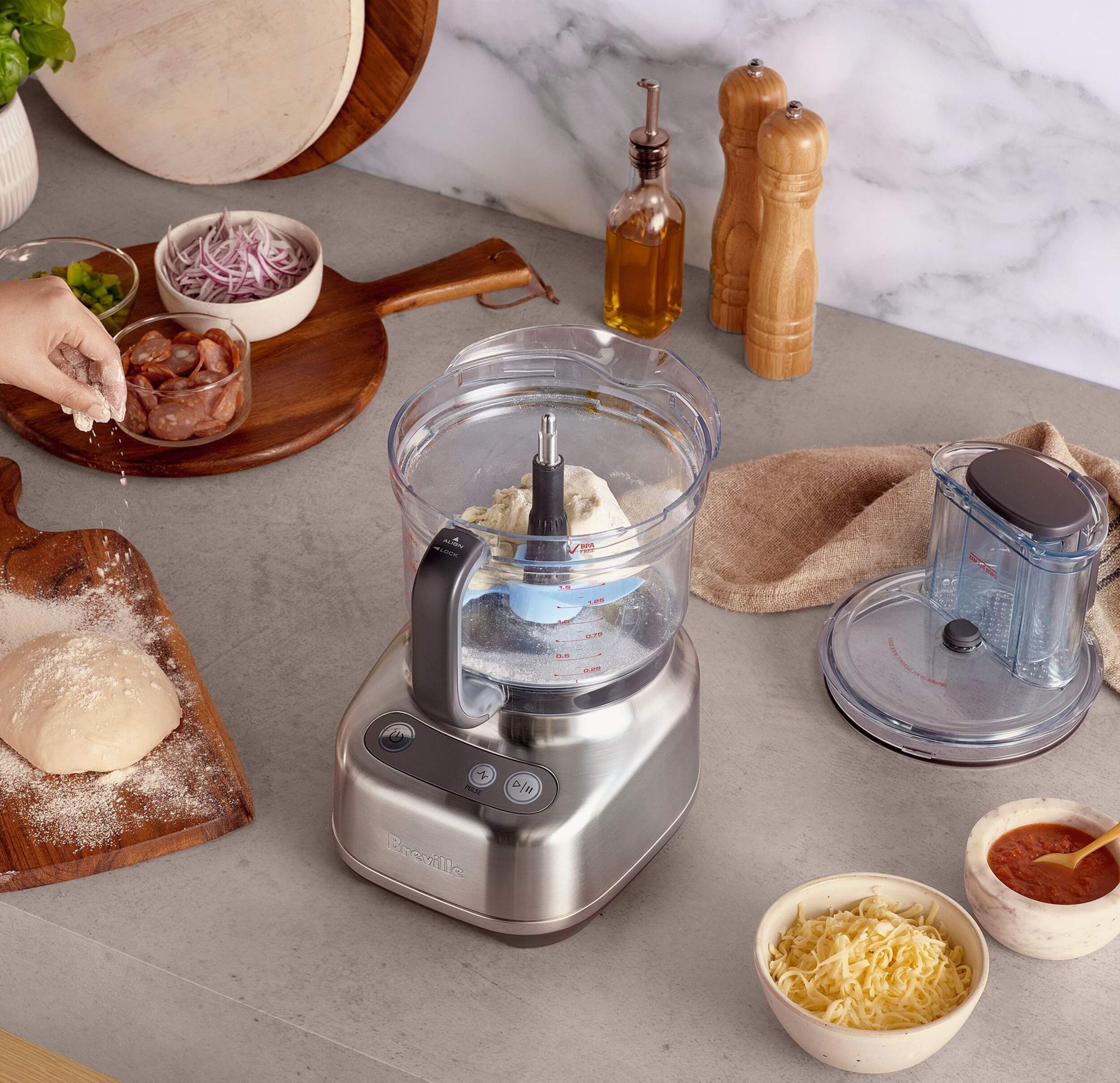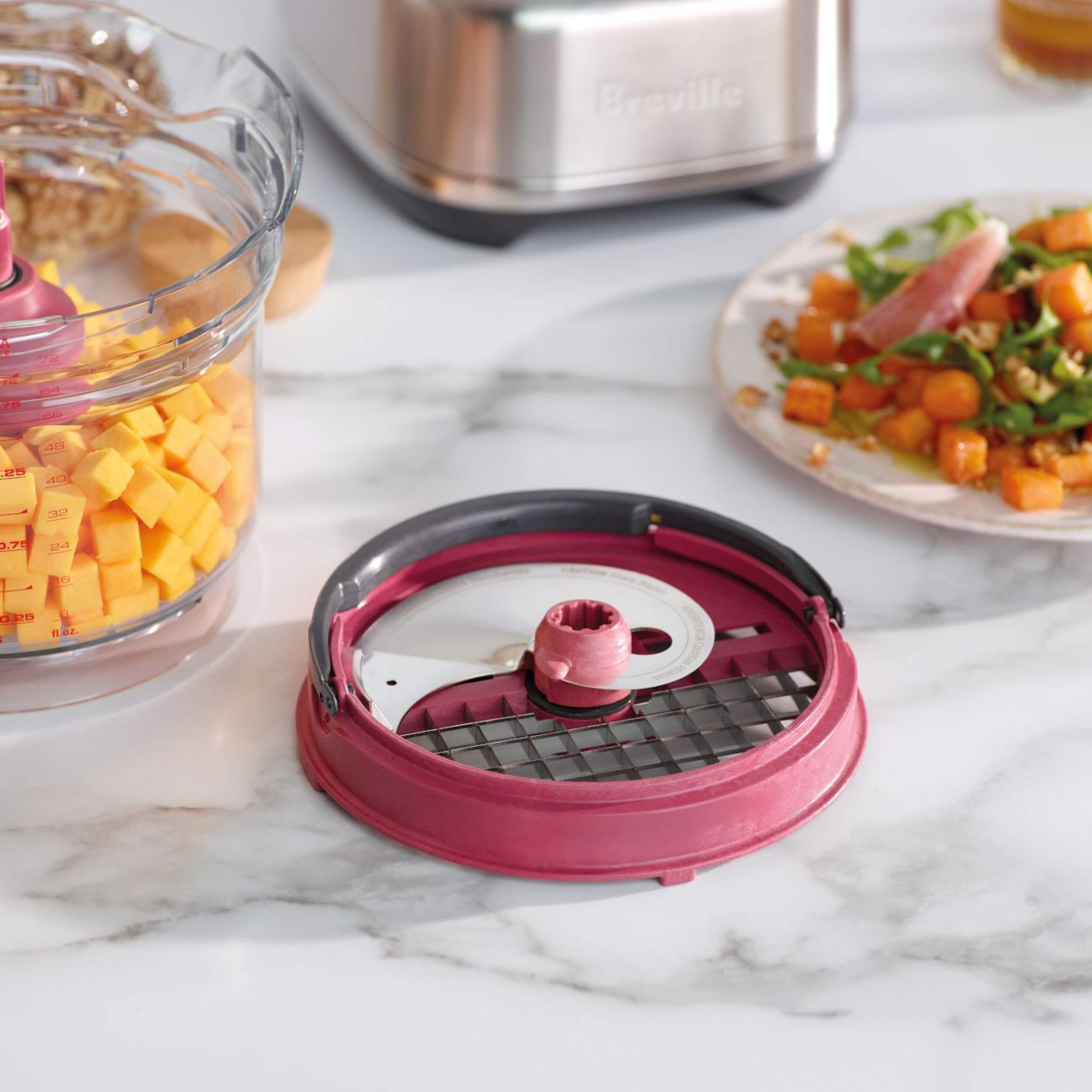 The integrated storage caddy is simple to use and houses the dicing kit, S-blade, reversible shredder, adjustable slicer and dough blade
