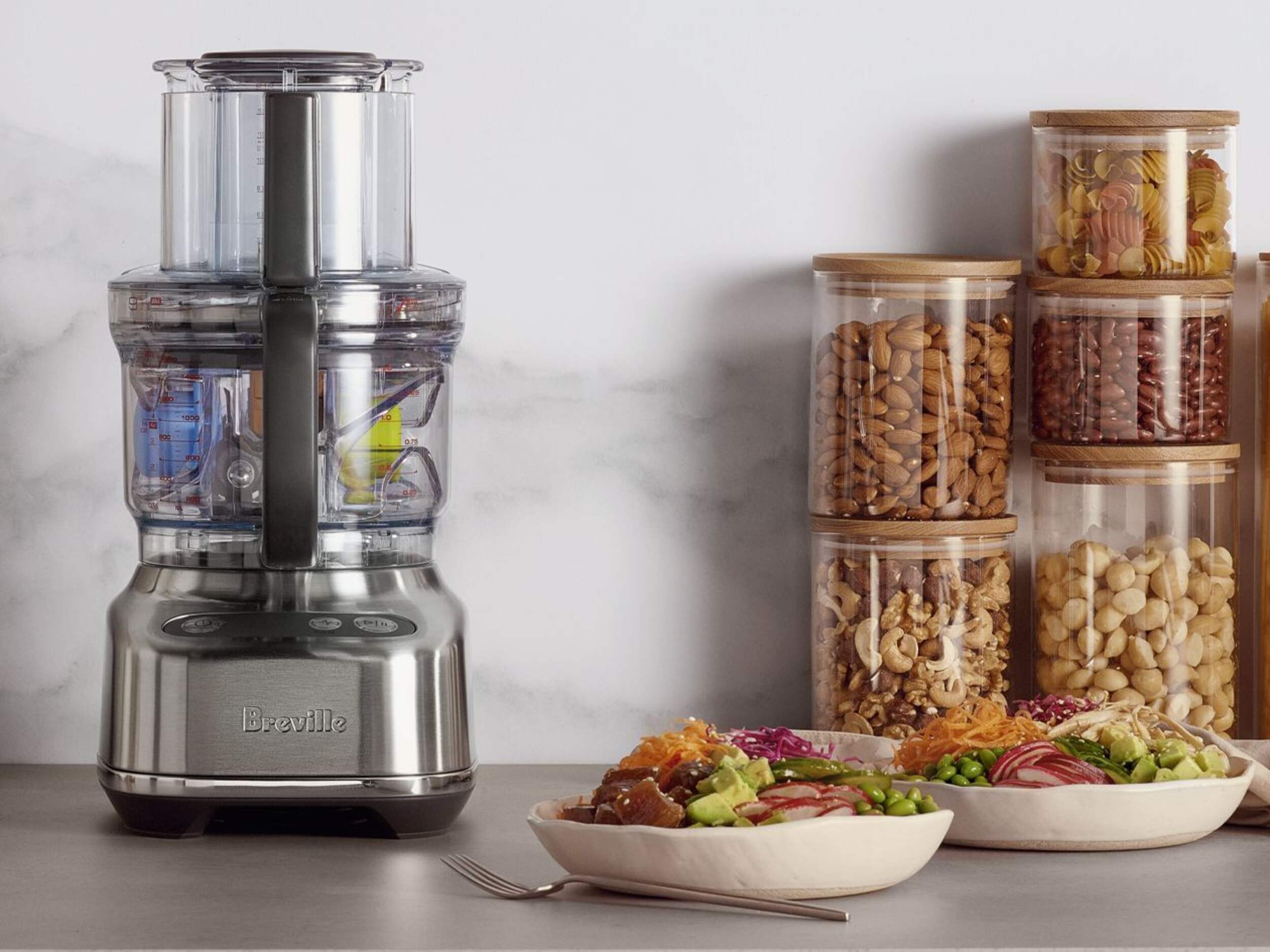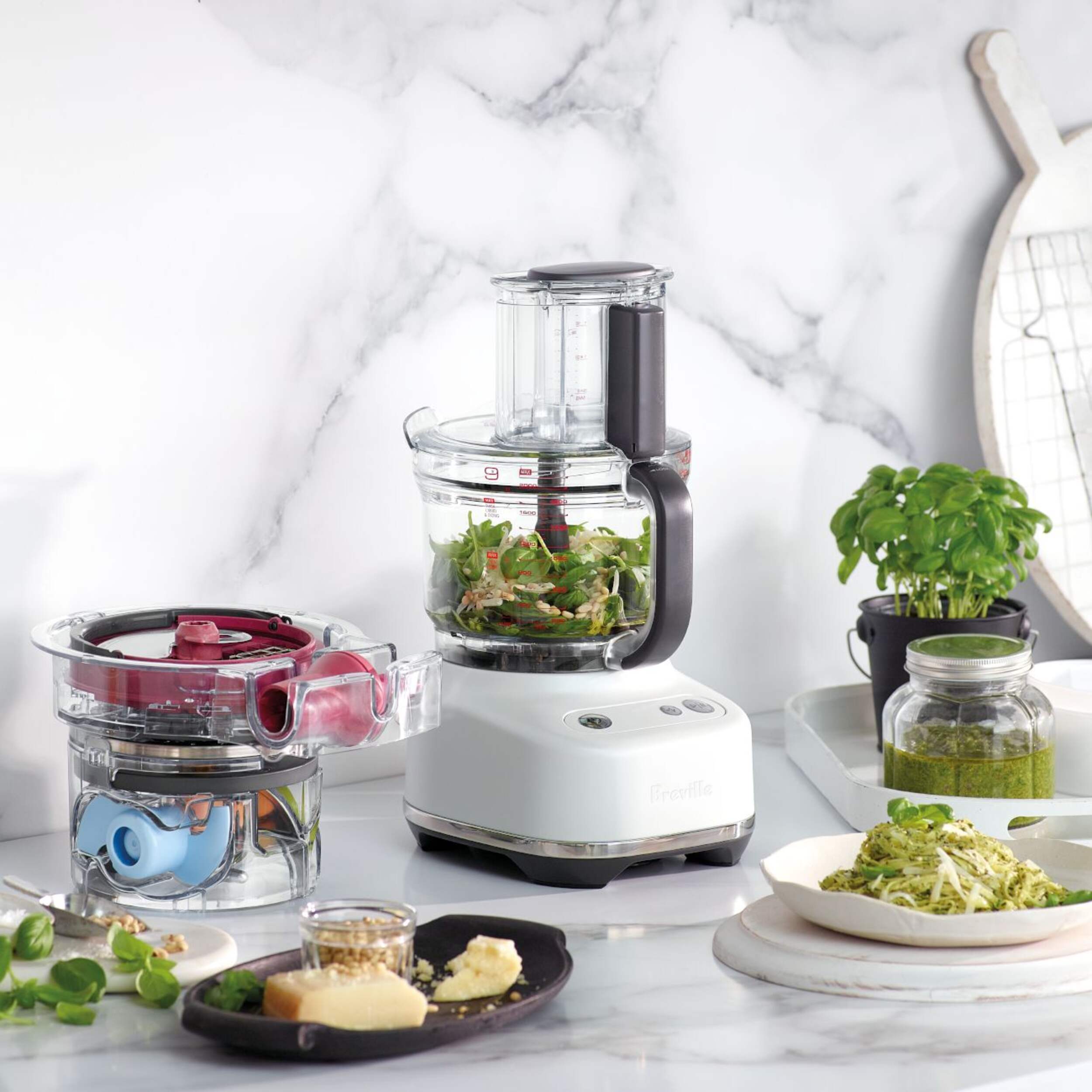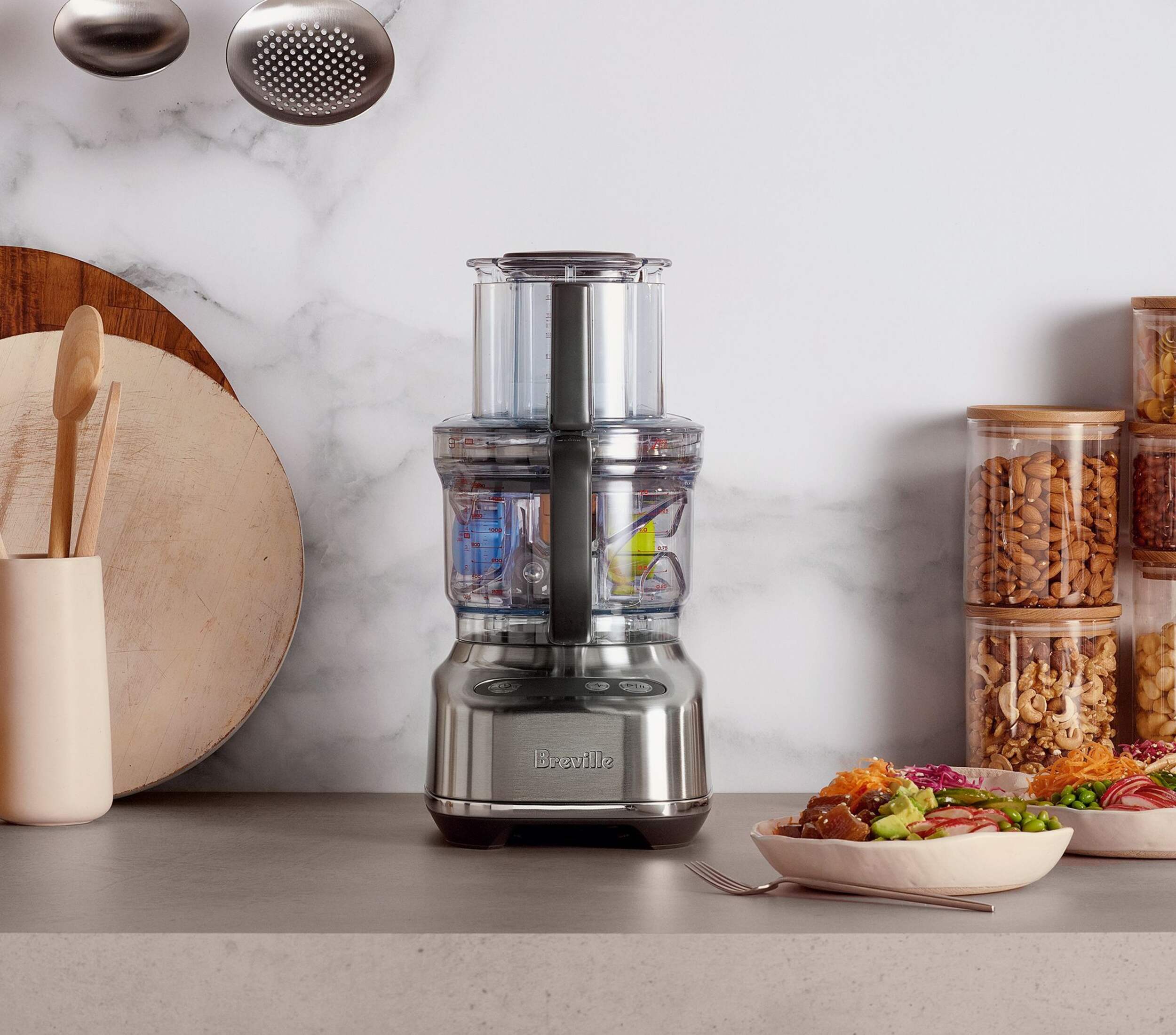 The integrated storage caddy is simple to use and houses the dicing kit, S-blade, reversible shredder, adjustable slicer and dough blade