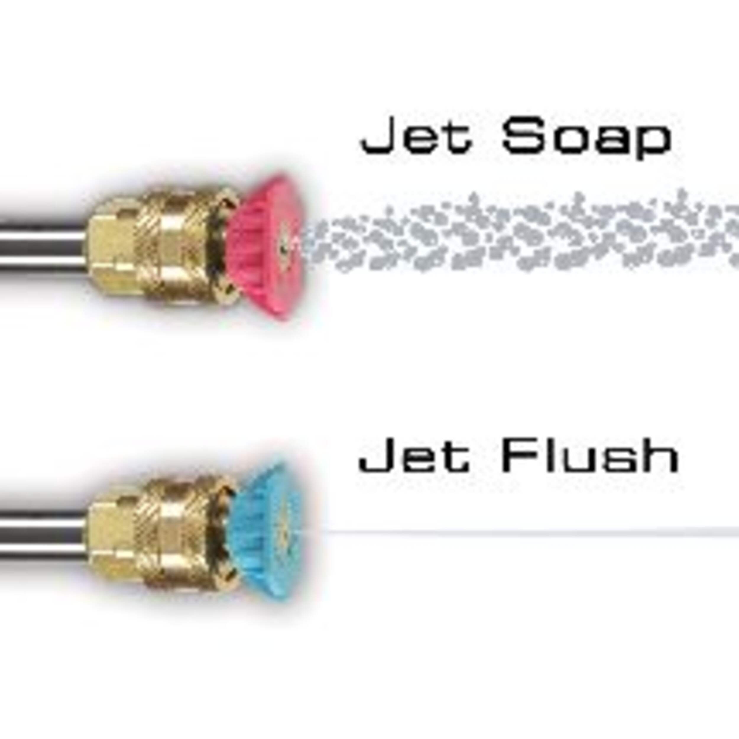 Jet soap nozzle carries detergent to peaks and hard to reach areas, and achieves longer reach soap application over standard low pressure tip