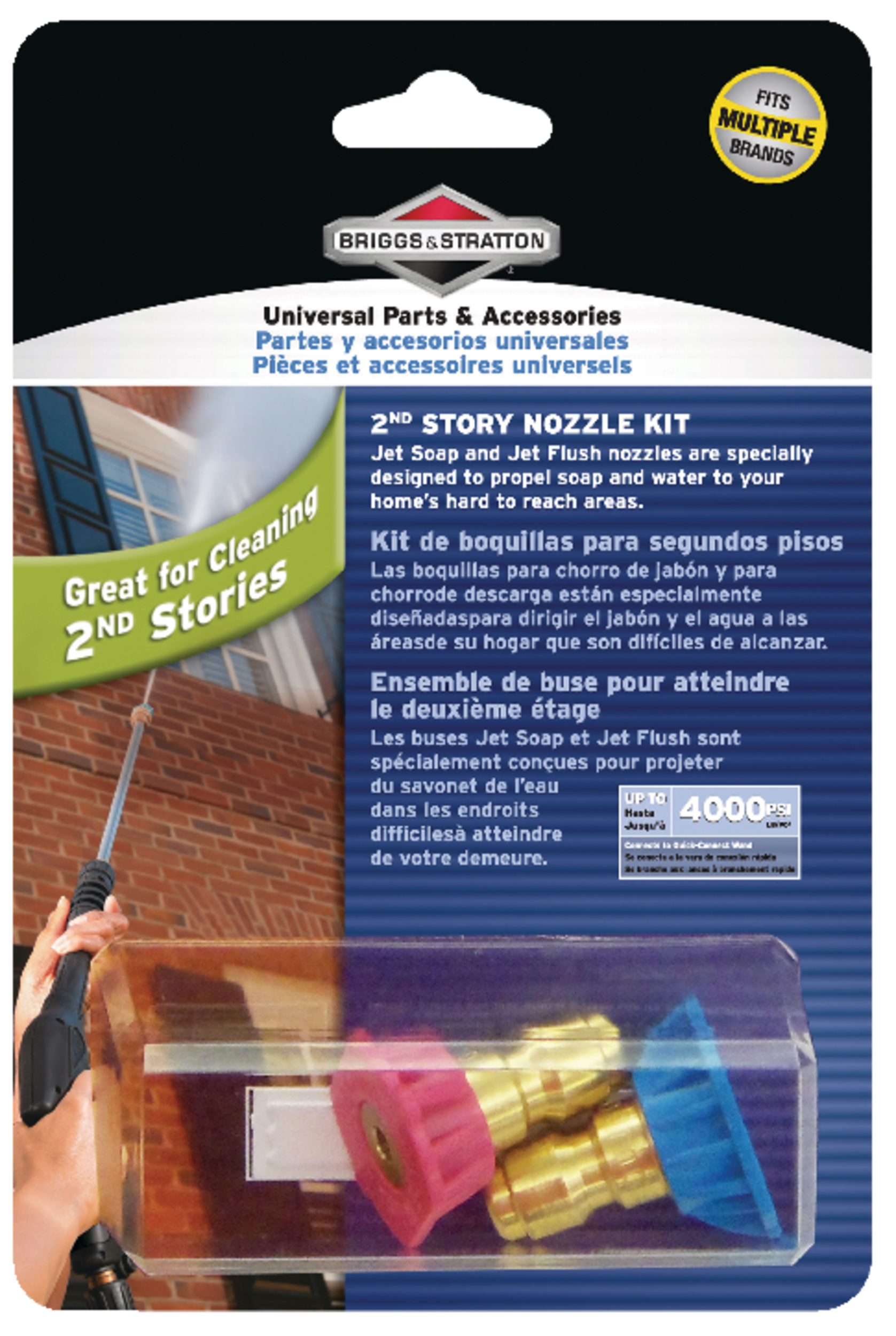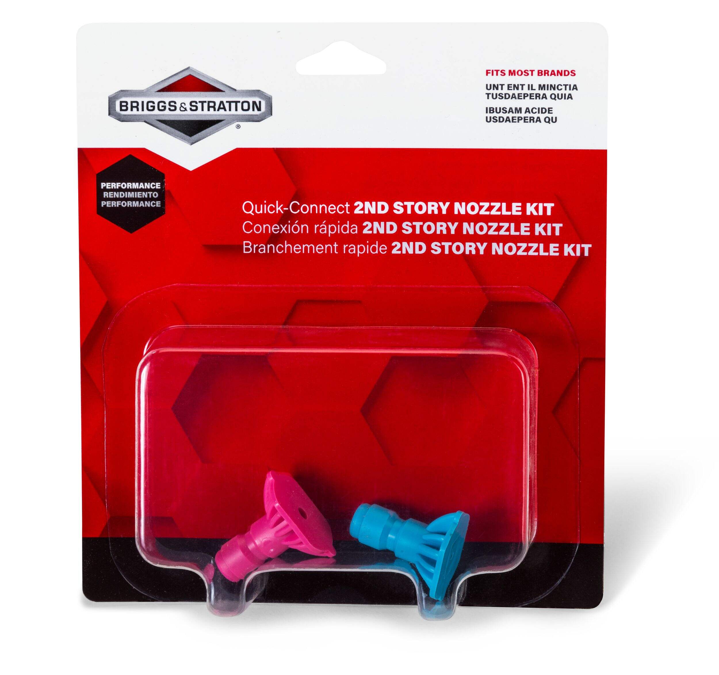 The Briggs & Stratton Second Story Nozzle Kit lets you clean those hard to reach areas in your home. The kit includes 2 tips. The Pink tip is the jet soap tip for propelling soap. The Blue tip is the Jet flush tip for rinsing away soap and blasting away debris.