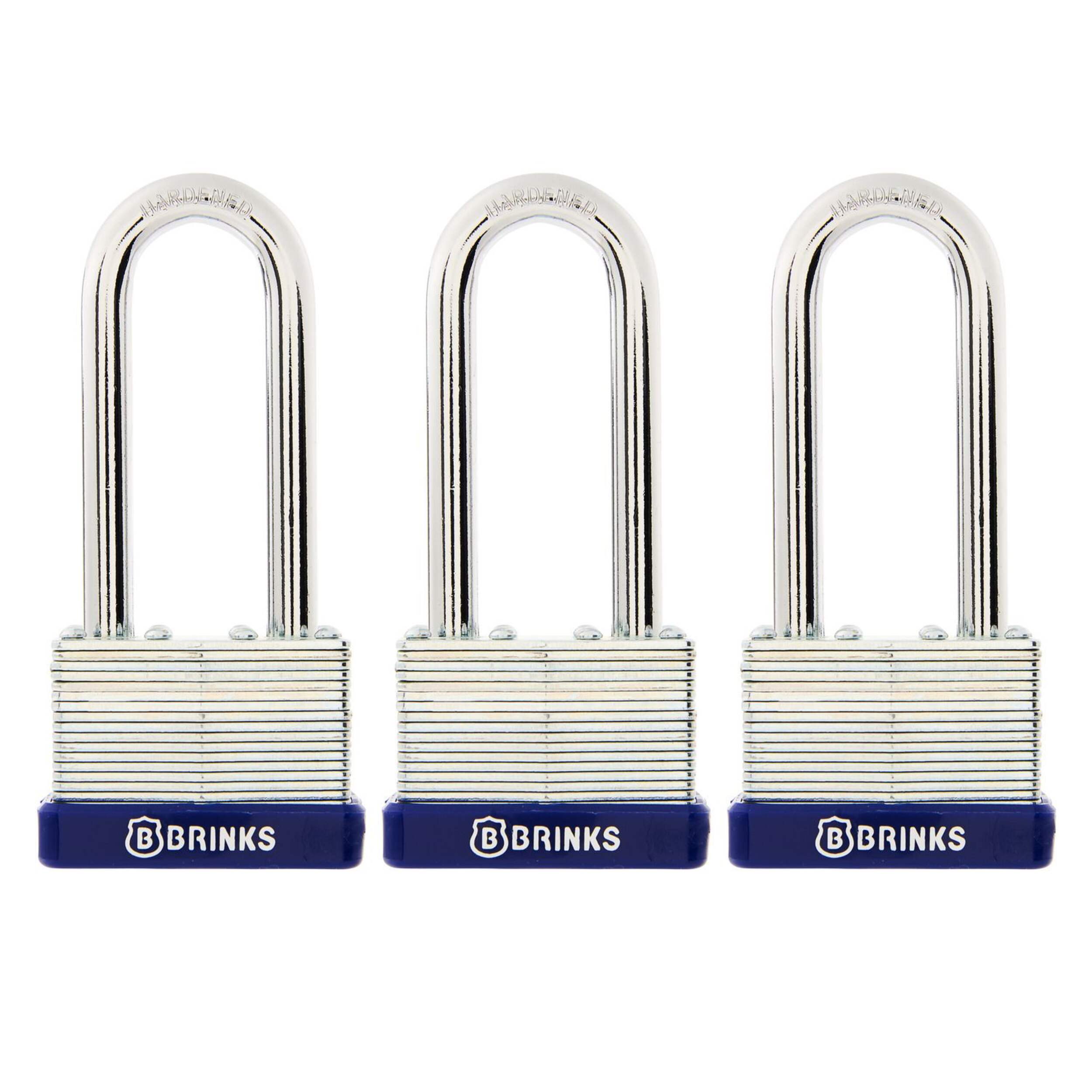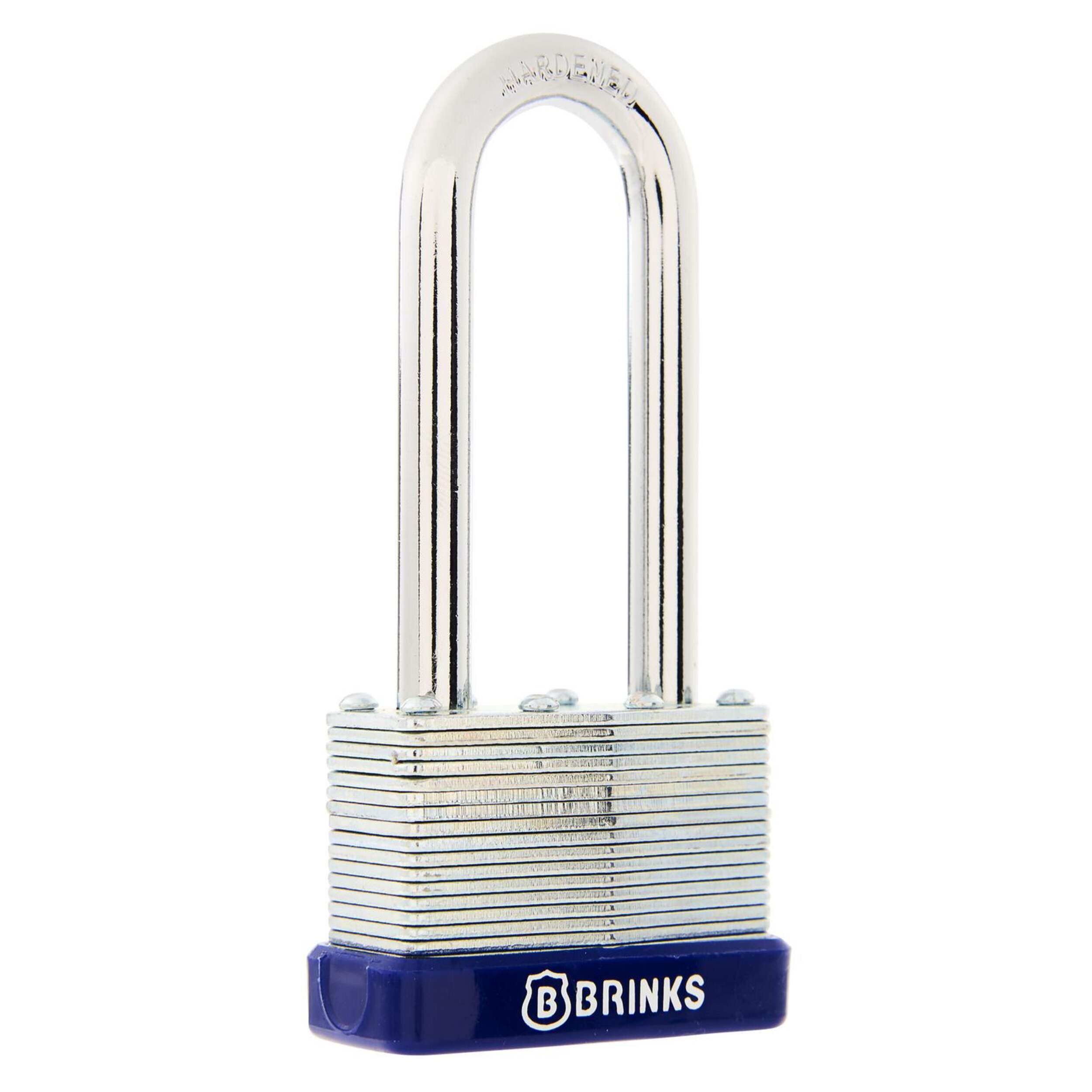 Brink’s Laminated Steel Padlock features a 44mm body and a chrome plated, hardened steel shackle for increased cut resistance. The padlock is designed with a four brass pin cylinder to increase pick and pry resistance and dual lever locking mechanism for added security. A form-fitted plastic bumper completes the look, offering protection from marring. The padlock is perfect for indoors and outdoors and is ideal to secure storage units, chains, trailers, gates, and utility boxes.