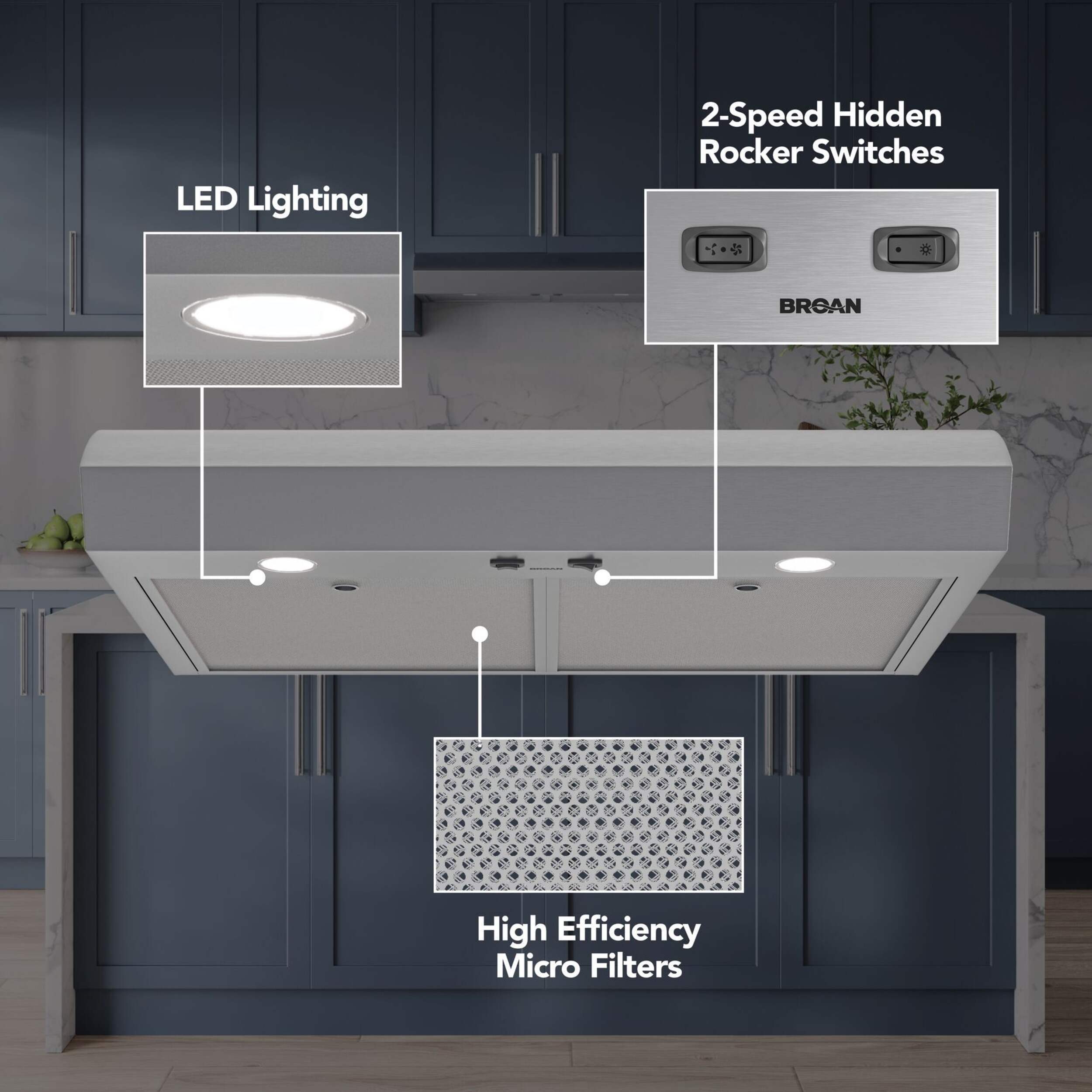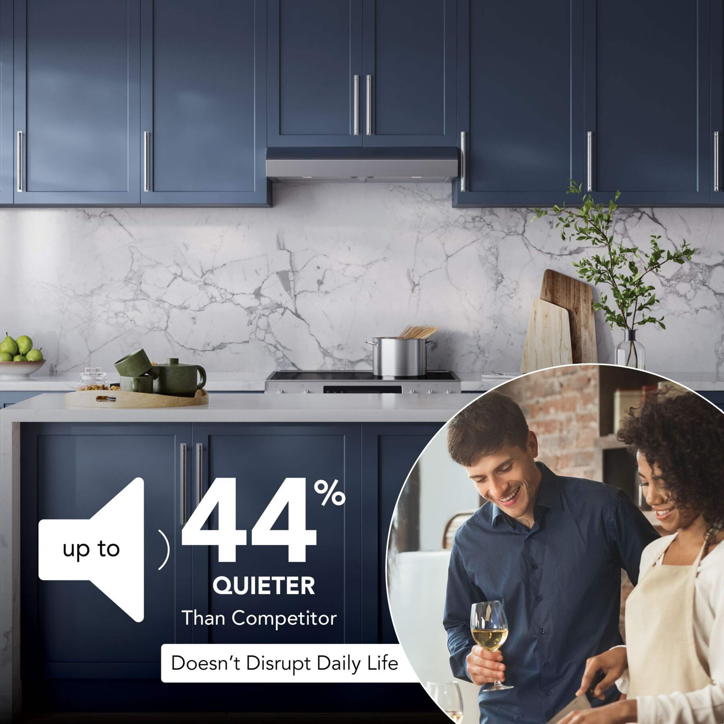 This Broan Glacier1 350CFM Under Cabinet Kitchen Exhaust Fan Range Hood is built to surpass industry standards with over 50 points of inspection, engineered as a reliable ventilation solution. The durable hood vent is up to 20% more effective at removing pollutants than the leading competitor with power ventilation at 350 Max Blower CFM to capture and remove smoke and odours from the kitchen. The Mantra range hood is also up to 44% quieter: 1.5 sones is equivalent to a refrigerator running, so it won't interfere with daily life. The EZ1 Install System allows for a quick and easy one-person installation, and the ENERGY STAR Certification is both code compliant and provides cost savings. The one-level LED lighting and two-speed hidden rocker controls make cooking a breeze.