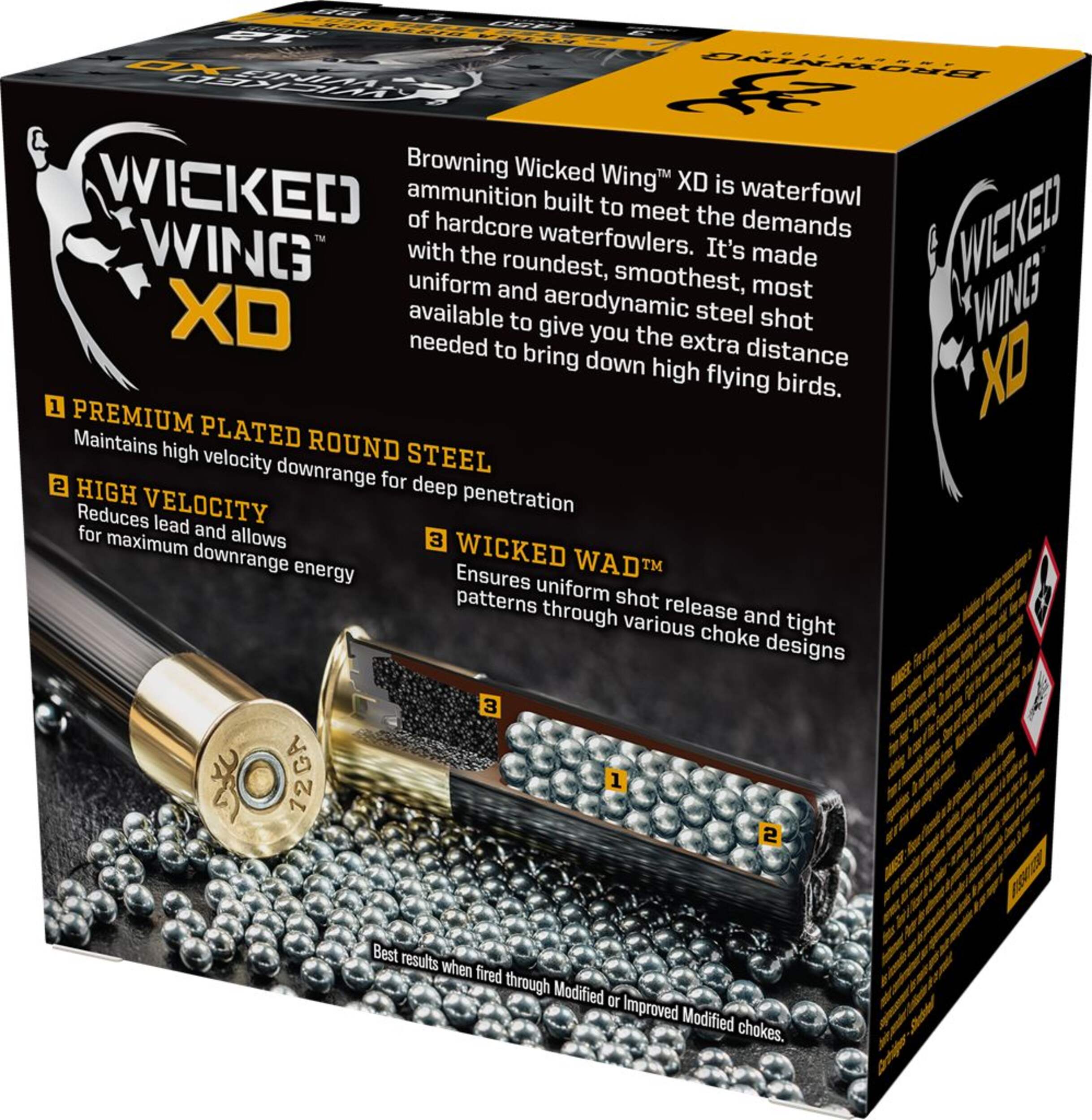 The Browning BXD Waterfowl shotgun shell ammunition delivers exceptional performance for long-range waterfowl hunting. Utilizing an optimized wad design and plated round steel shot, these 1-1/4 ounce shells are launched at high velocity to retain energy, penetrate and deliver a dense pattern over extended distances critical to achieving effective long-range performance. Whether you're after geese at extreme ranges or diving ducks, these dependable 12 gauge Winchester ammunition gives you the knockout power you need to put more birds in the bag.