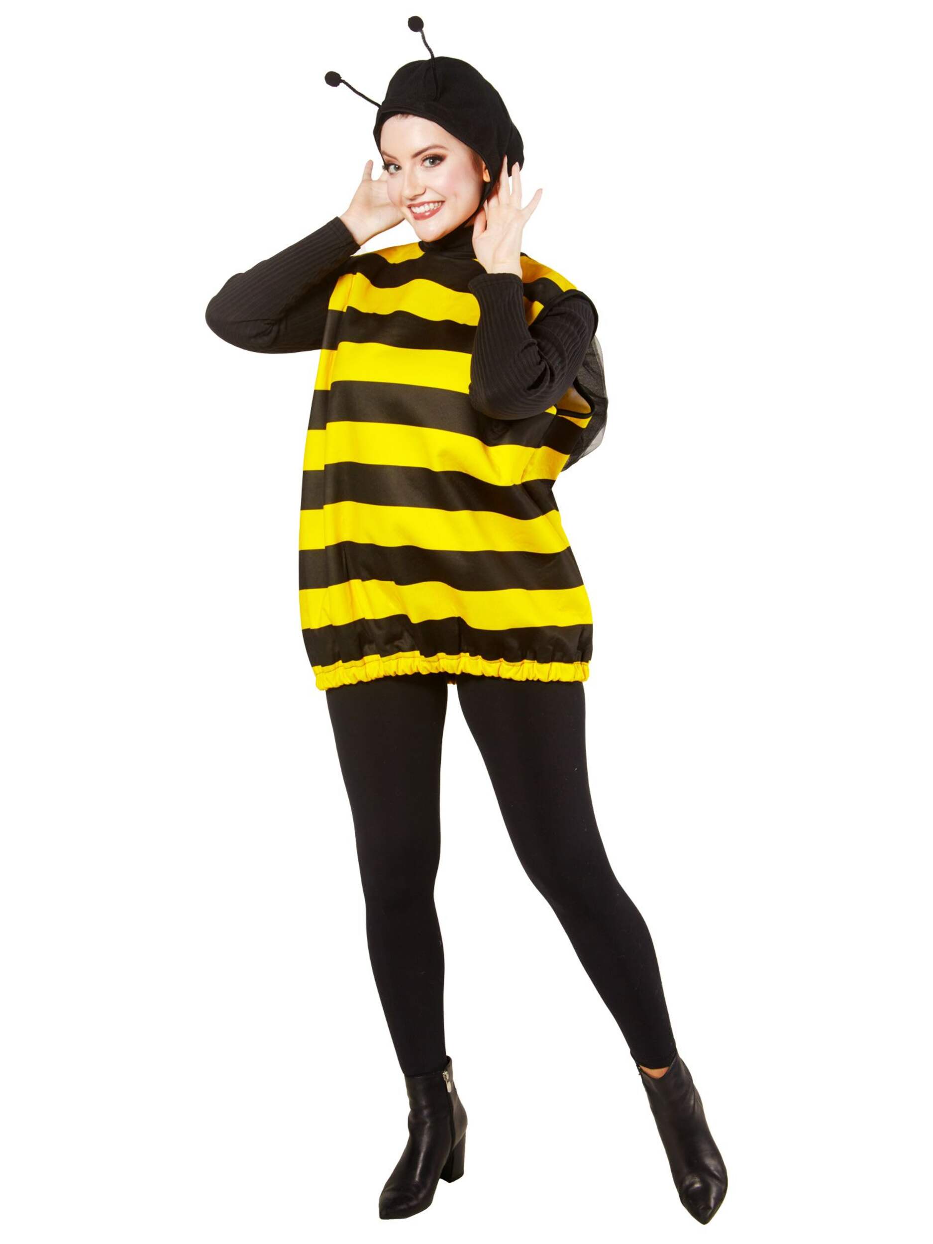 Transform into a charming bumblebee with this delightful adult costume. Featuring a striped yellow and black tunic, this outfit is perfect for making a memorable entrance at any event. The included antennae headband and attached wings add a playful touch to your ensemble.