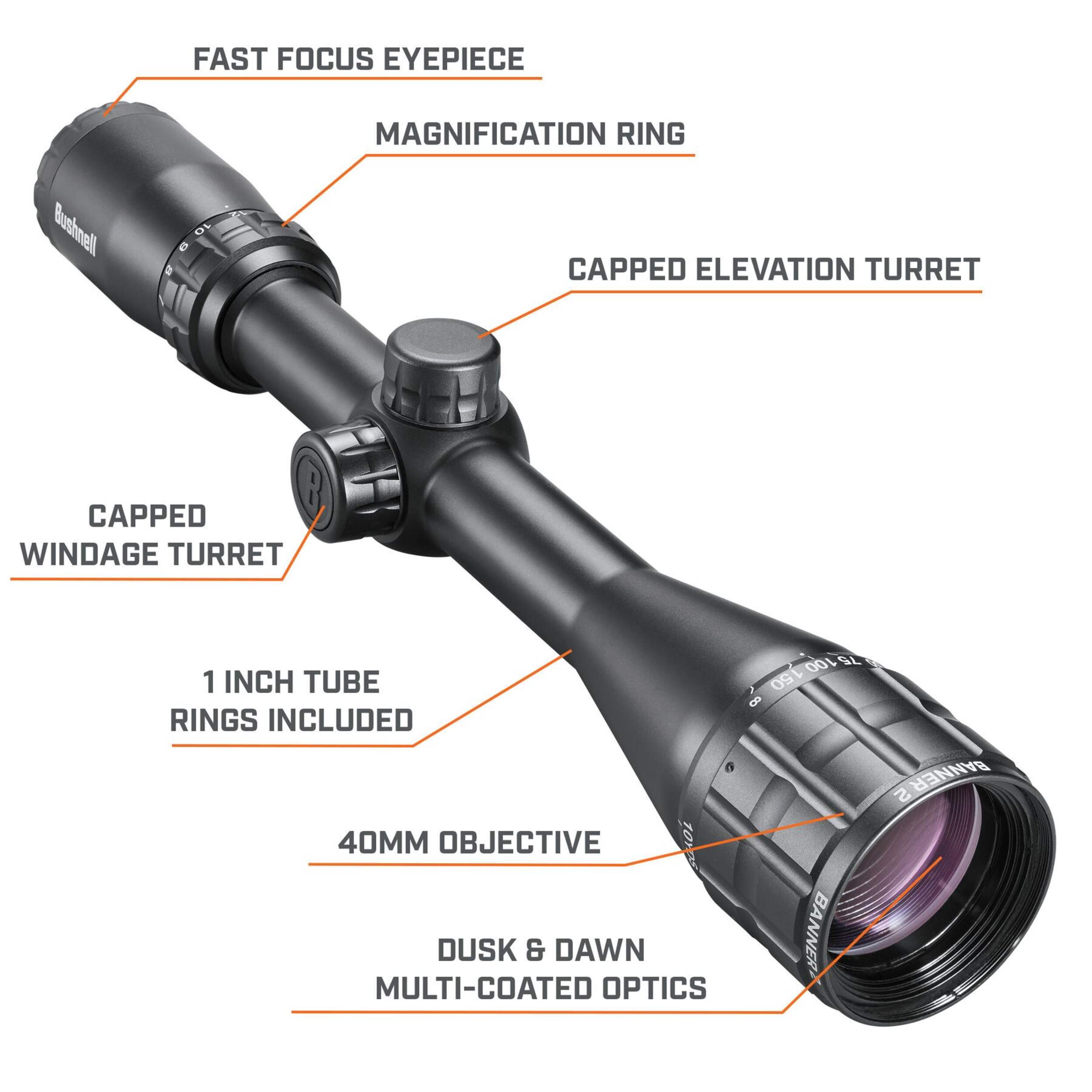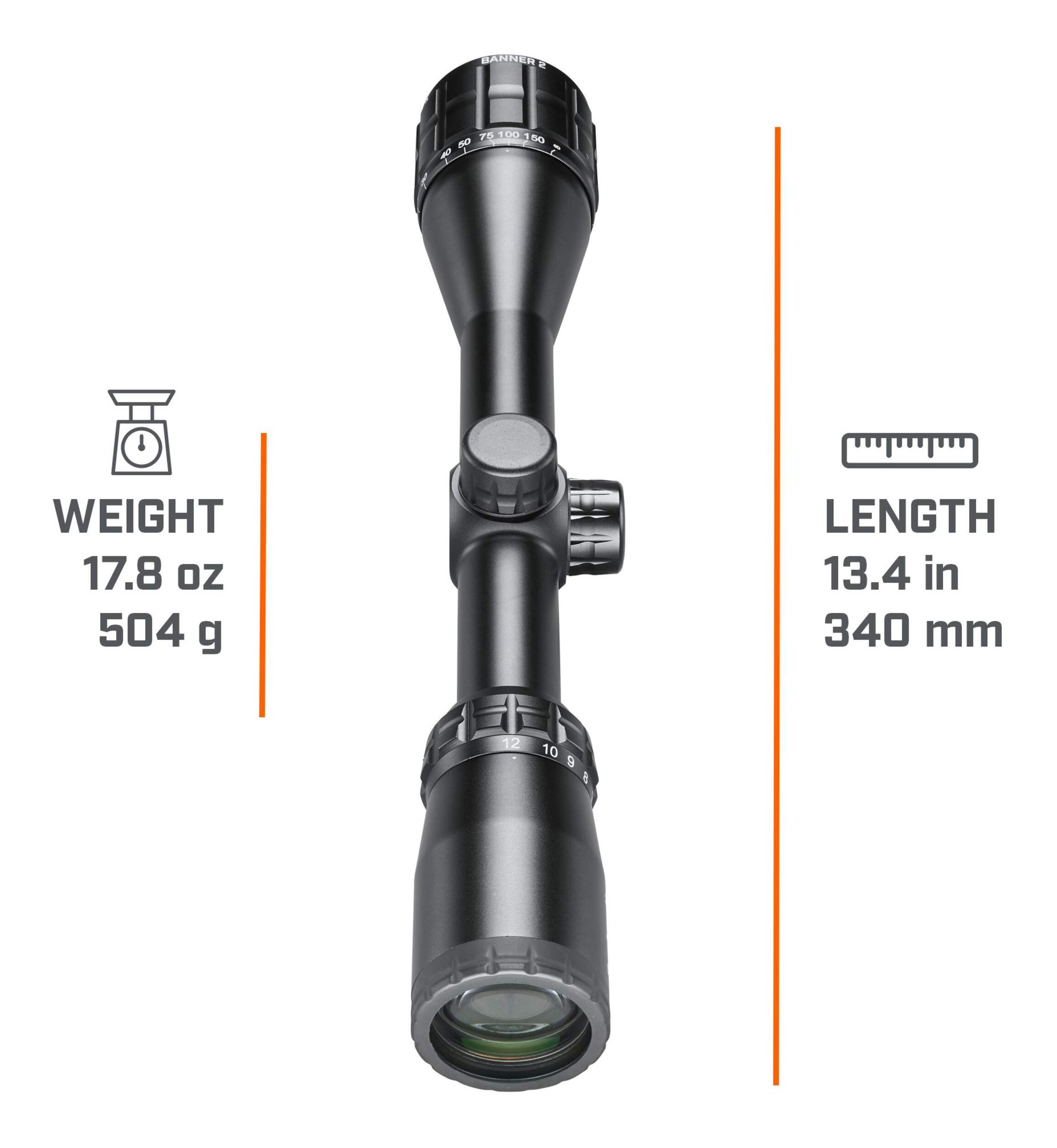 The new Banner 2 4-12x40 riflescope is a configuration that offers a little more reach than a 3-9x40 and comes with the added benefit of an adjustable objective parallax adjustment for perfect focus from 10 yards out to infinity.