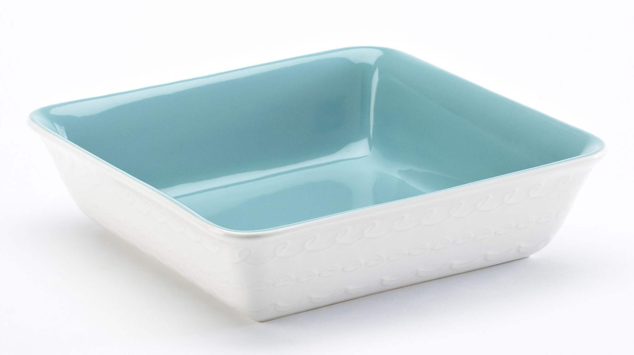 Features icing-like flourishes around the outside rim and colourful blue interior
