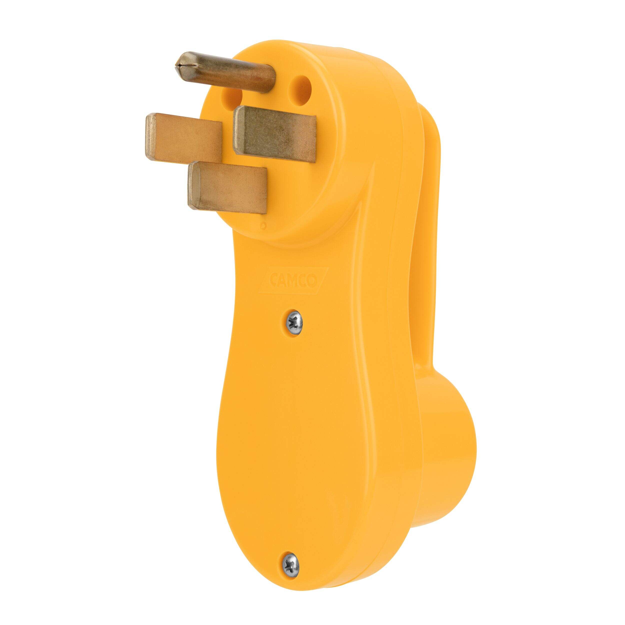 The Camco PowerGrip RV Offset Adaptor, 50AM/30AF, connects RV power with a compact design for easy storage. This 50A male to 30A female adaptor features an ergonomic handle for safe and easy operation. The smaller size is perfect for tucking away when not in use, while the sturdy handle ensures you can securely connect your RV to power sources. Designed for RVs, this Camco adaptor conveniently adapts the size of power sources to fit your power inlet.