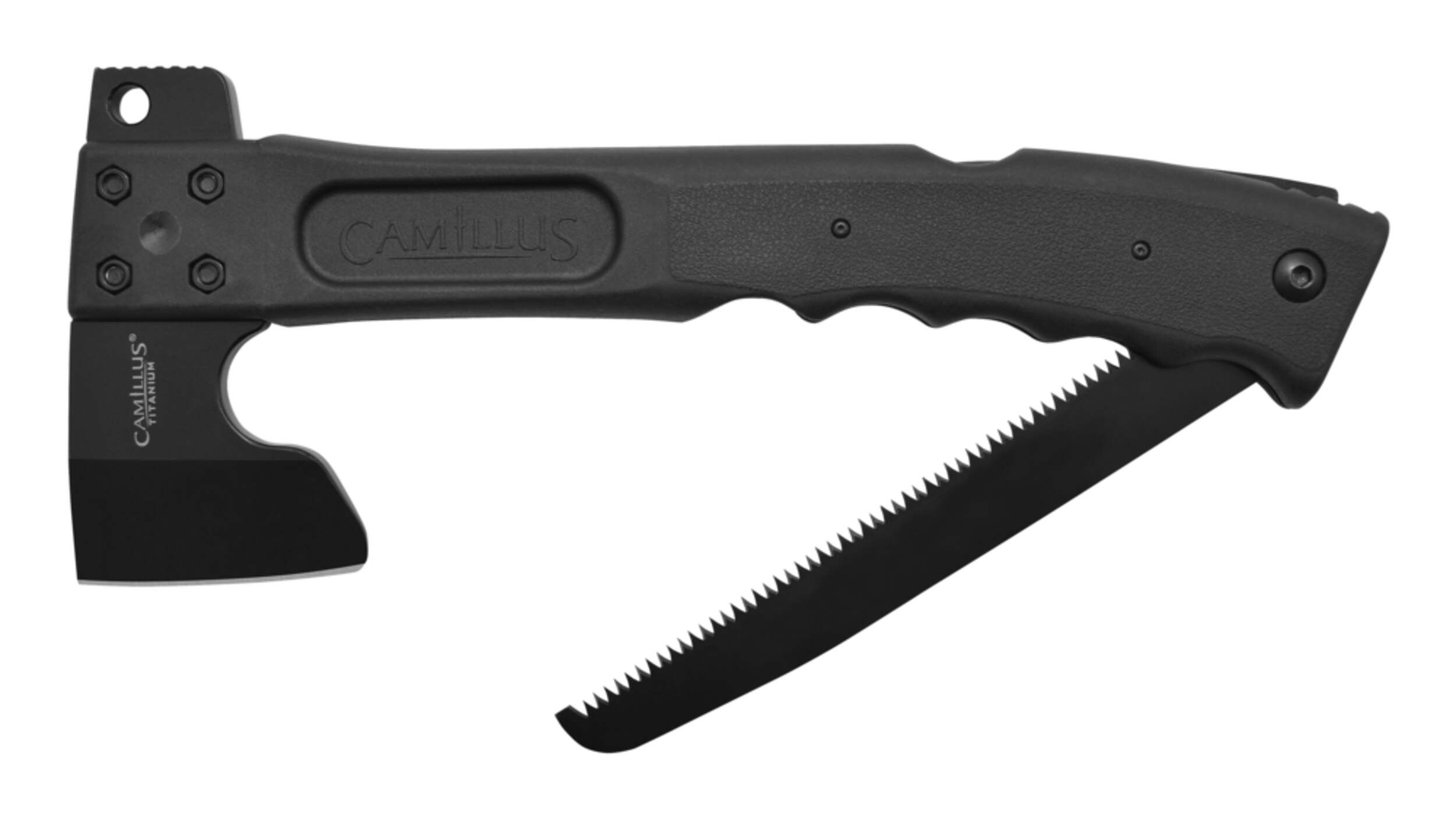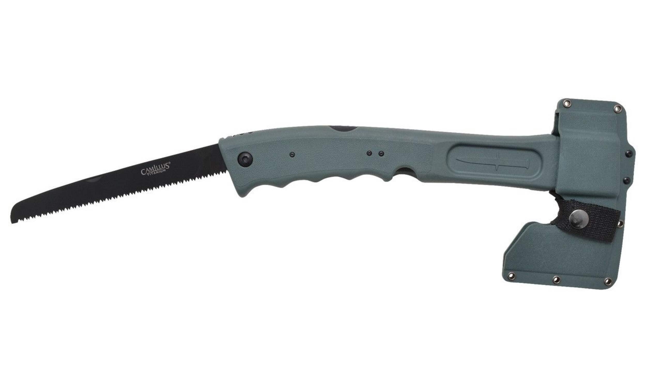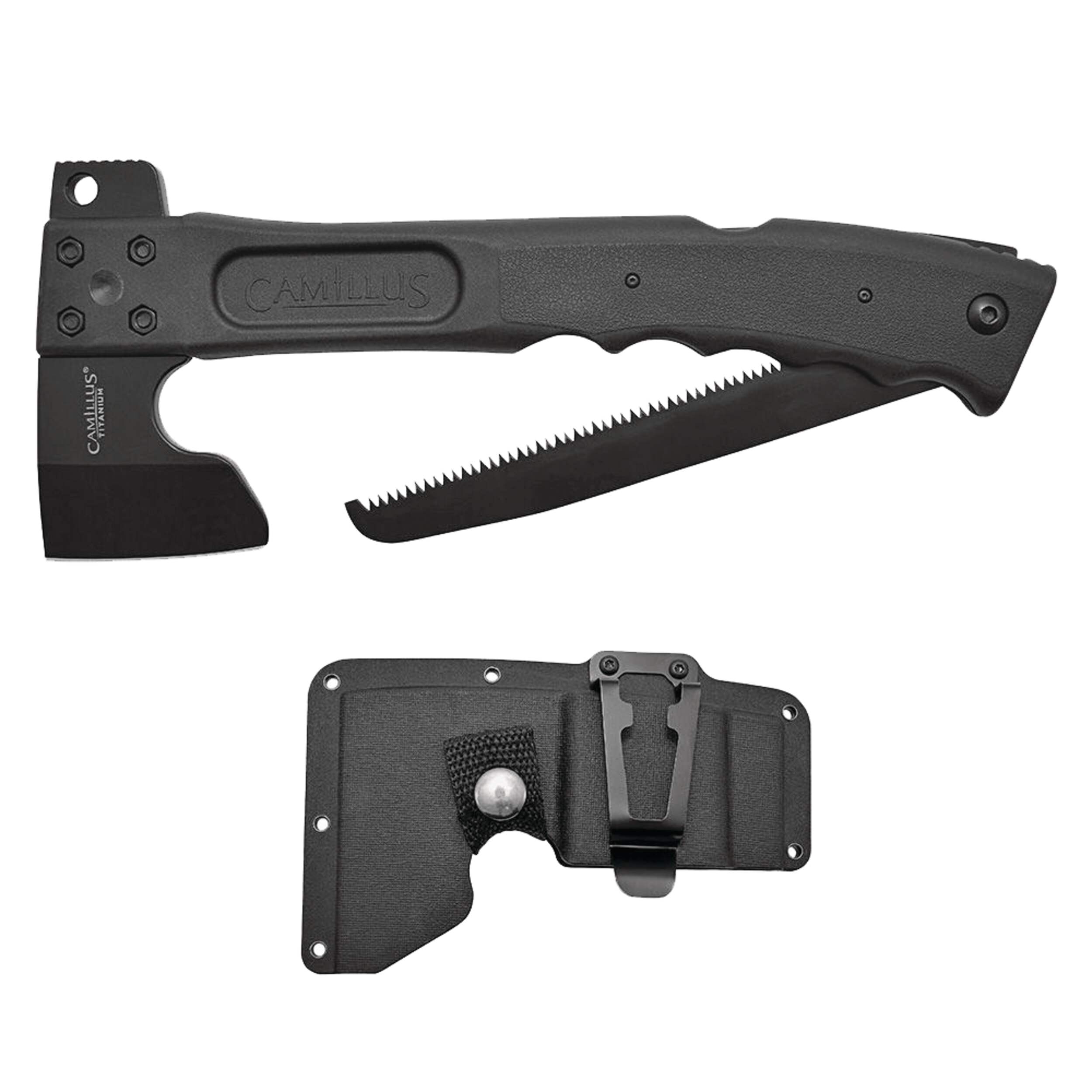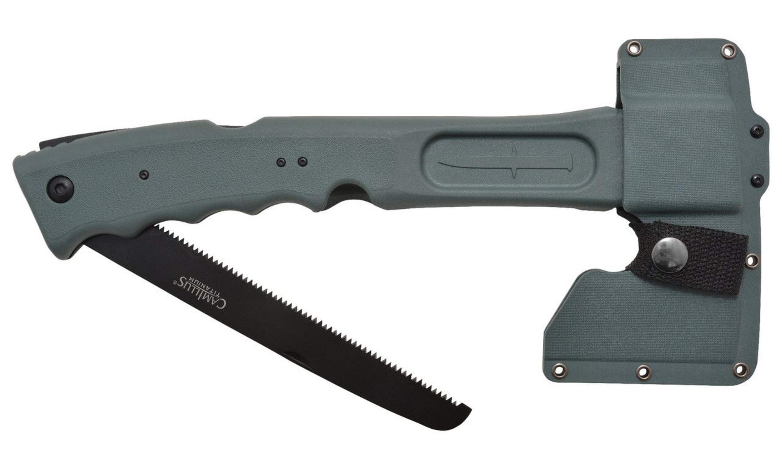 Features a 3" (7.62 cm) titanium stainless steel hatchet blade, 7" (17.78 cm) lock back folding saw and hammer