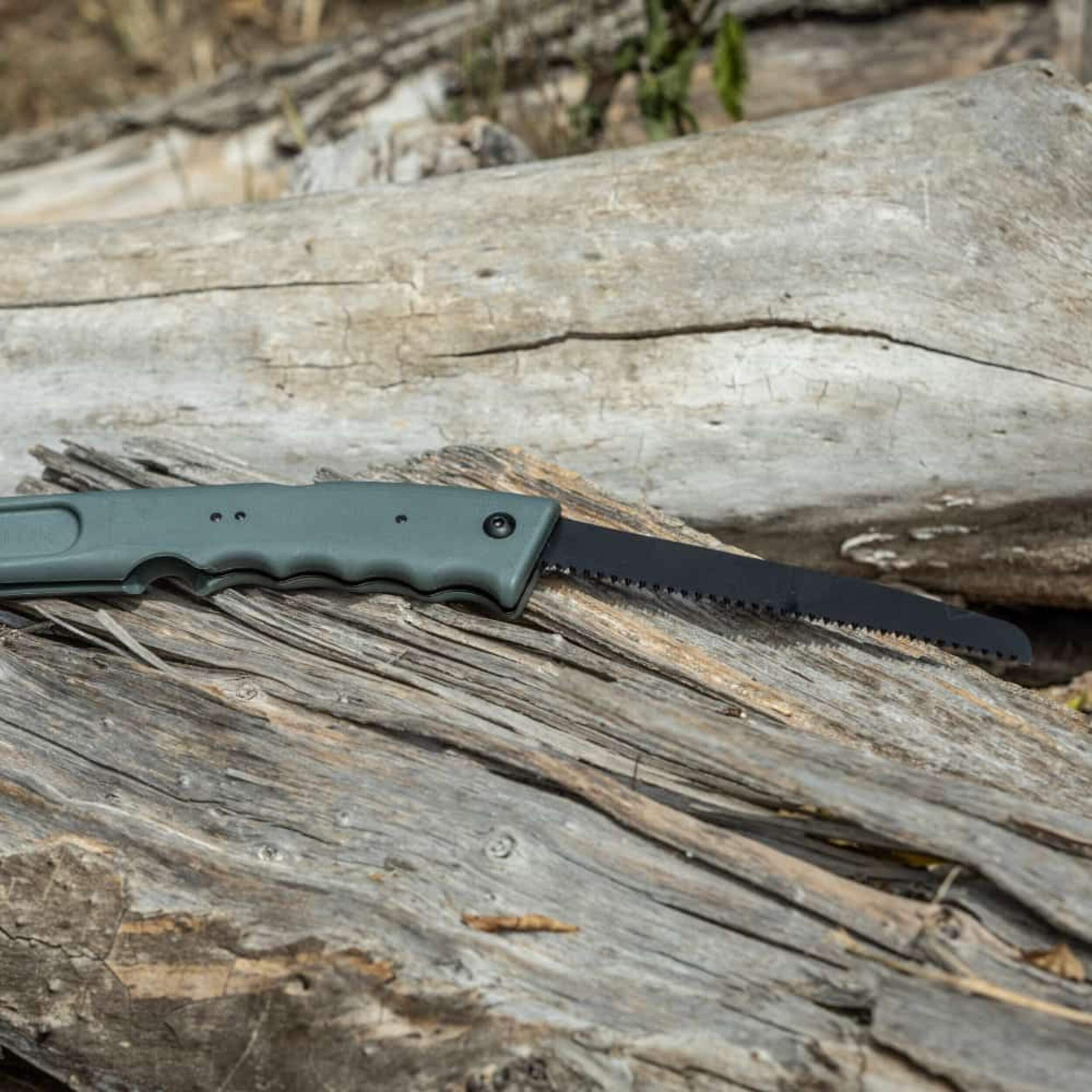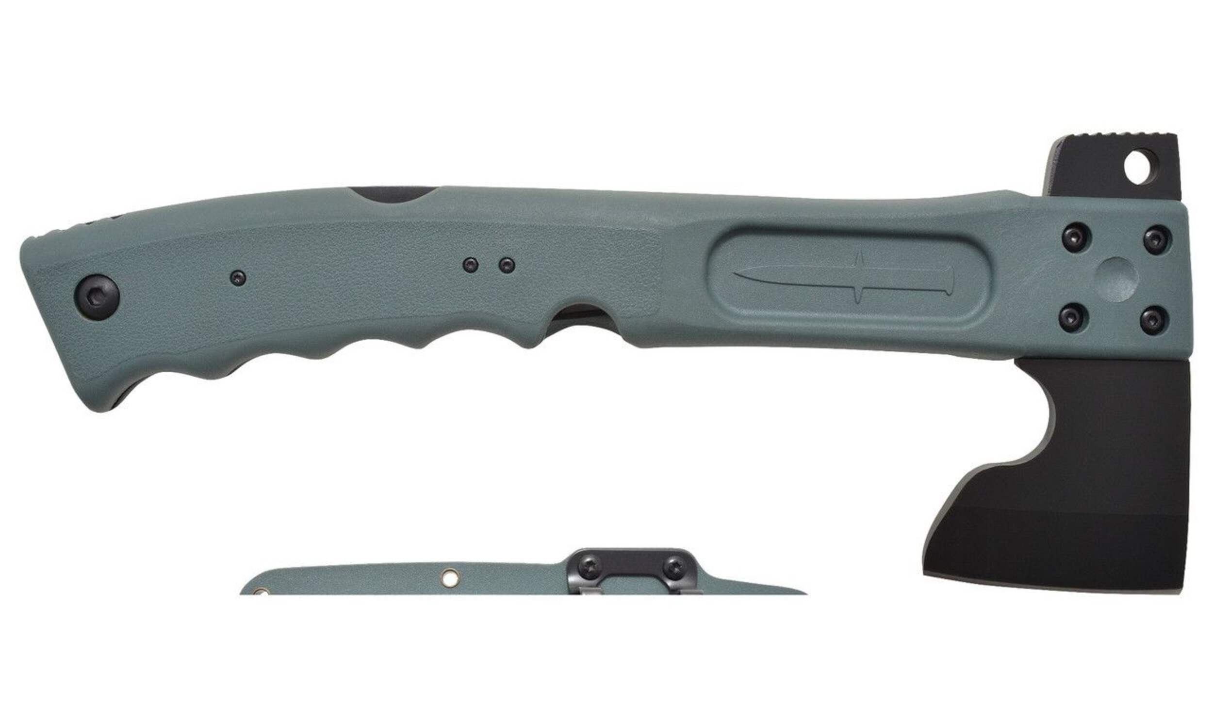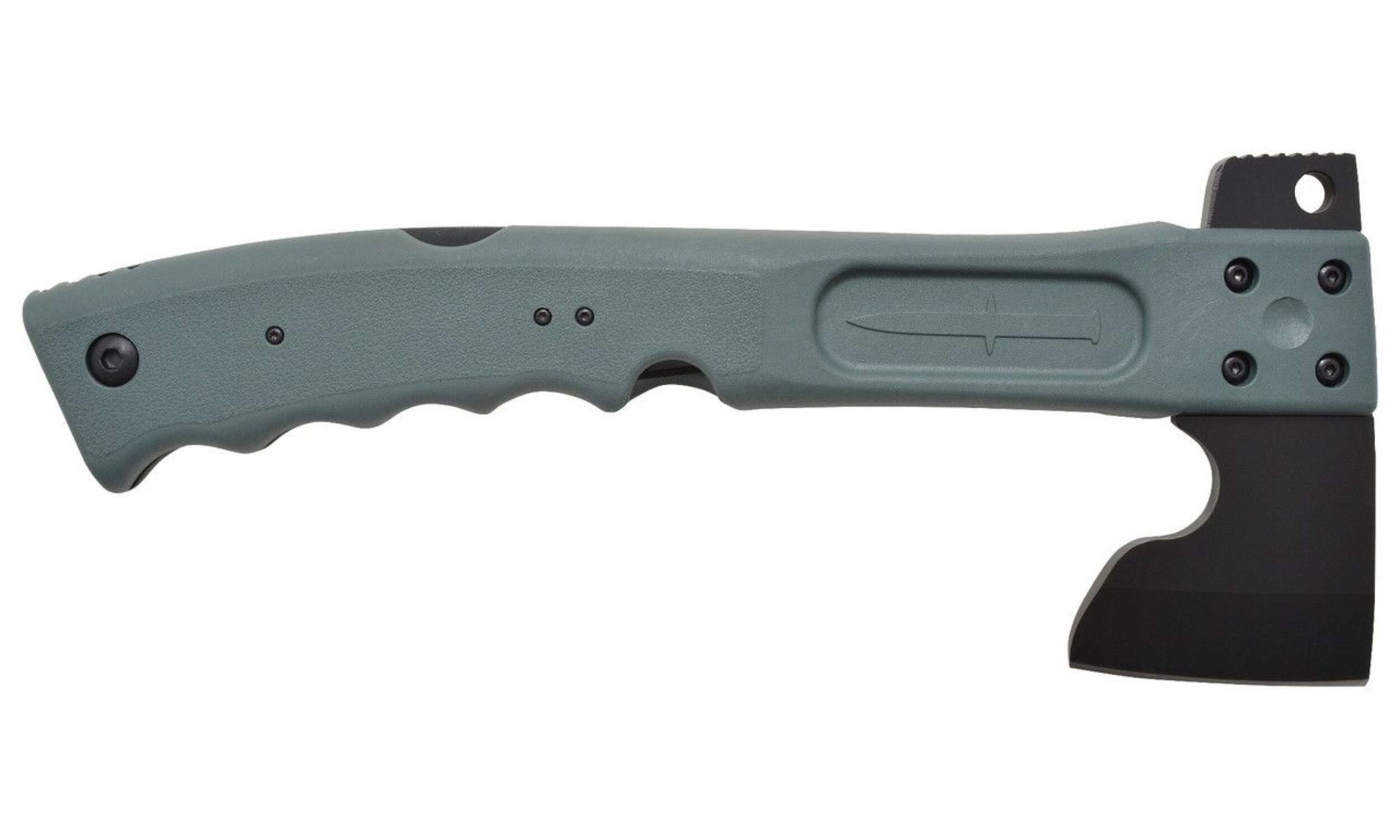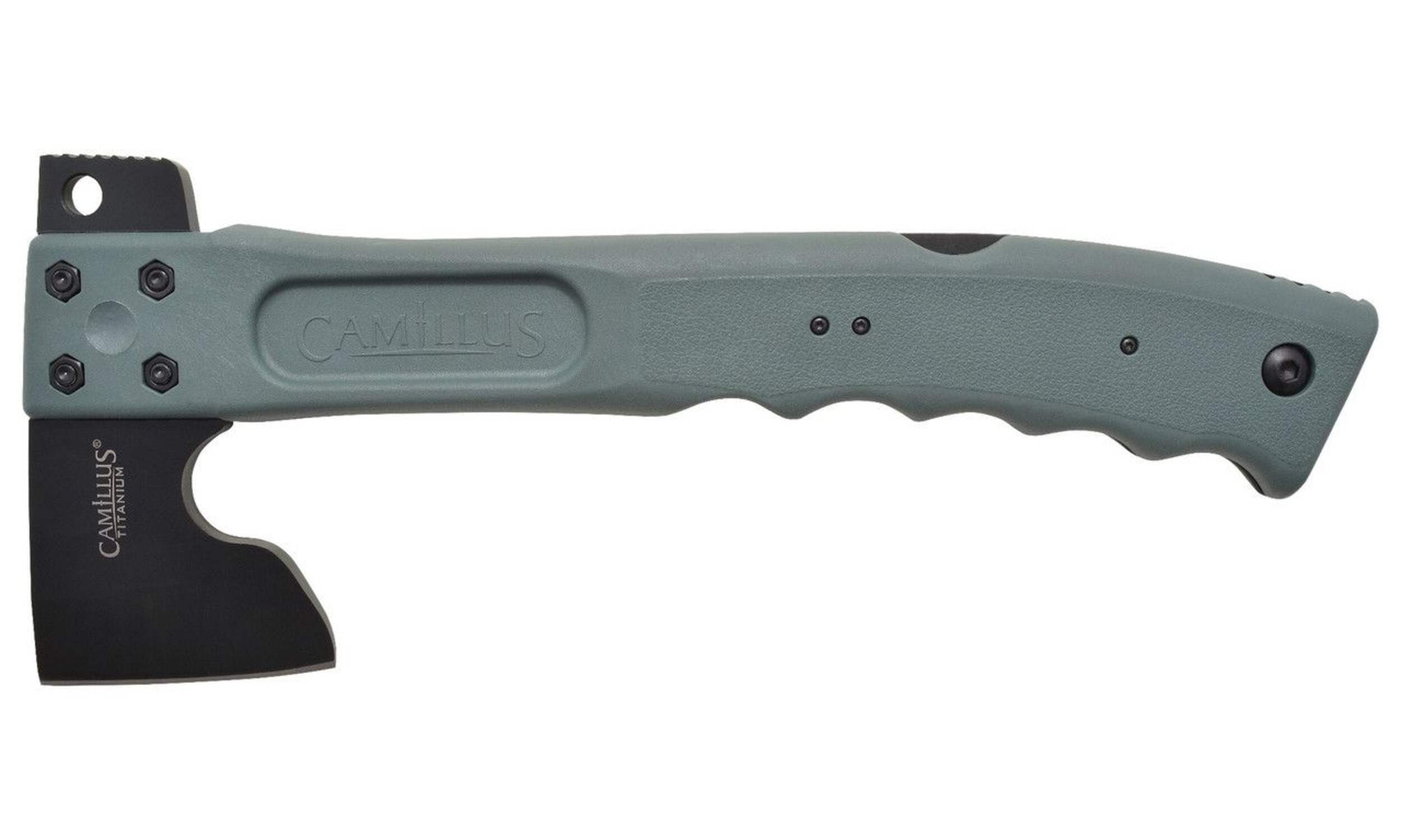 Features a 3" (7.62 cm) titanium stainless steel hatchet blade, 7" (17.78 cm) lock back folding saw and hammer