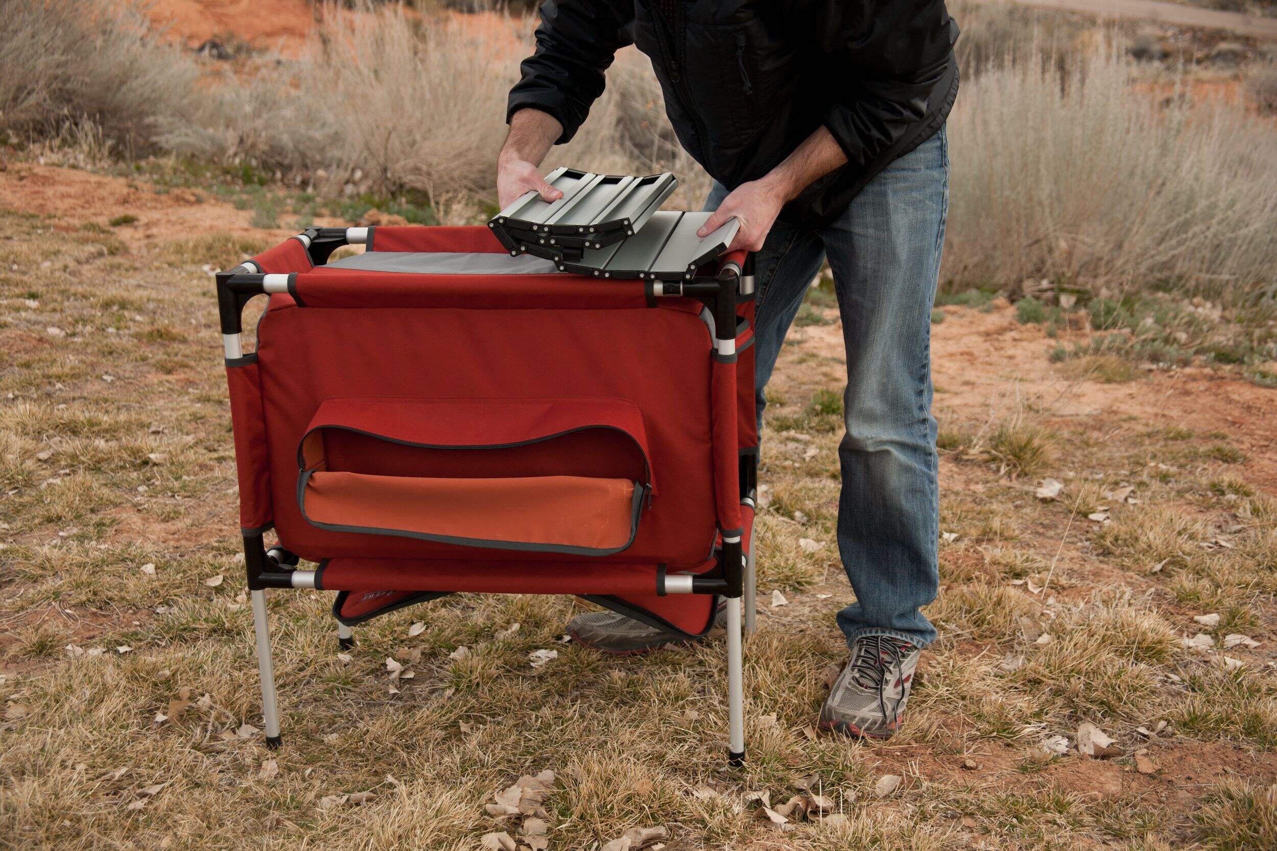 The Sherpa Camp Table & Organizer makes you feel like you've brought the entire kitchen with you to camp. Pull out the aluminum table top for an outdoor dining table or extra prep space; use the four removable storage bags to keep all your utensils and ingredients handy; you even have the kitchen sink with you thanks to a special waterproof lining inside one of the storage bags. When you're ready to head home, you can compress the legs, fit the bags inside their storage compartments, and use the carry handles on either side—clean-up is a breeze. Discover your new favorite cooking center today with the Sherpa Table & Organizer.