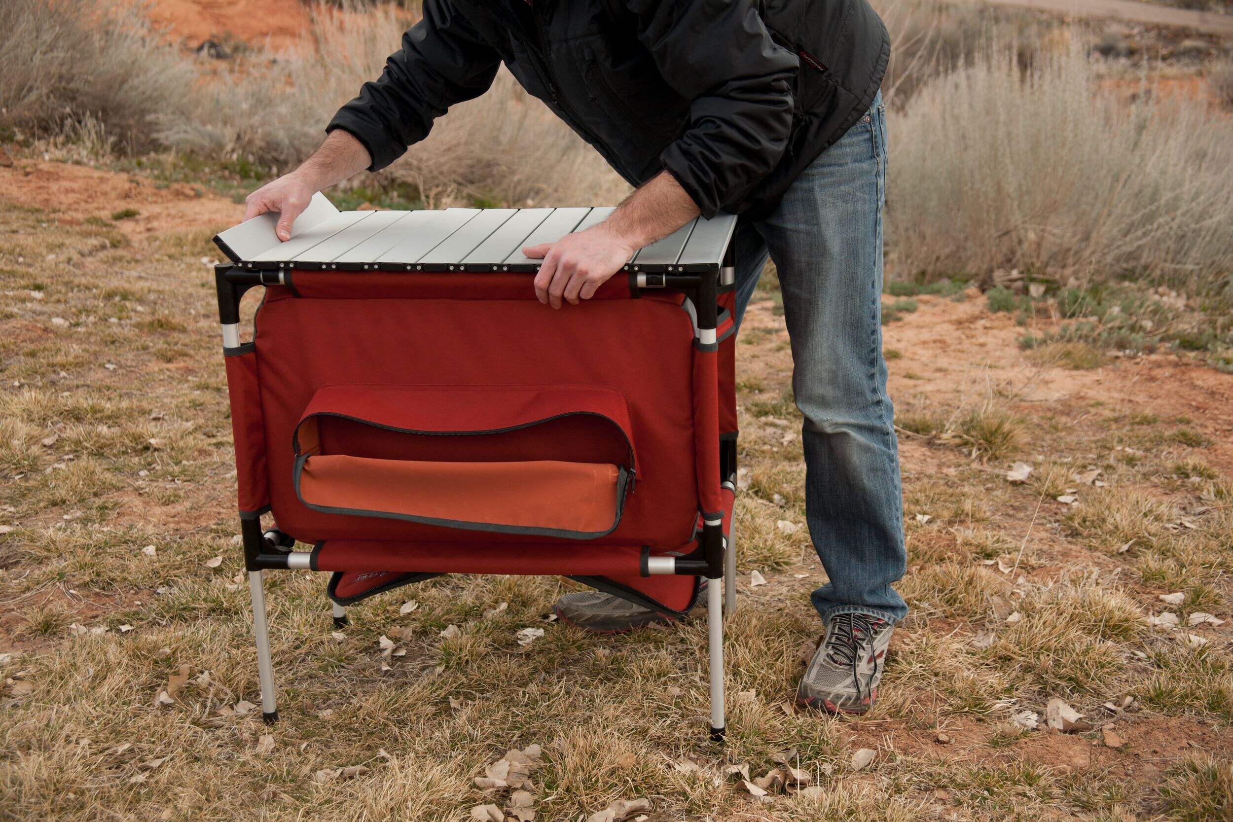 Camp Chef Mountain Series Sherpa Table and Organizer features a versatile aluminum roll top table