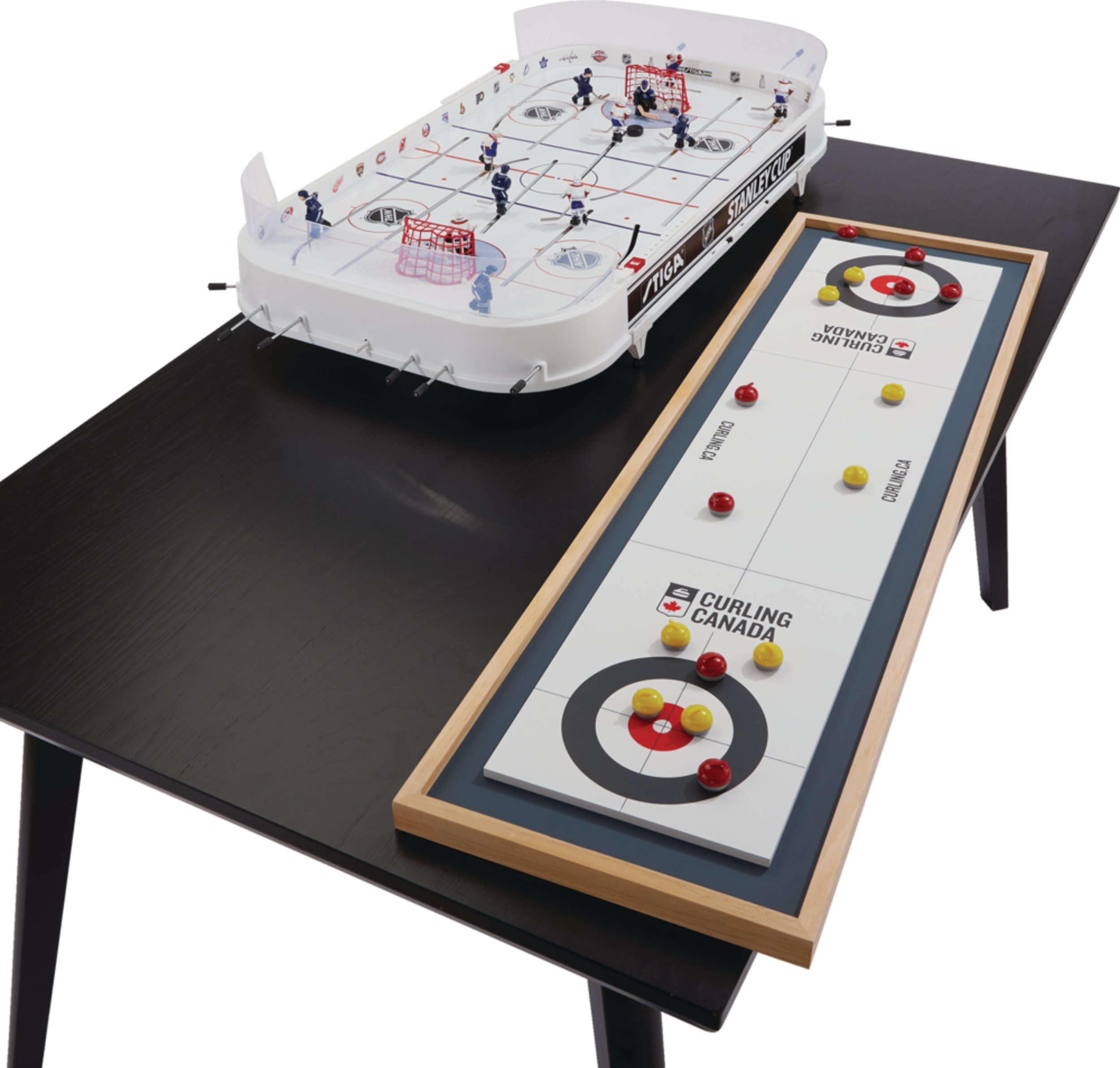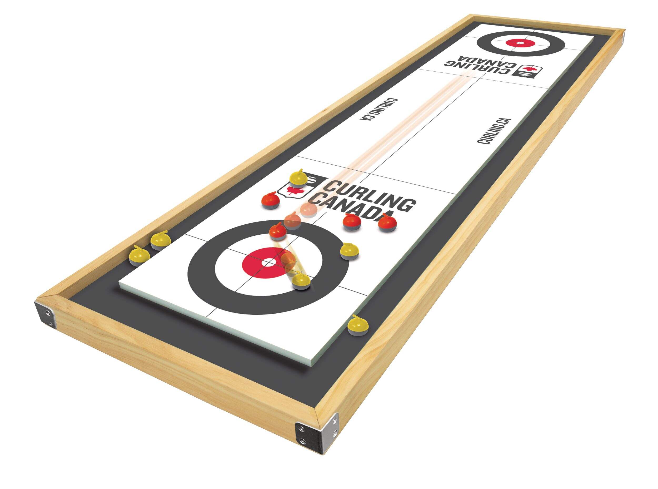 Add some extra fun to family game night with the Canada Curling Game. This deluxe wooden tabletop set provides twice the fun with one side for curling and the other for shuffleboard. It features an extra large play surface so you can practice your throwing and sweeping techniques. This fun tabletop game set includes sixteen curling stones and instructions on playing these classic games that the family is sure to enjoy.