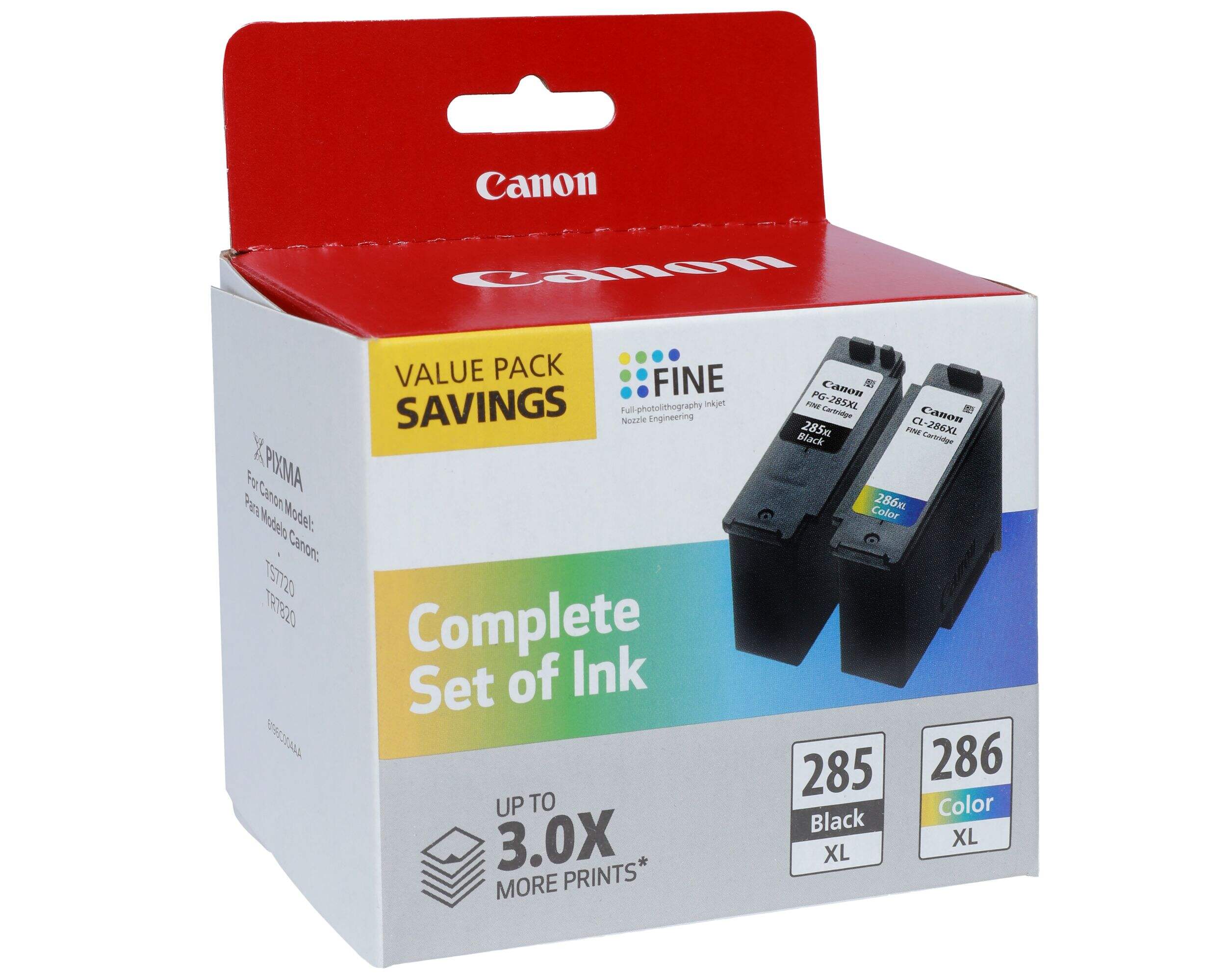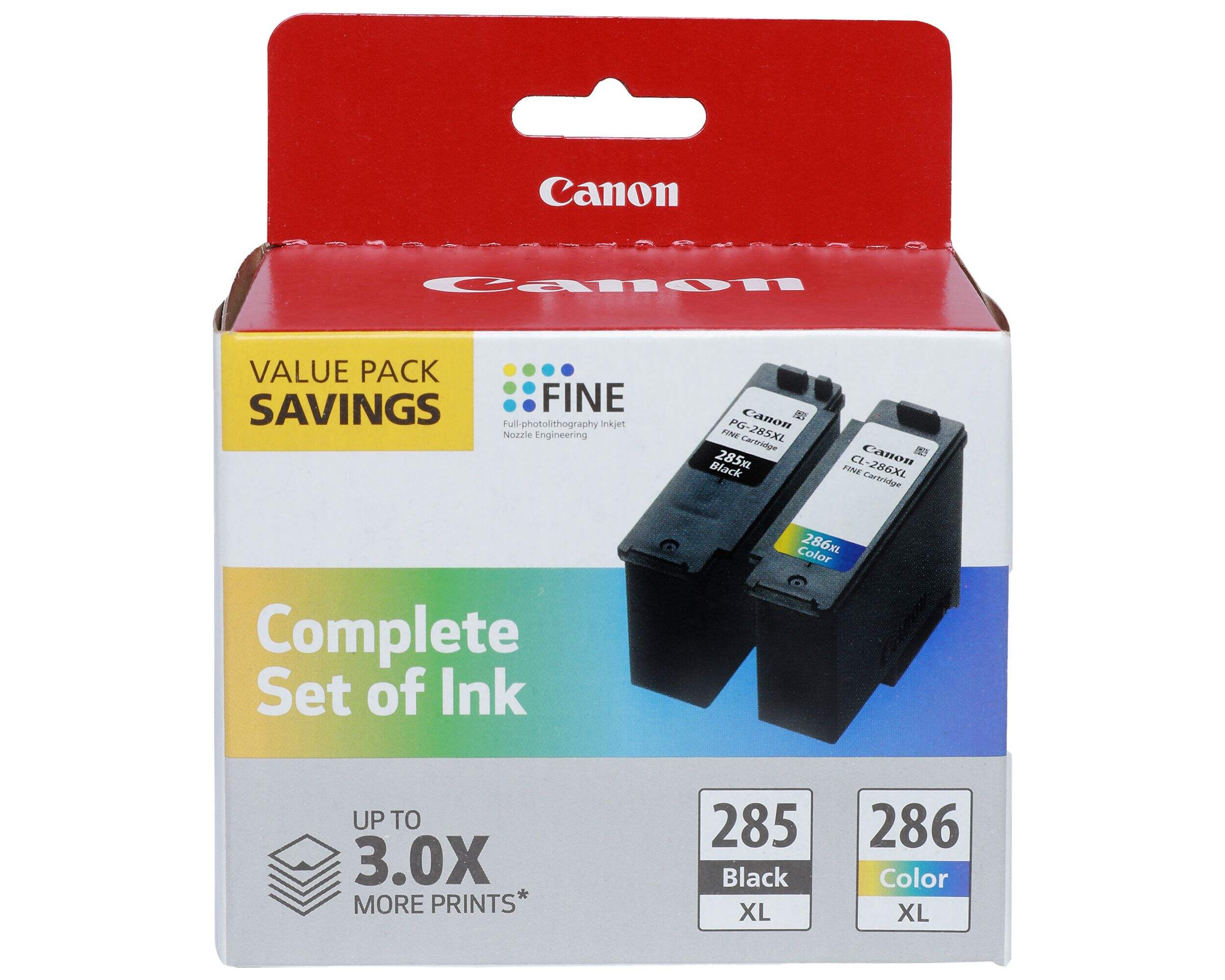 Value pack contains 2 cartridges: (1) PG-285 XL Black ink, that yields up to 400 pages, and (1) CL-286 XL colour ink, that yields up to 400 pages