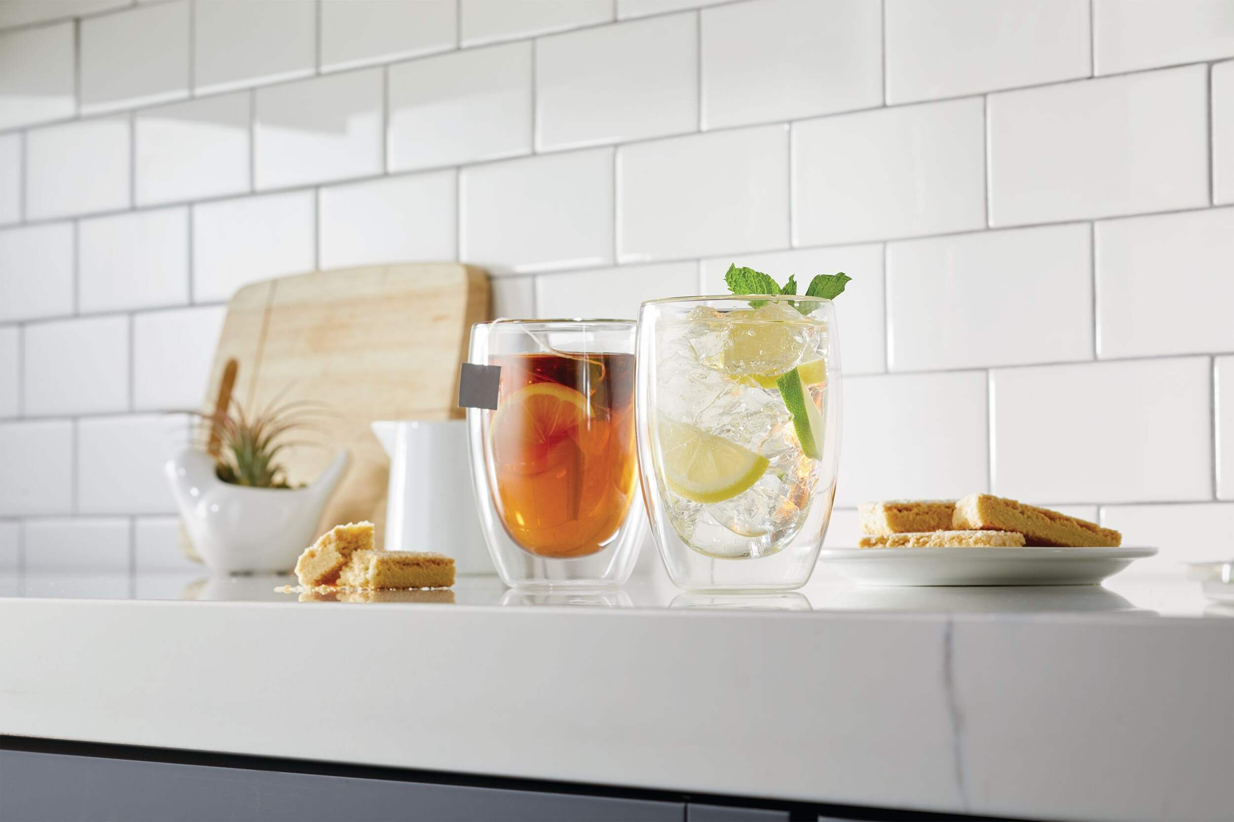 Keep cold beverages cold and hot beverages hot with these stylish CANVAS Double Wall Glass Cups. Made from borosilicate glass with an insulated interior layer, these glass cups help to keep the contents hot while the exterior layer remains cool to the touch. They’re also handy for helping cold drinks stay cool without condensation and for serving ice cream and appetizer soups. These two versatile double walled cups are dishwasher and microwave safe.