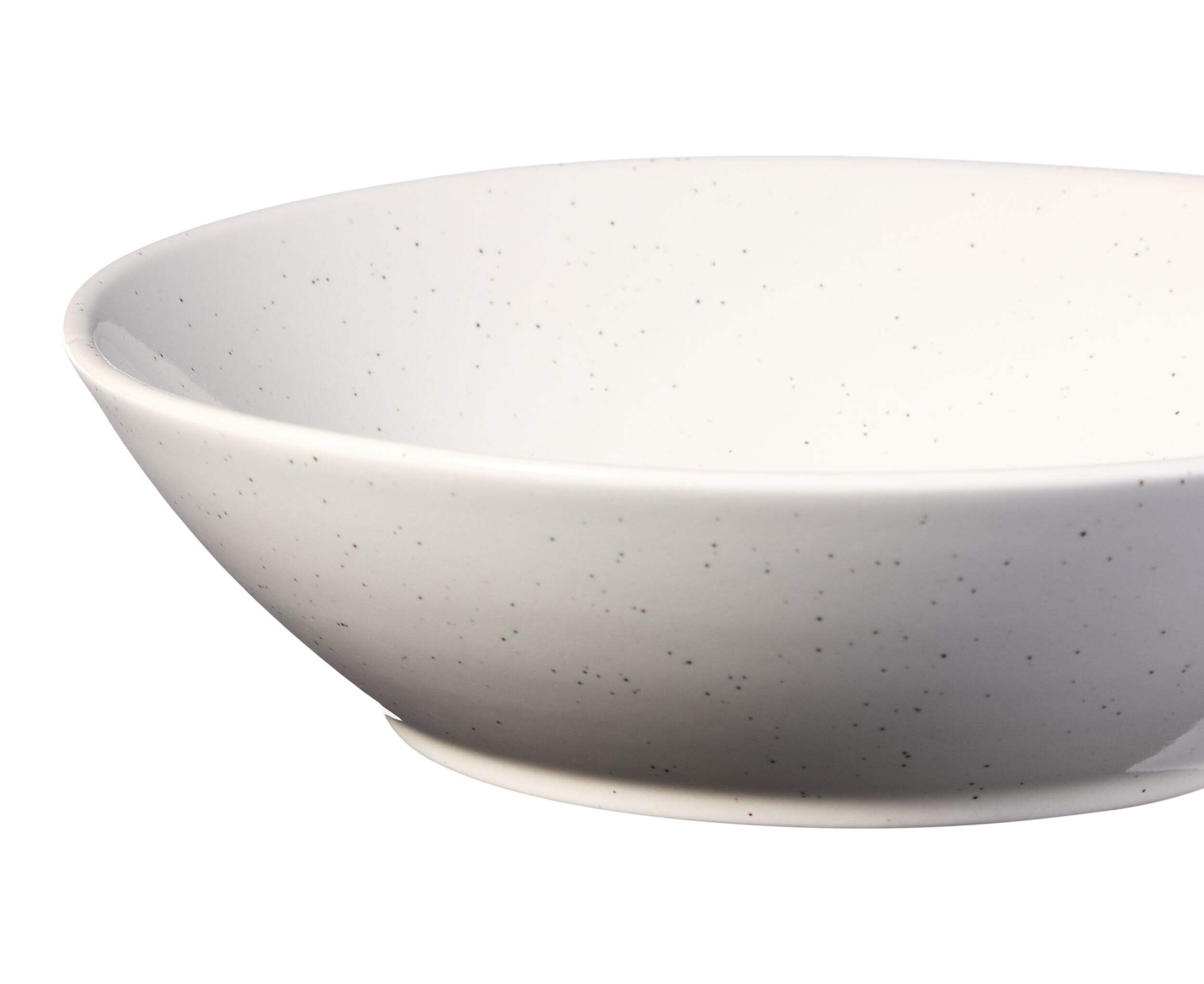 The CANVAS Bettina Glossy Stoneware Dinner Bowl offers a subtle organic shape with a glossy white glaze featuring a speckled finish. Its versatile design complements any tabletop setting, making it an ideal choice for serving meals or presenting side dishes.