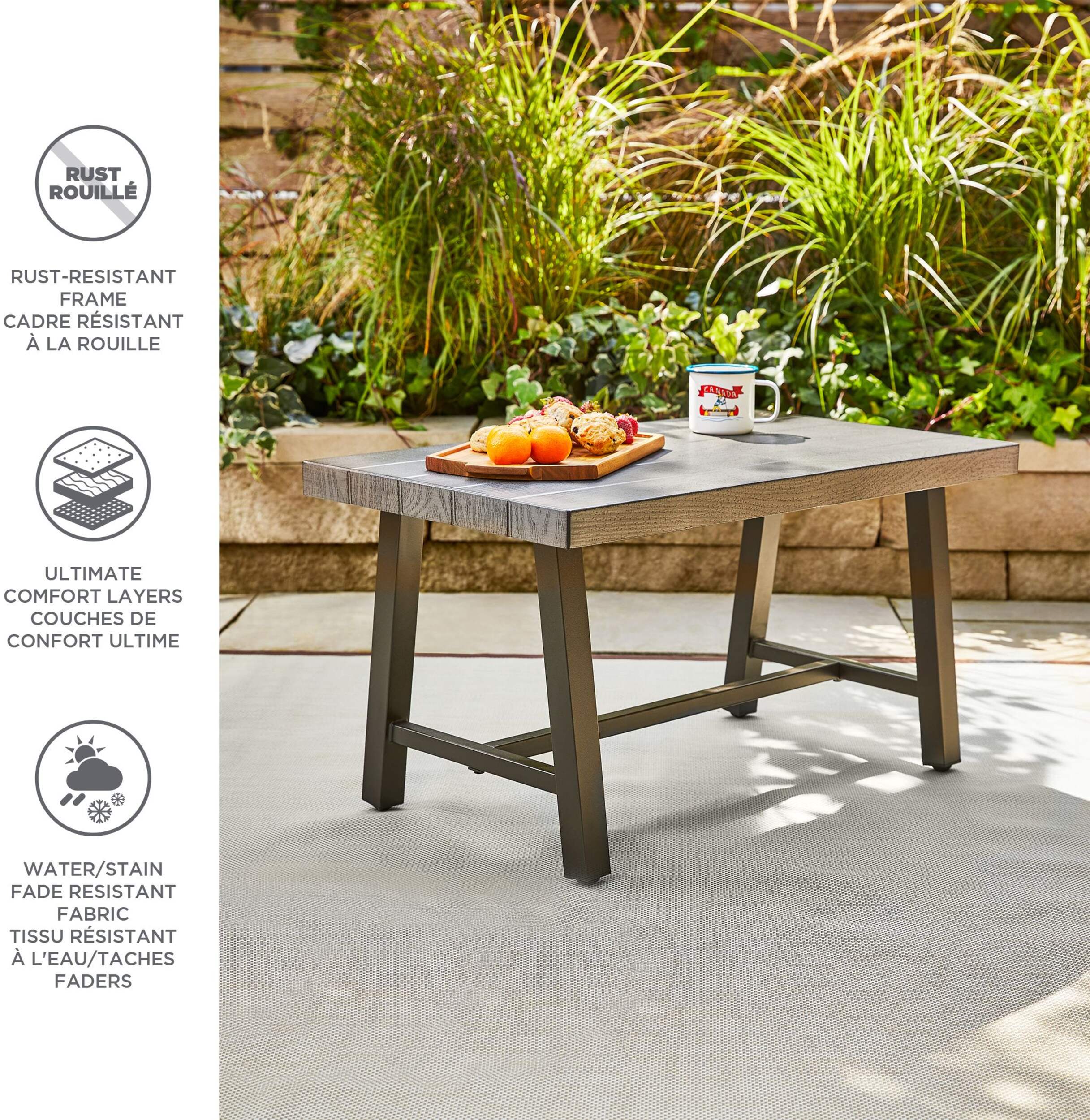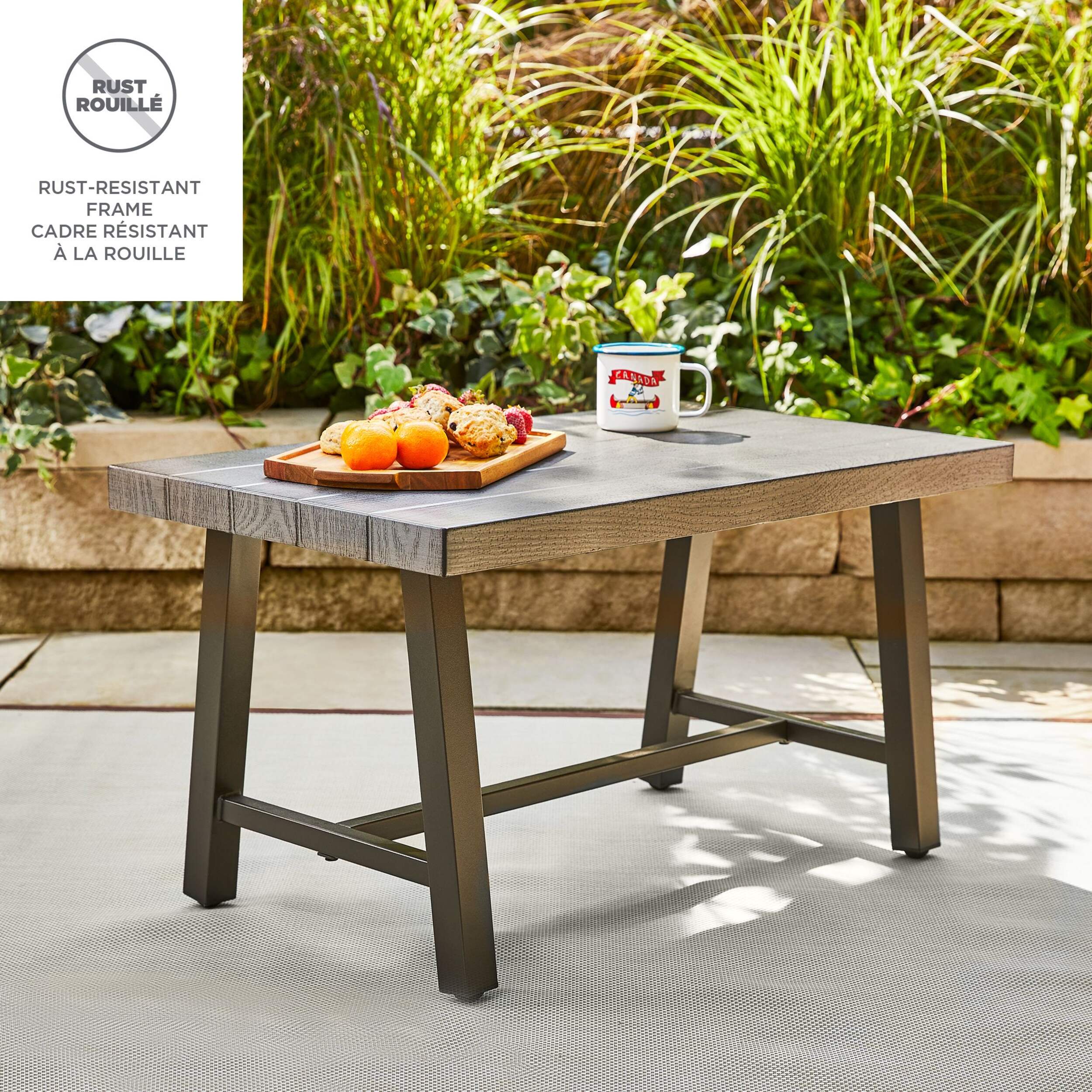 Add the convenience of a patio table to your patio or outdoor conversation areas with this fashionable and functional CANVAS Breton Rectangle Steel Outdoor Patio Coffee Side Table. The outdoor patio coffee table has a sturdy, durable E-coated and powder-coated steel frame for extra protection against rust and weather exposure. The stylish table also features a metal plank top with an embossed faux wood texture and hand-brushed woodgrain finish that coordinates beautifully with any environment.