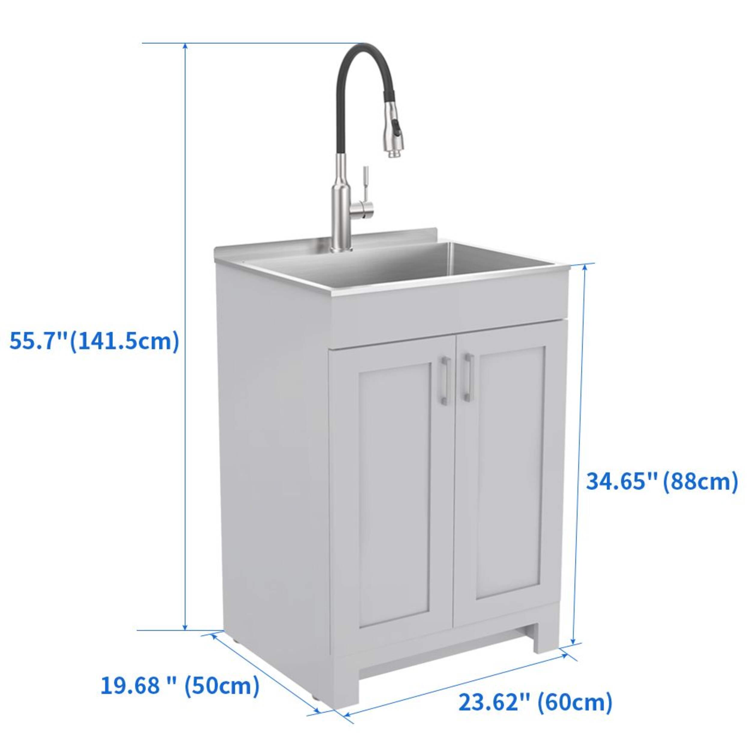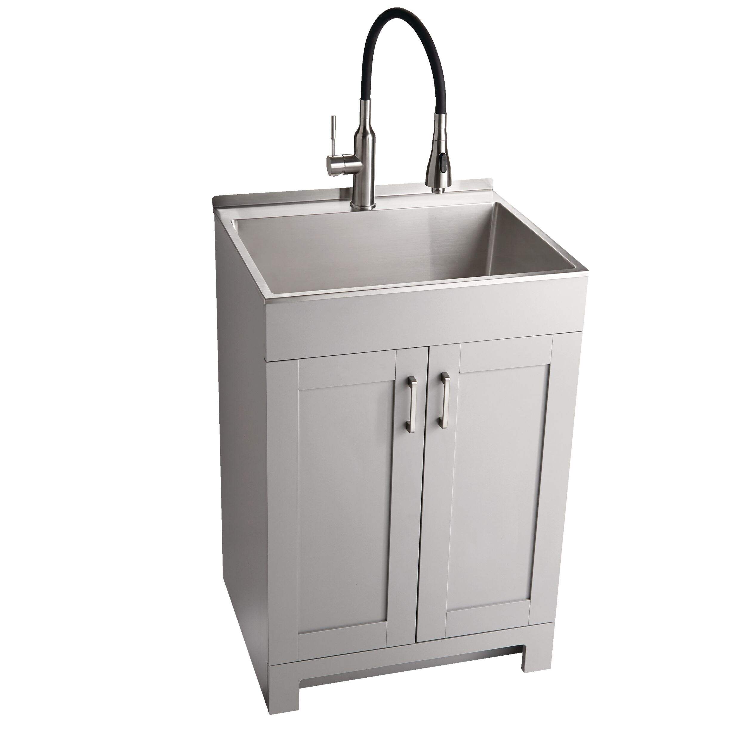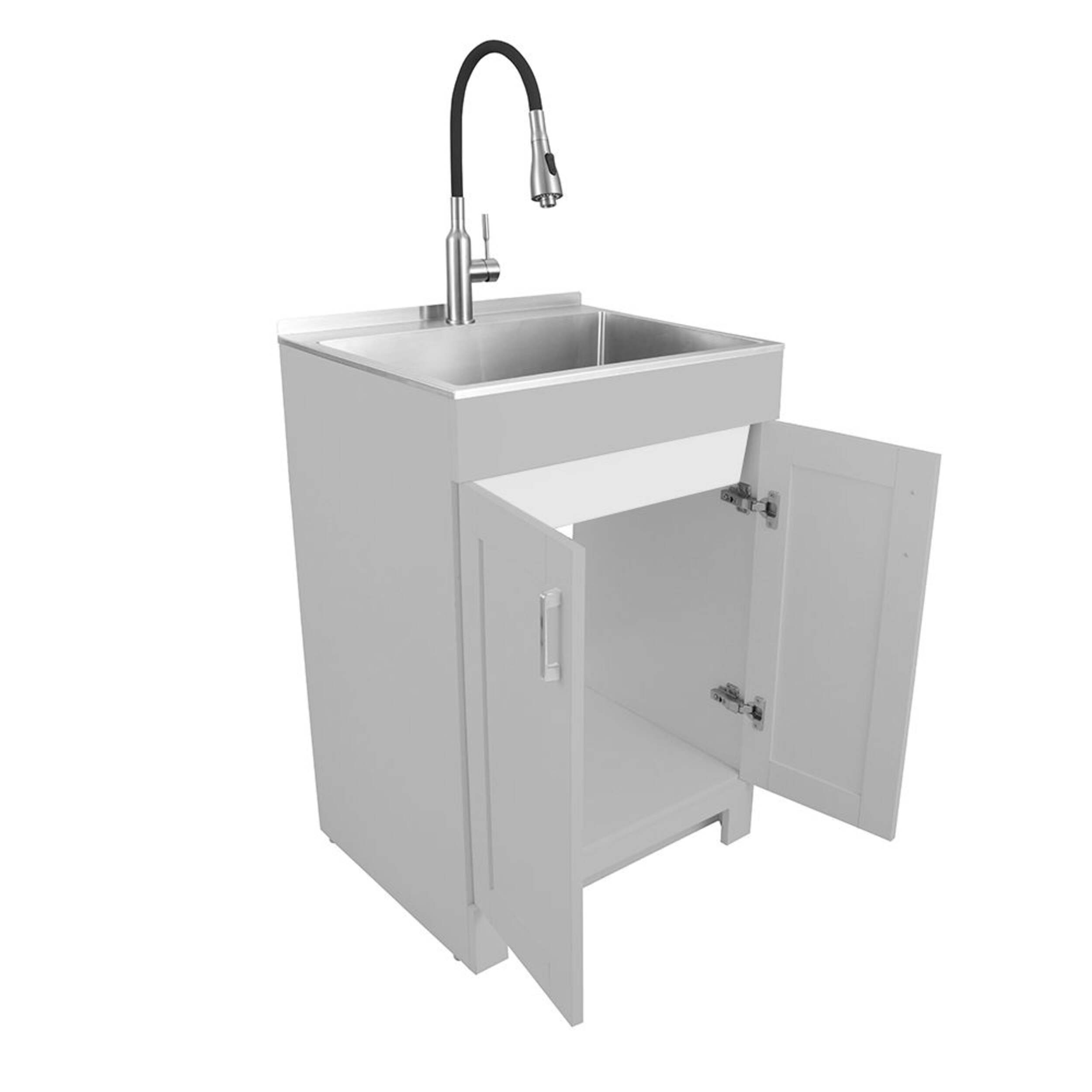 Thank you for your feedback. We apologize for the inconvenience you have experienced with your CANVAS Caplin All-In-One Laundry Cabinet, 24-in W x 20-in D x 35-in H, Grey. To address the issue with the faucet, we suggest bringing the product to your nearest store for further assistance. For additional support, please contact our call center at 1-888-670-6684. We appreciate your understanding as we strive to improve our products and services.