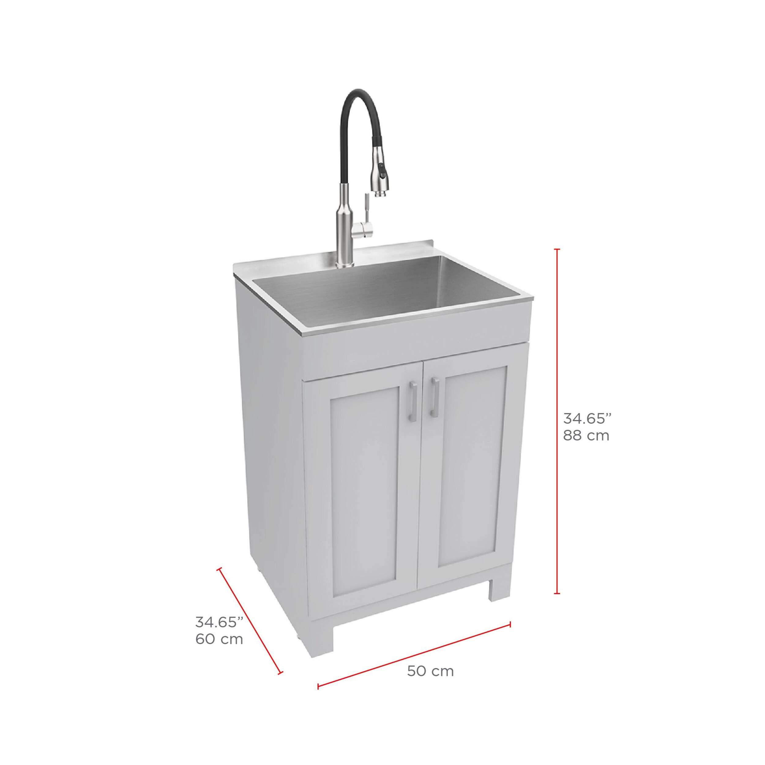 The CANVAS Caplin Laundry Cabinet provides a stylish and functional solution for organizing laundry rooms, mudrooms or garages. With its grey shaker-style cabinets, soft-close doors and ample storage, it combines elegance with practicality. Pre-assembled for easy installation, it includes a strainer, tail piece, and installation instructions for the sink and faucet, making setup straightforward and hassle-free—an ideal addition to enhance any space.