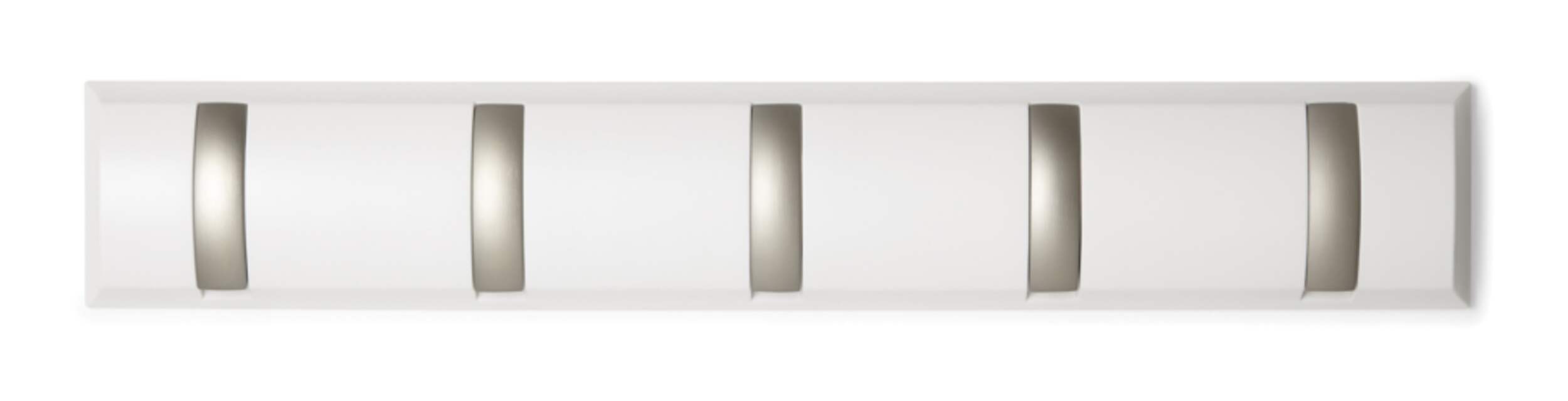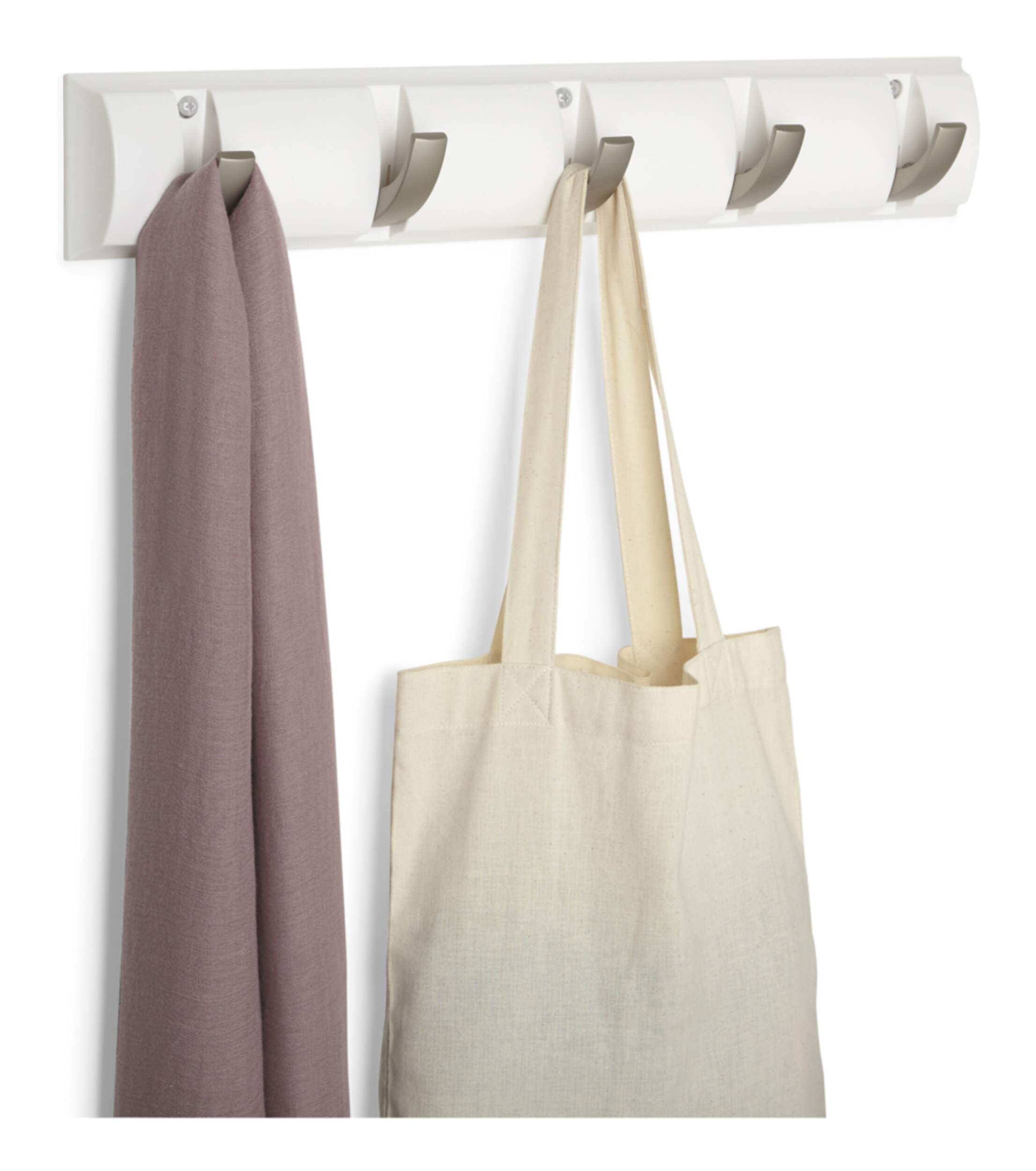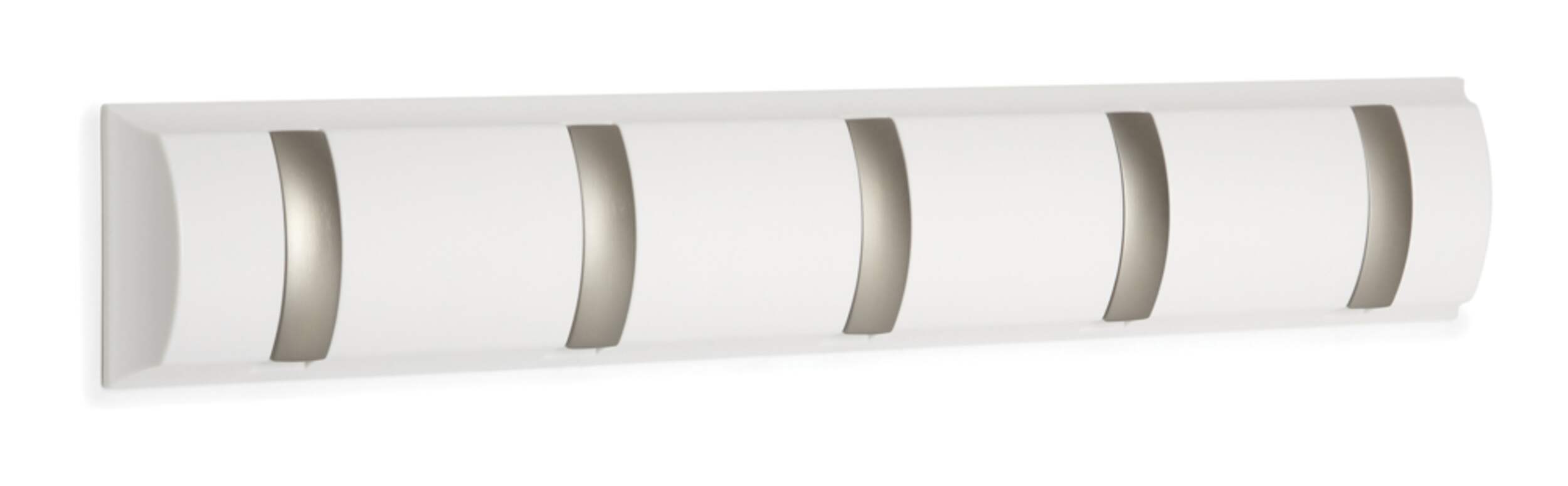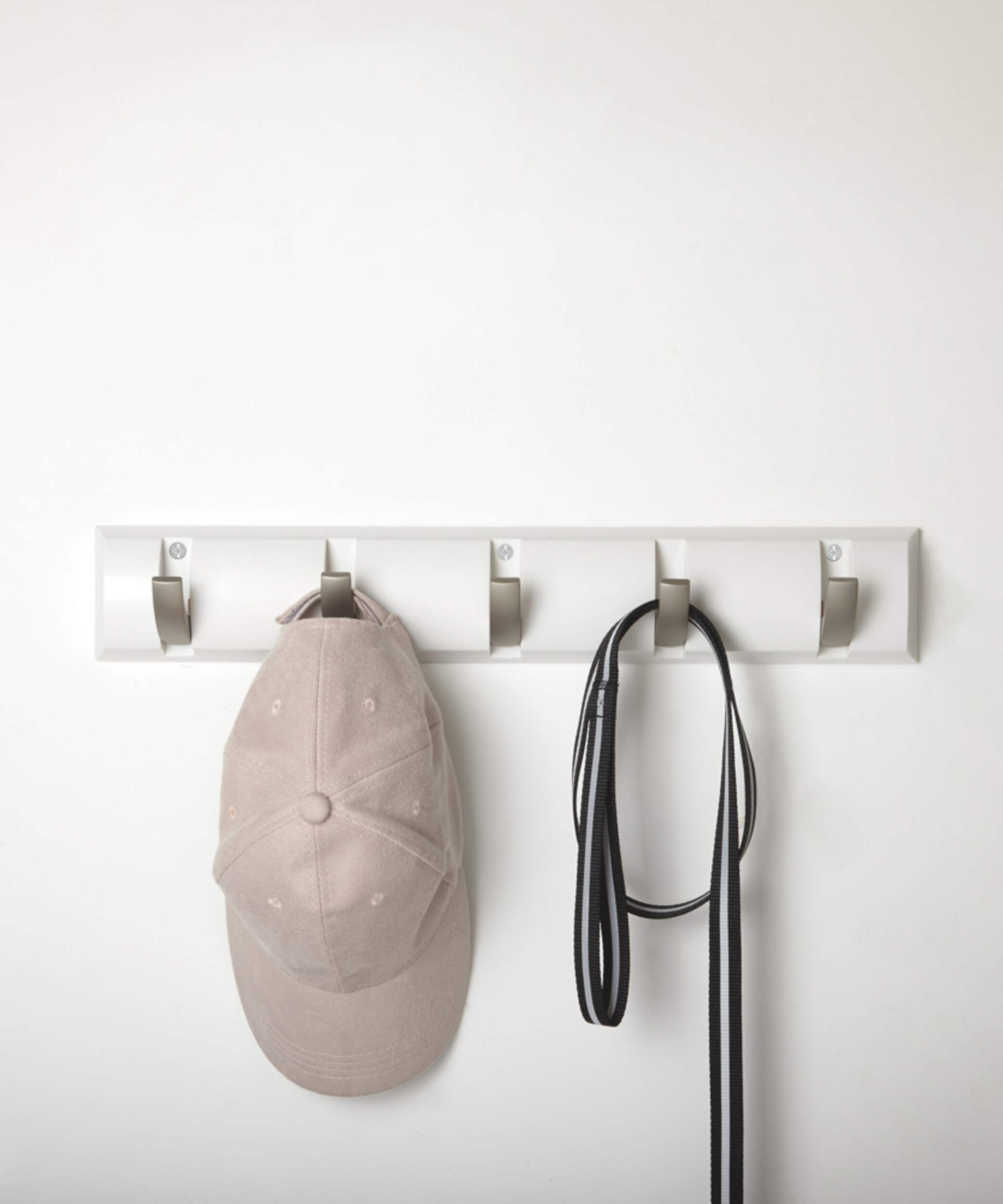 The CANVAS Clement Flip Down Hook Rail is a multi-purpose wall-mounted hanger that can hold totes, caps, scarves, and more. This 20" white steel hook rail features five flip-down hooks that can be flipped up when not in use. Ideal for light items, each flip-down hook can easily hold up to 5 lbs. of weight. This indoor hook rail is constructed with quality materials and is quick and easy to install.