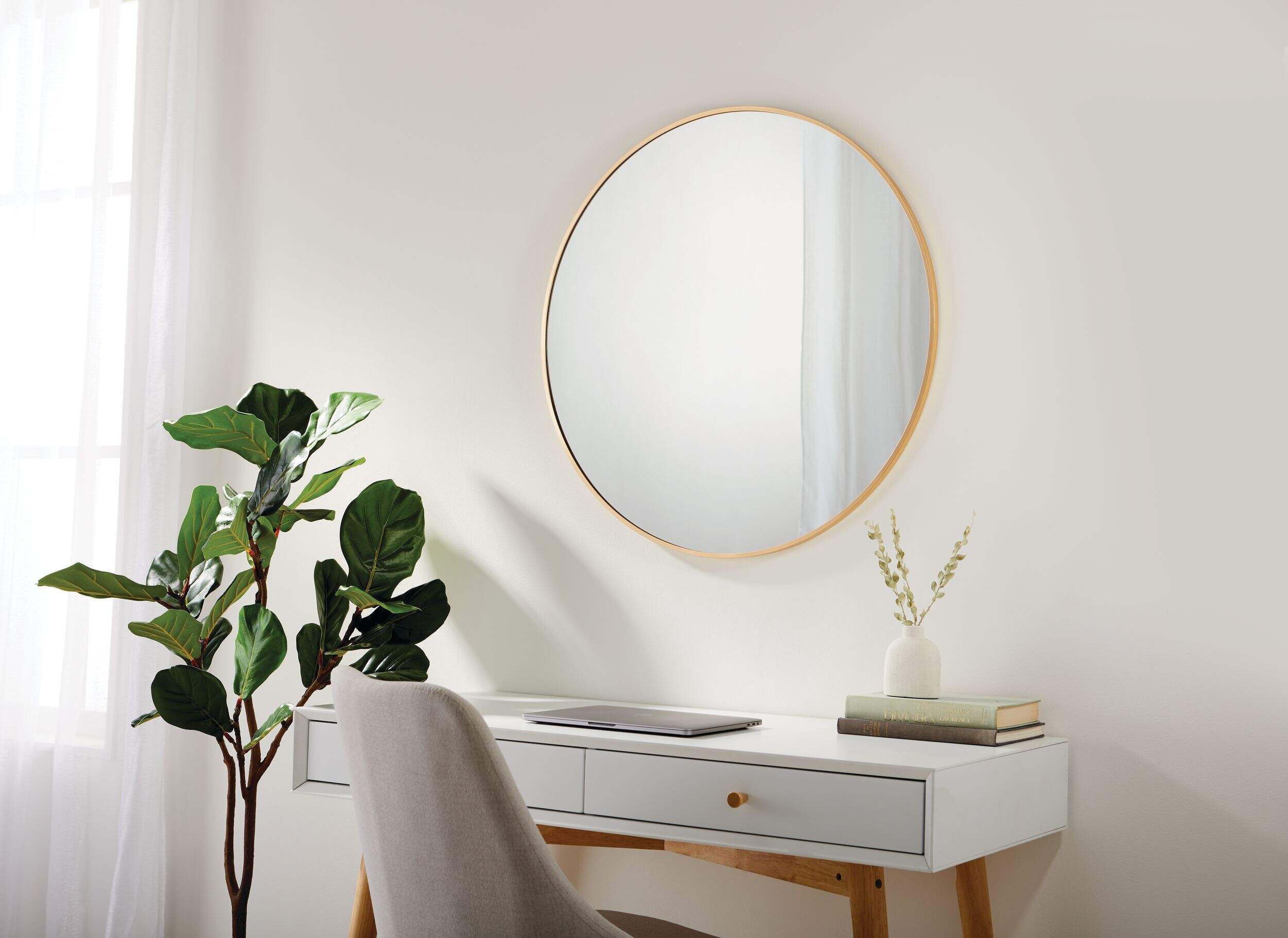 Add a touch of sophistication to your home with this stylish CANVAS Devon Round Mirror. This mirror features a sturdy aluminum frame and a sleek gold-tone finish that makes a perfect accent piece for empty walls. The slim frame design blends well with any decor, making this mirror ideal for use in entrances, bedrooms, bathrooms and more. The Devon round mirror comes ready to hang to add instant style to your home decor.