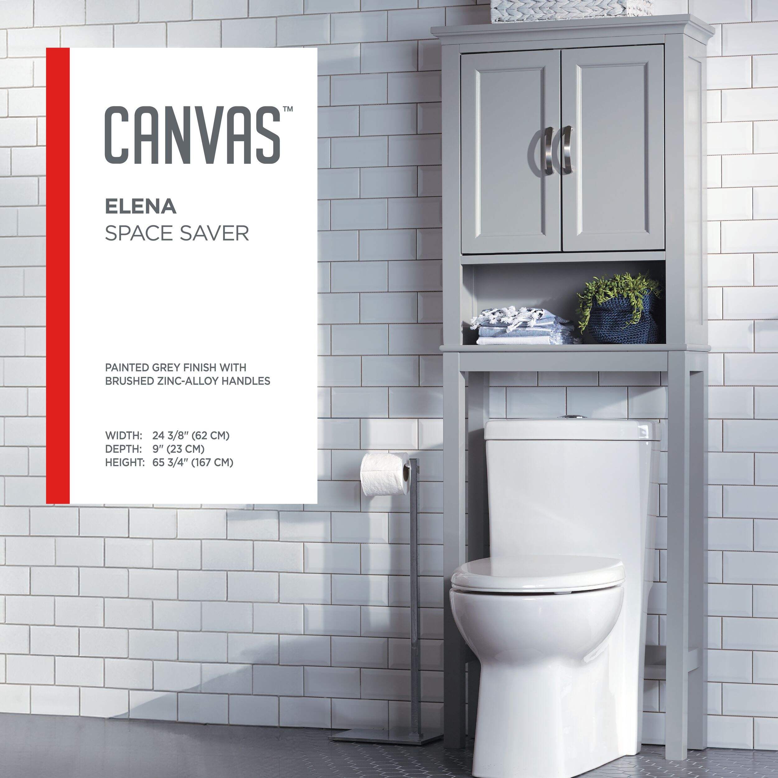 The CANVAS Elena 2-Door Over-The-Toilet Spacesaver Bathroom Storage Cabinet maximizes bathroom space with stylish functionality. Designed to fit over standard toilets, this cabinet provides concealed storage for essentials like toiletries and towels. Its chic grey finish complements modern decor, while adjustable shelves offer flexibility for different items. Ideal for smaller bathrooms, this durable, moisture-resistant cabinet adds both style and organization to any space.