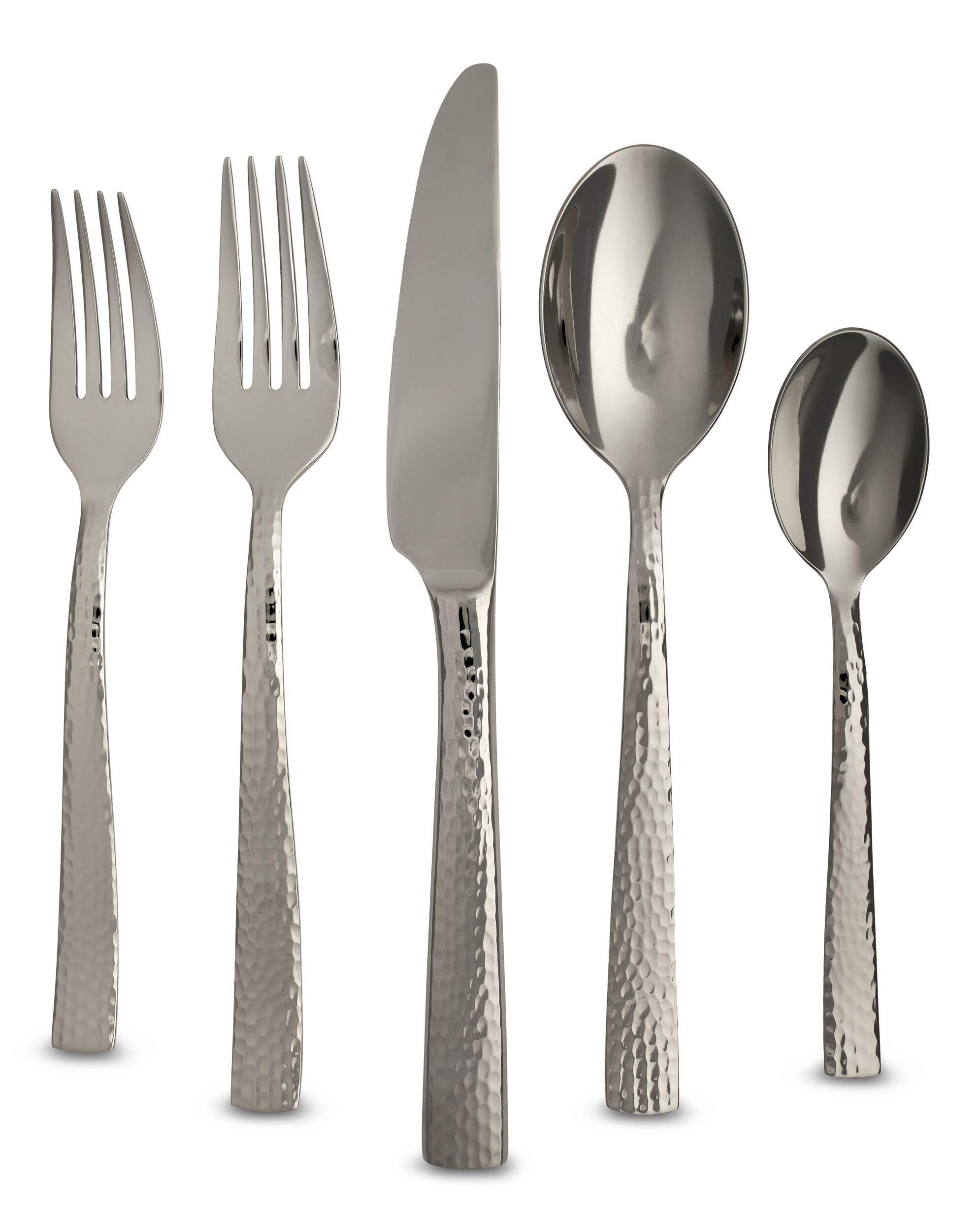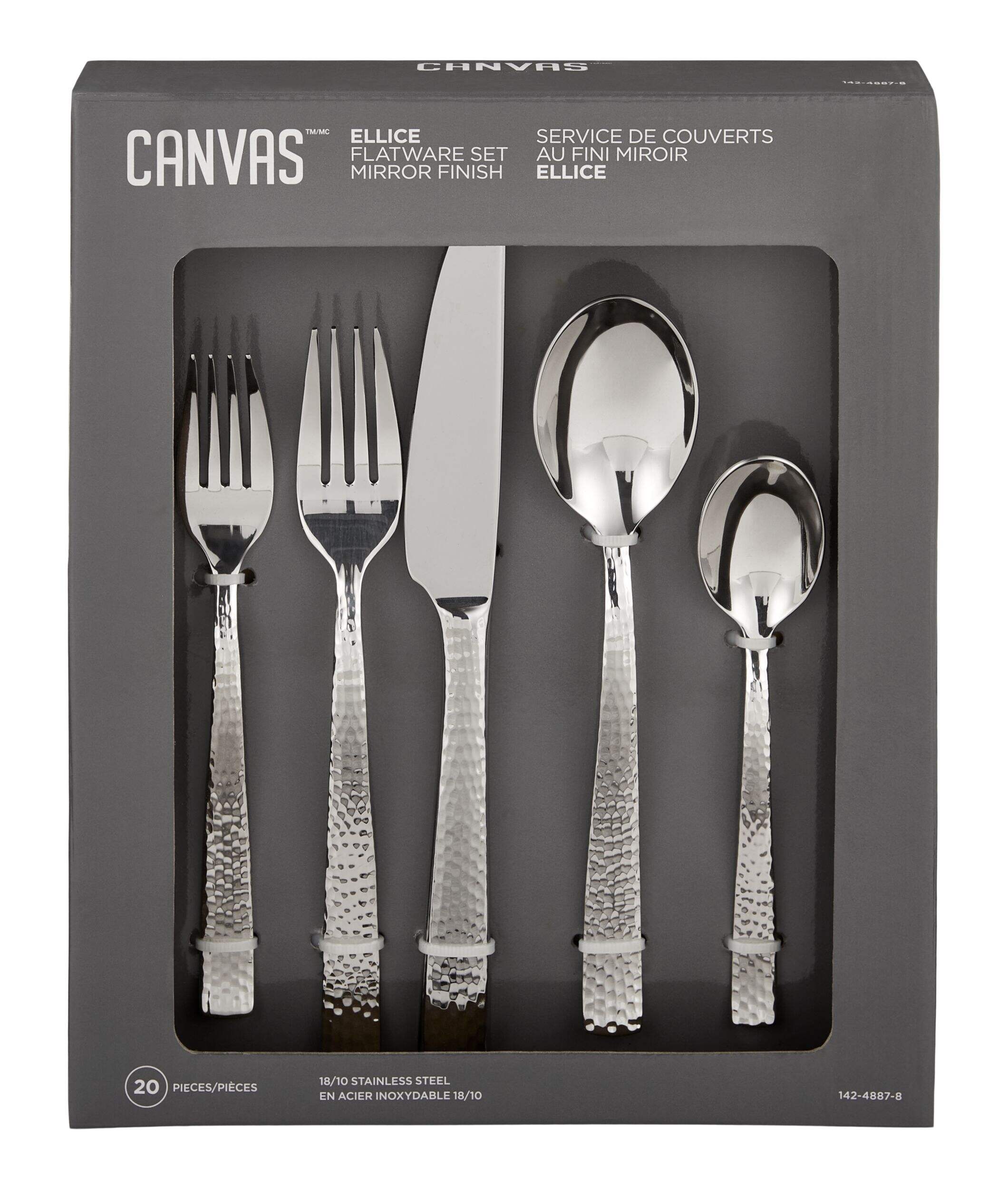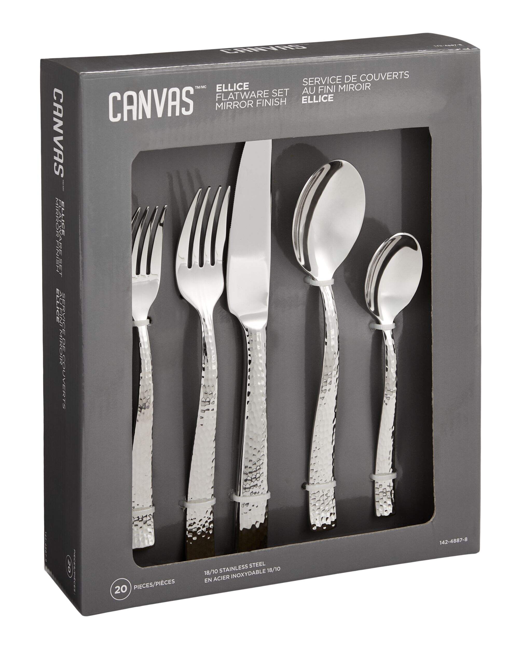 The CANVAS Ellice Flatware Set is a refreshing twist on everyday cutlery. The 20-pc utensil set features sleek stainless steel heads and a dramatic hammered finish on the handles. This corrosion-resistant flatware is a departure from the ordinary, with the style and function for daily dining and upscale flair for dinner events. This distinctive cutlery set can be dressed up or down with any tableware setting and is safe to clean in the dishwasher.
