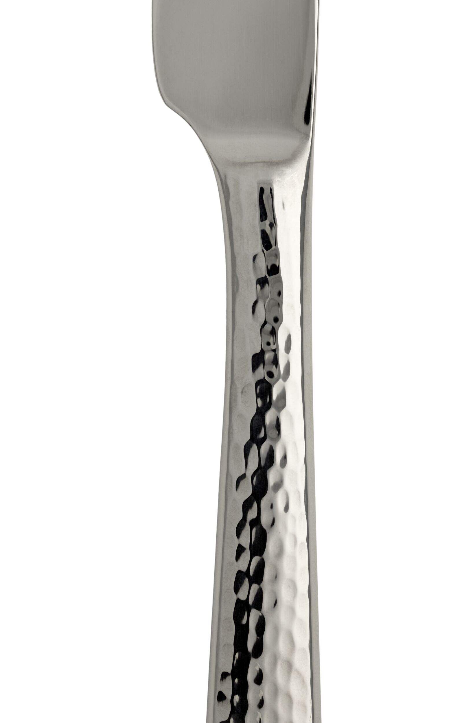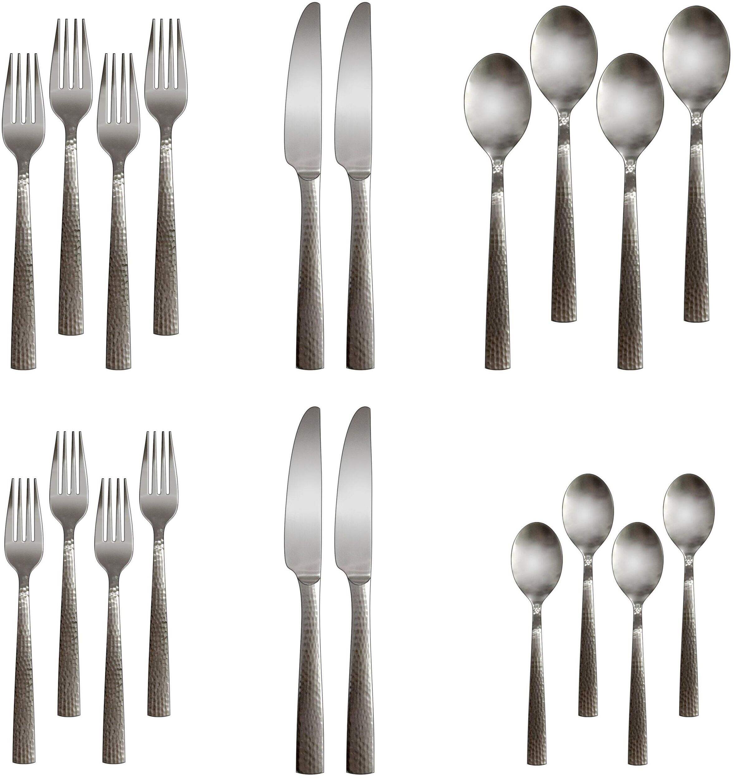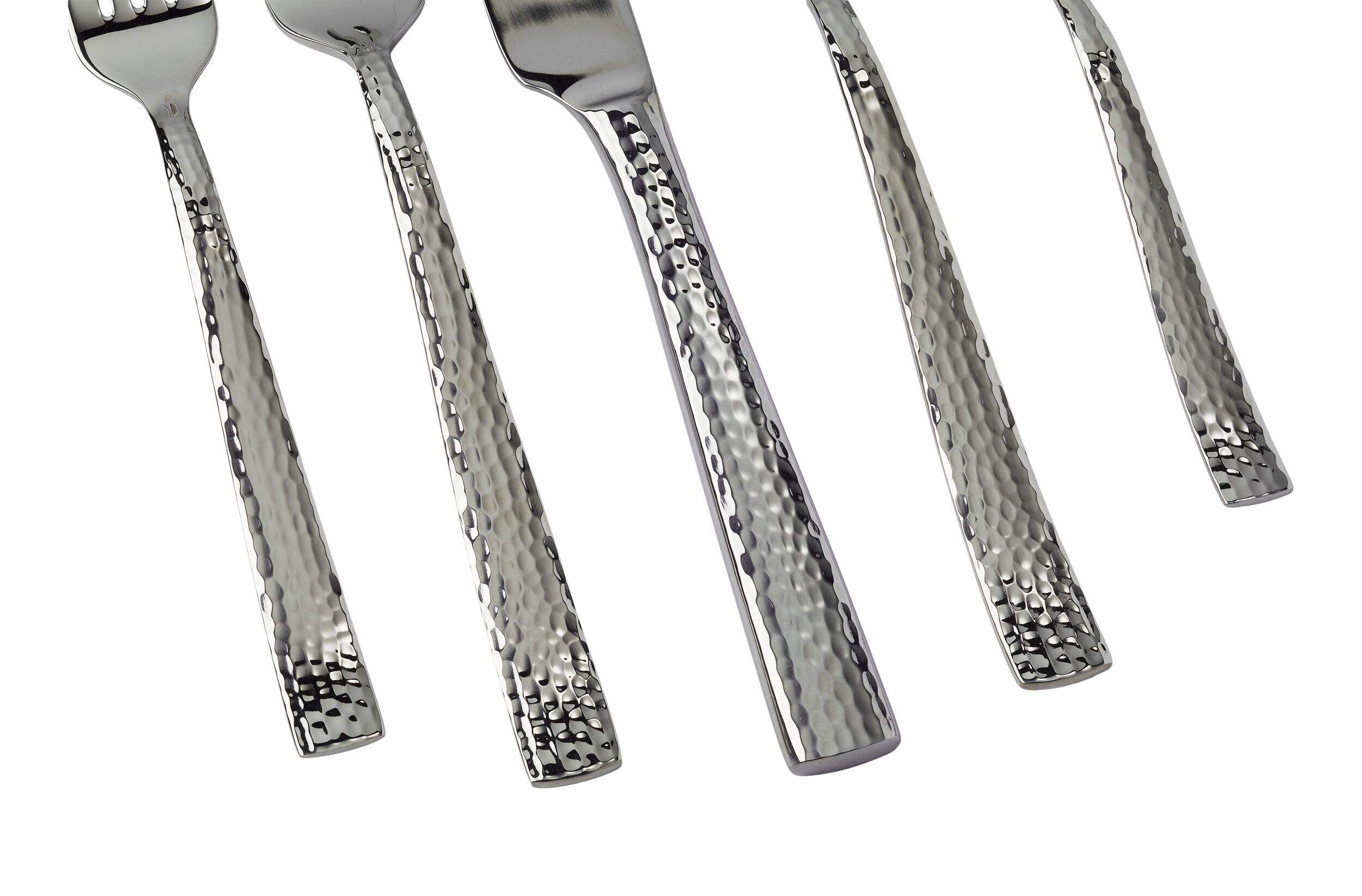 The CANVAS Ellice Flatware Set is a refreshing twist on everyday cutlery. The 20-pc utensil set features sleek stainless steel heads and a dramatic hammered finish on the handles. This corrosion-resistant flatware is a departure from the ordinary, with the style and function for daily dining and upscale flair for dinner events. This distinctive cutlery set can be dressed up or down with any tableware setting and is safe to clean in the dishwasher.