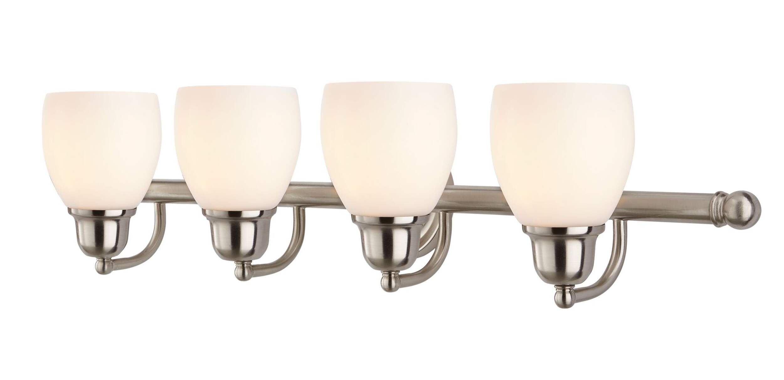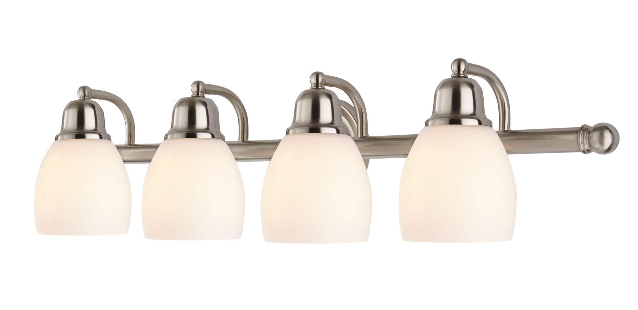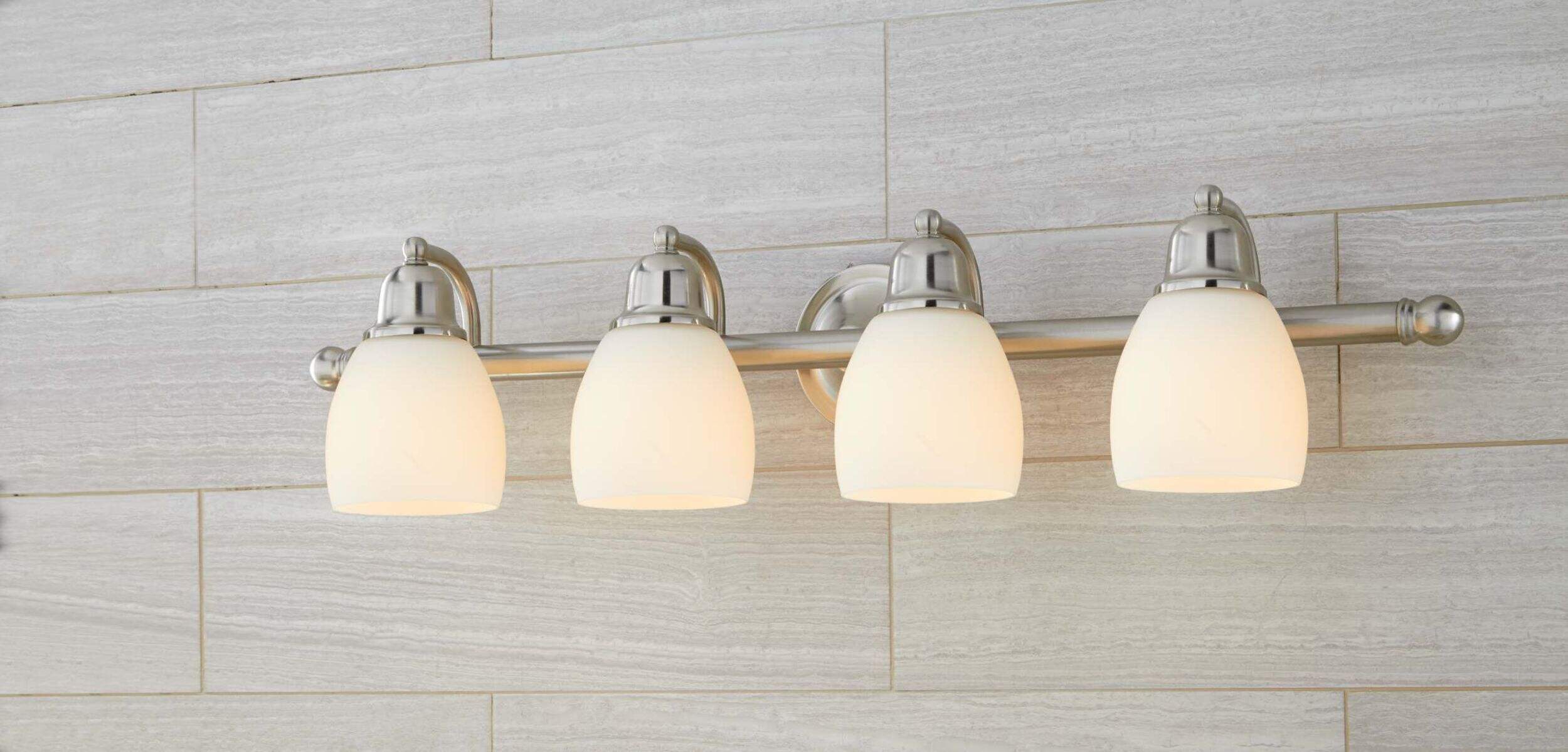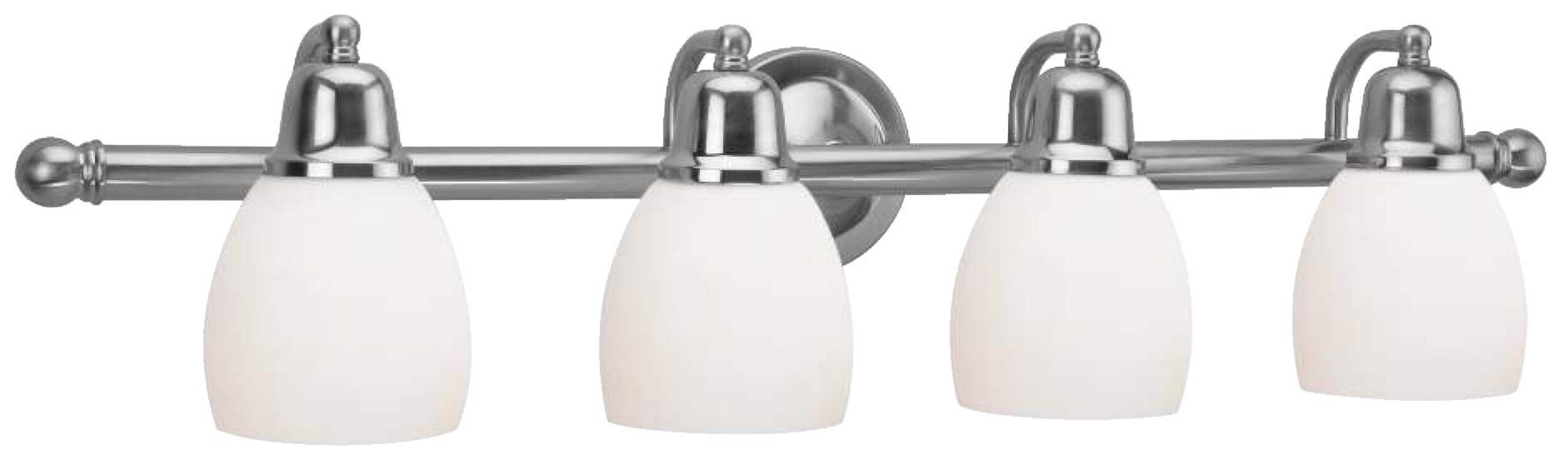 Featuring four lights on the same fixture, the CANVAS 4-Light Essence Vanity Fixture is a convenient addition to any stylish bathroom or kitchen. The attractive brushed-nickel finish offers a subtle, sophisticated aesthetic that is sure to complement any modern décor, while the 60W bulbs provide bright, practical light that's perfect for doing dishes in the kitchen or getting ready in the bathroom. The frosted opal glass shades help to soften the glow from the bulbs, ensuring this vanity light doesn't feel harsh, overwhelming, or unflattering. This is especially important in front of your bathroom mirror where you spend time putting on your makeup or getting ready for work. As there are four bulbs on this vanity light fixture, it's ideal for bathrooms with two side-by-side sinks or for above kitchen countertops and sinks where you spend time doing dishes and prepping food. Simply install this wall-mounted light fixture above your bathroom sink or kitchen sink for a practical and attractive lighting solution where you need it most. E26 bulbs not included.
