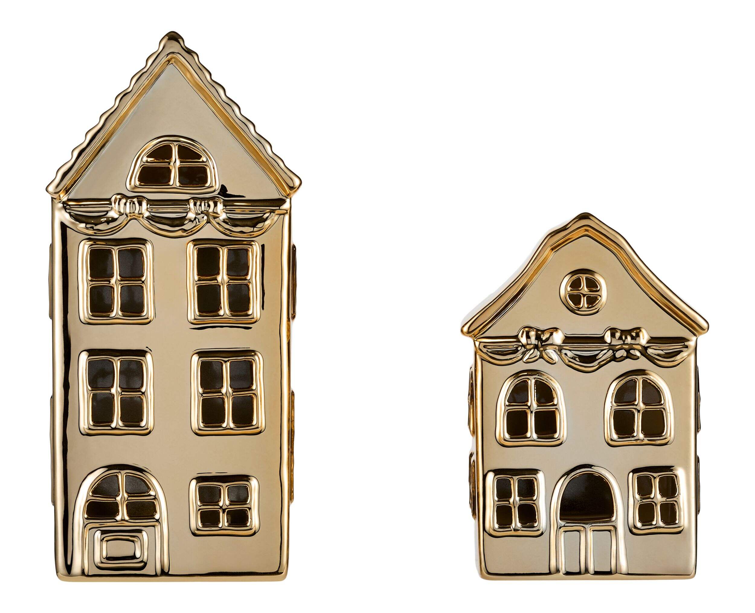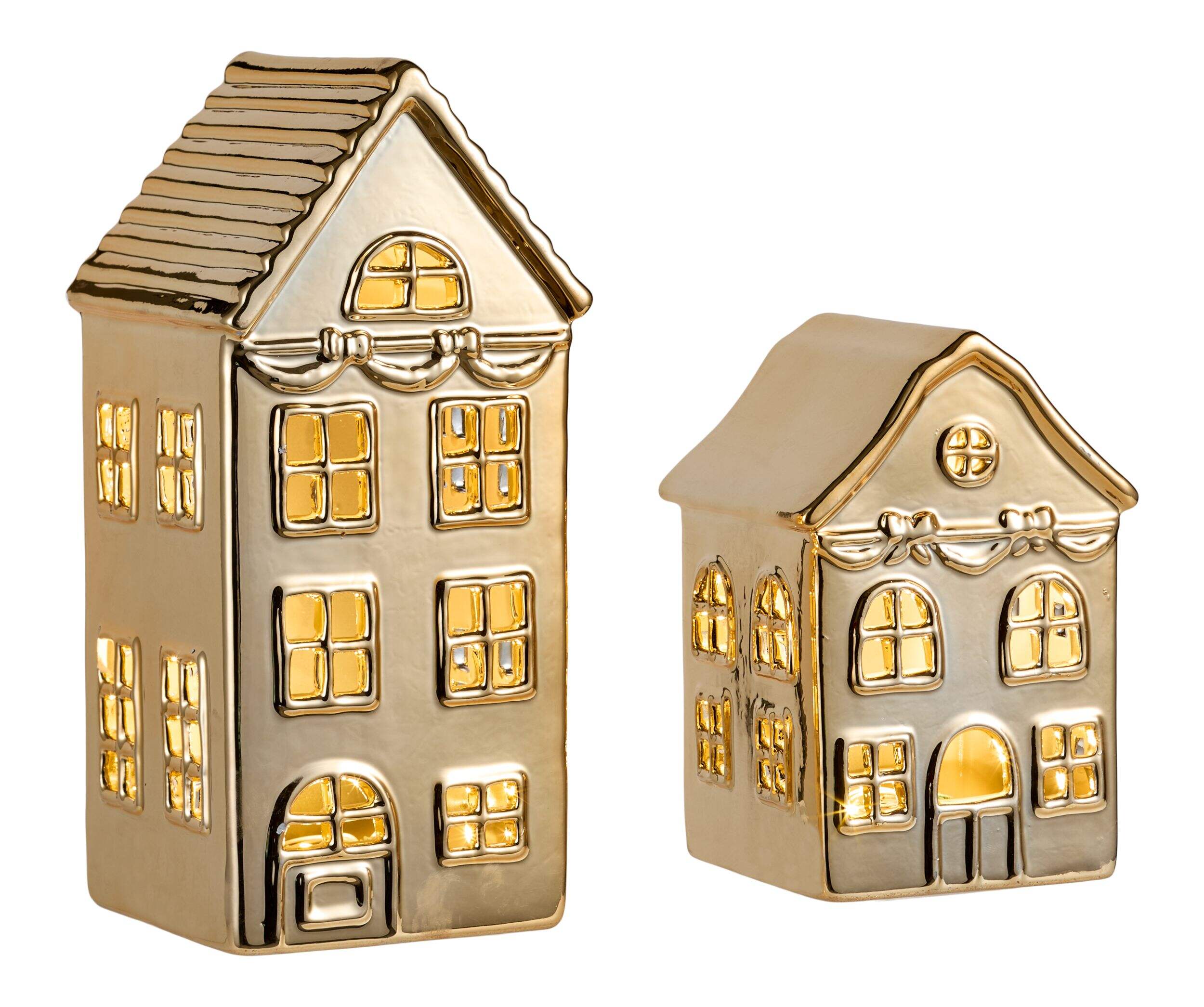 Enhance your holiday decor with the CANVAS Golden Moments Collection Christmas Decoration. These pre-lit gold houses add a touch of elegance to any tabletop or mantle, creating a warm and inviting atmosphere. Perfect for indoor use, these ceramic houses with a gold finish are a stylish addition to your festive decorations.