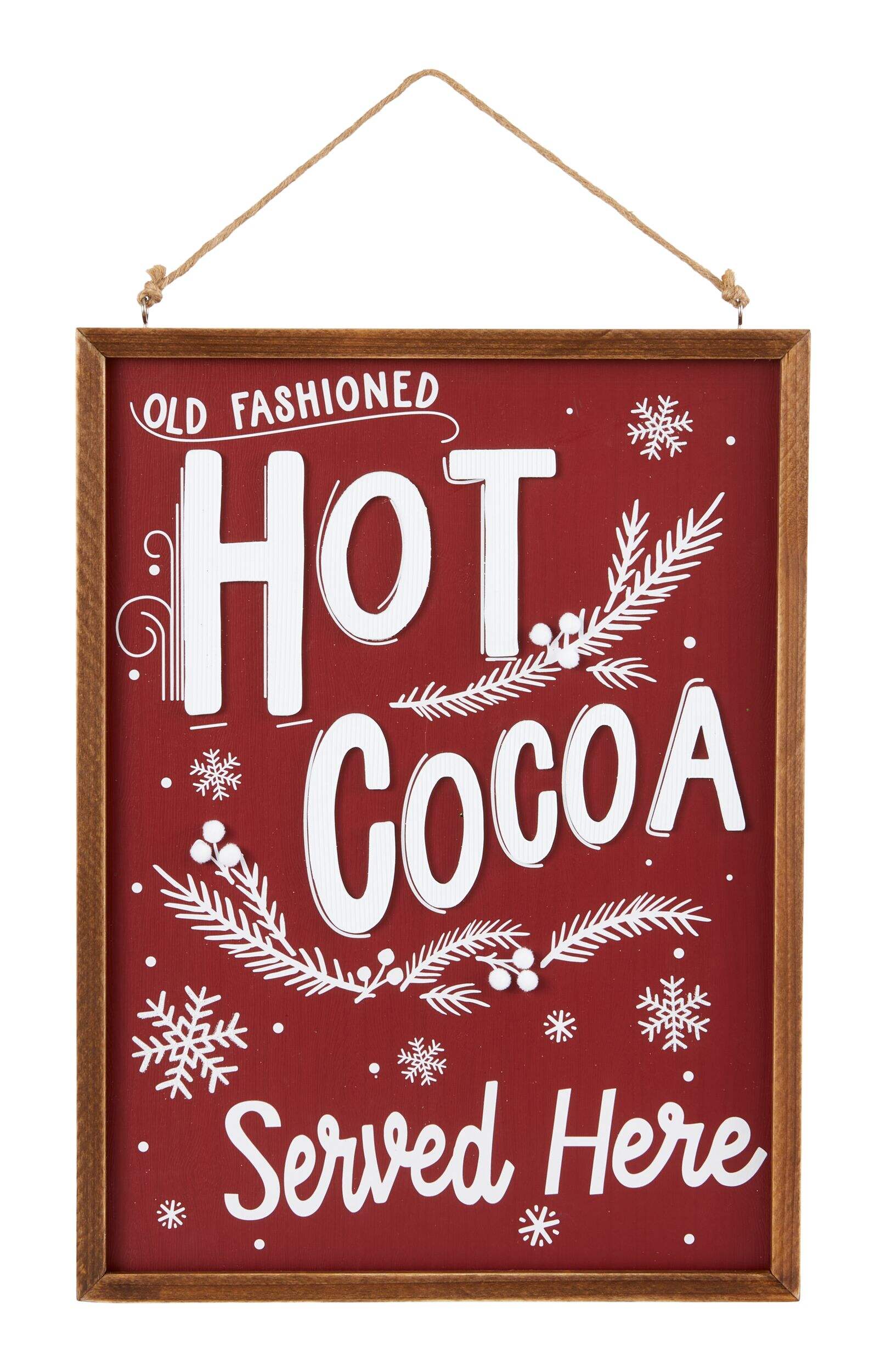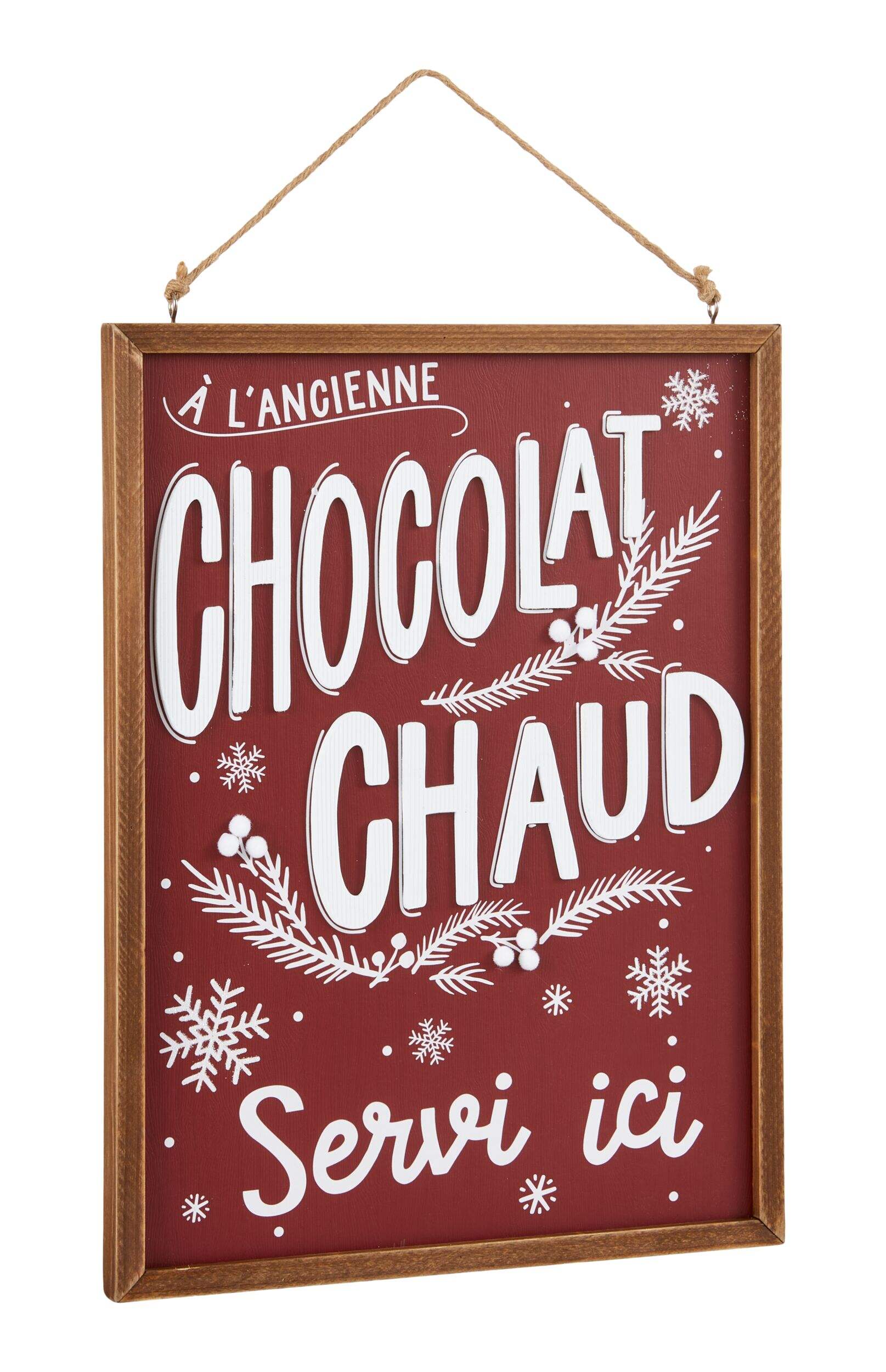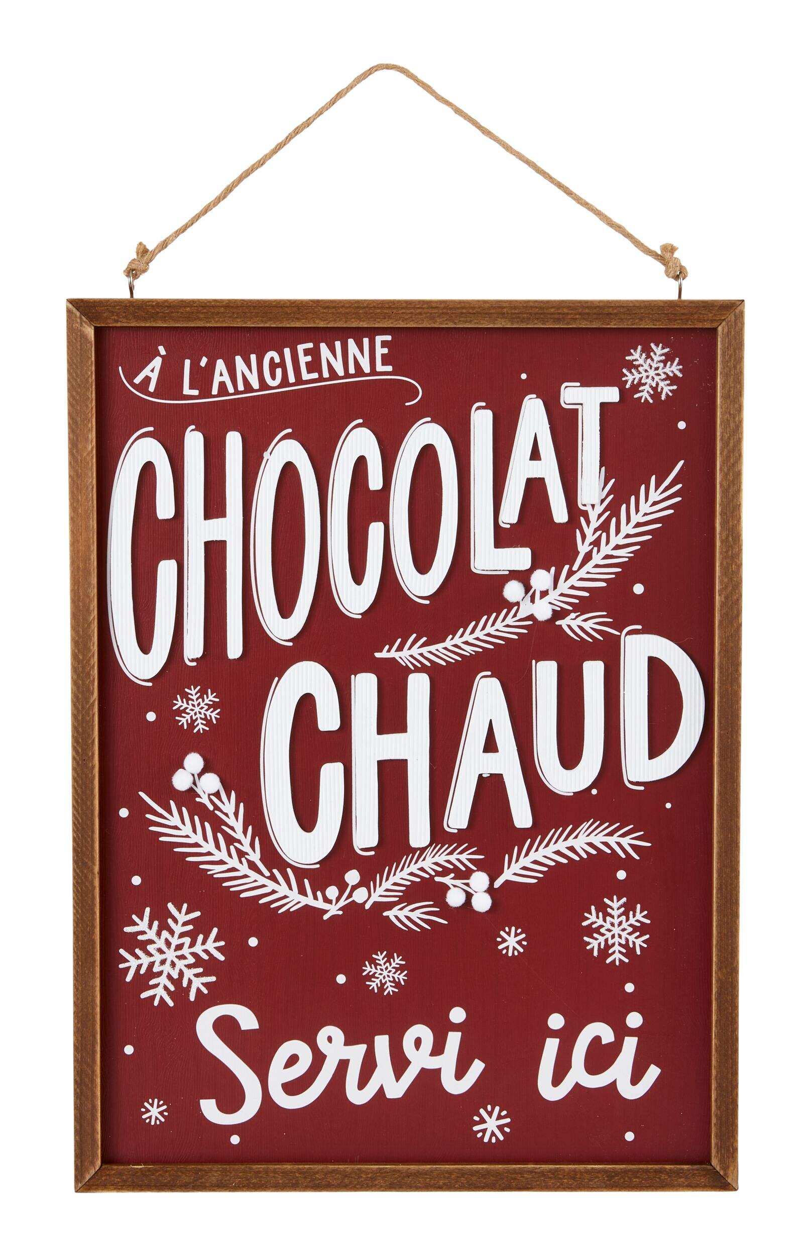 The bilingual CANVAS Hot Cocoa Wall Sign displays the message 'Hot Cocoa Served Here' against a festive red and white background, adding a warm and welcoming touch to your space. It's ready to hang, and features French text on the reverse side.