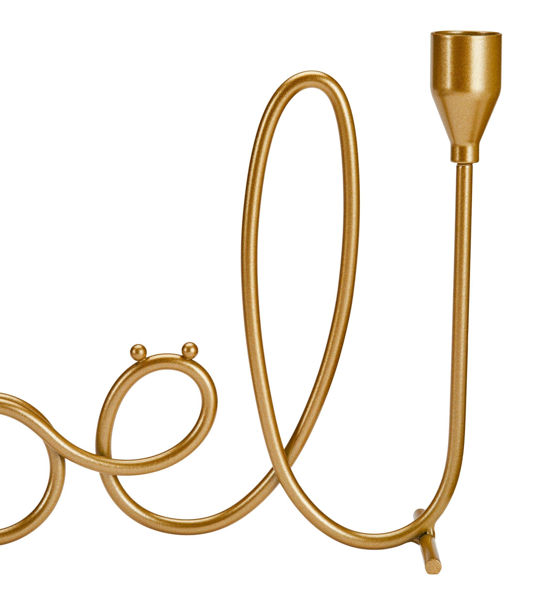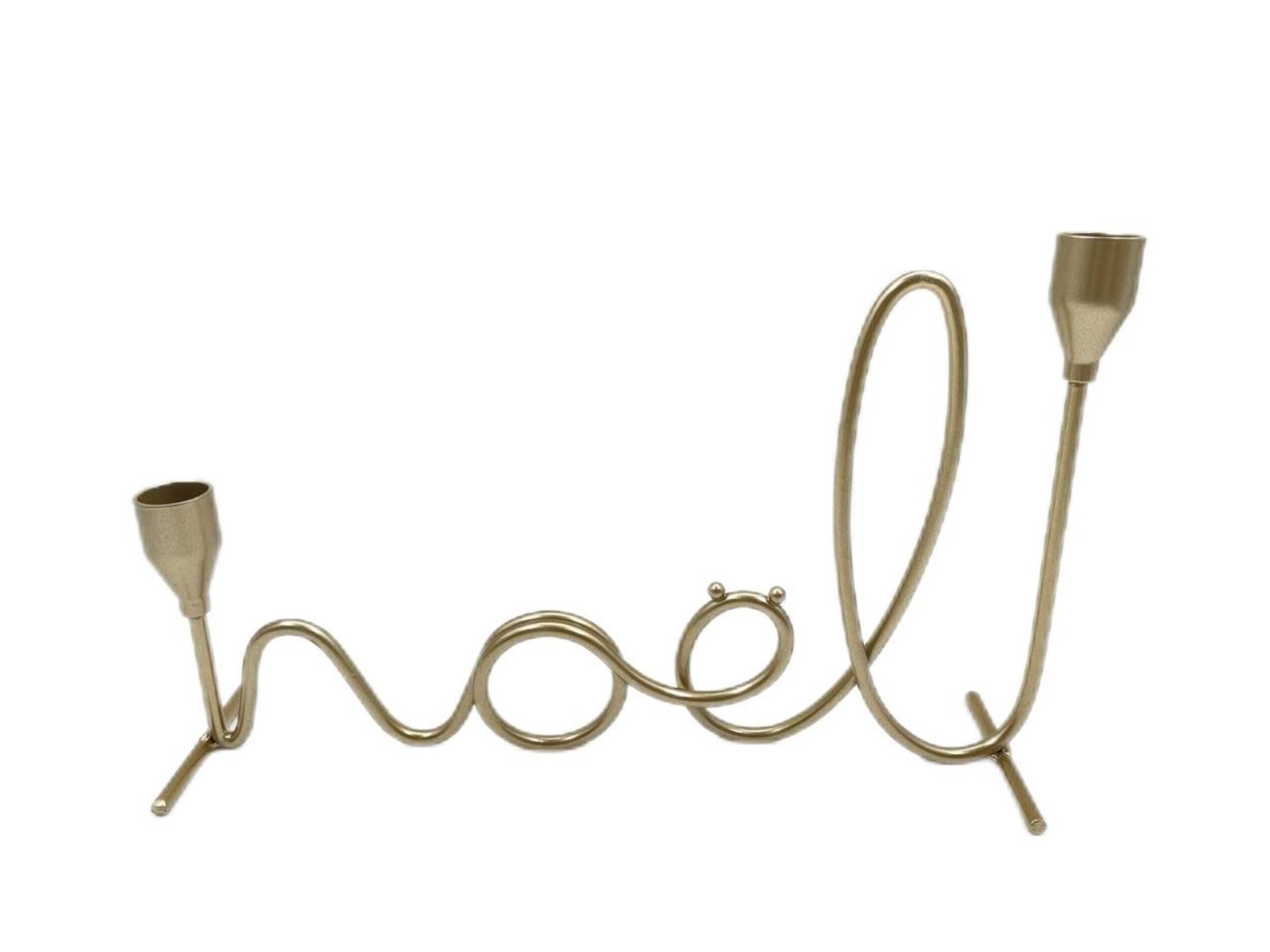 The CANVAS Holiday Homecoming Candle Stick Holder is the perfect way to light up any room with its cursive 'Noel' design in gold. Crafted from metal, this holder securely holds two LED or wax taper candles.