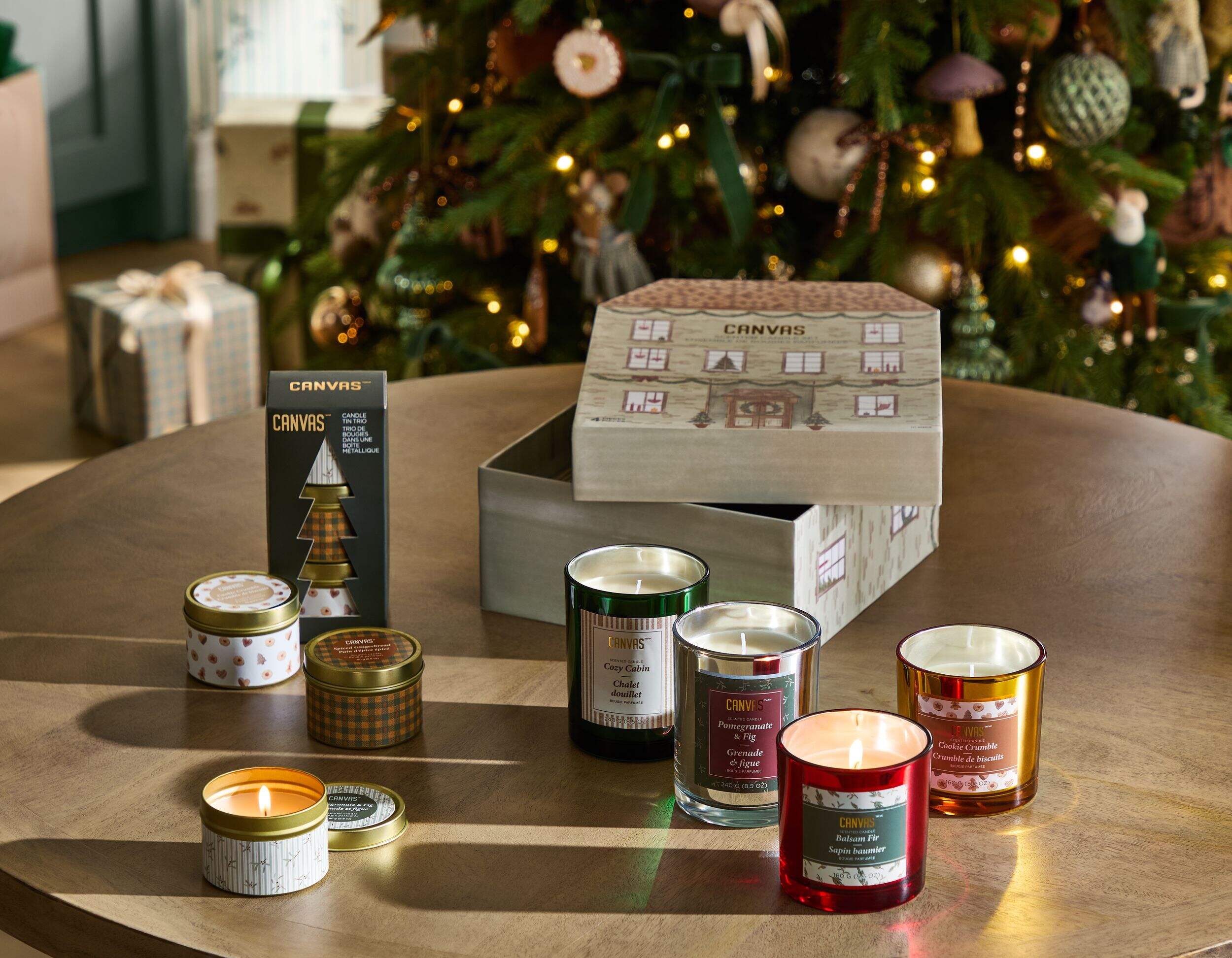 Scents include: pomegranate and fig, cookie crumble, cozy cabin, and balsam fir