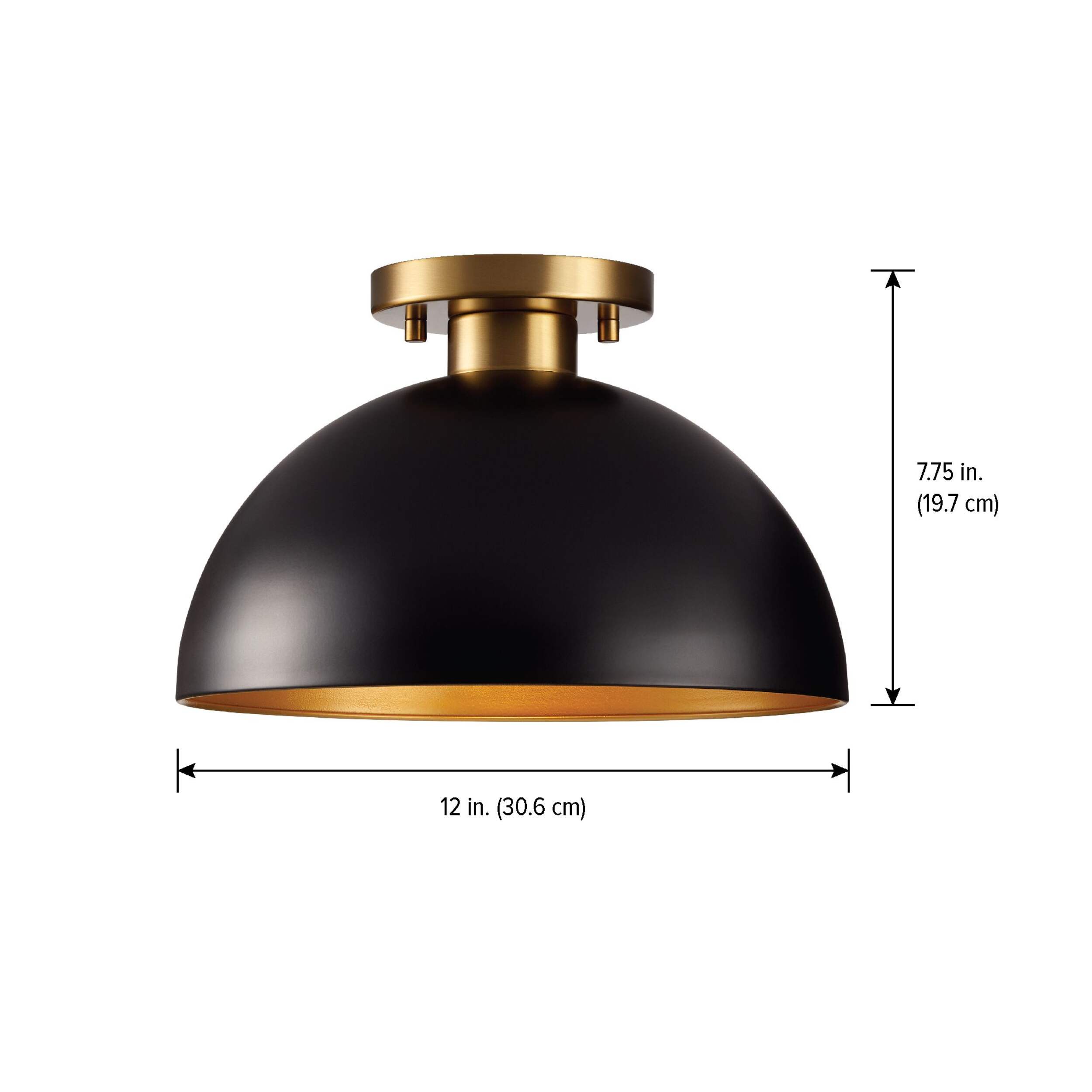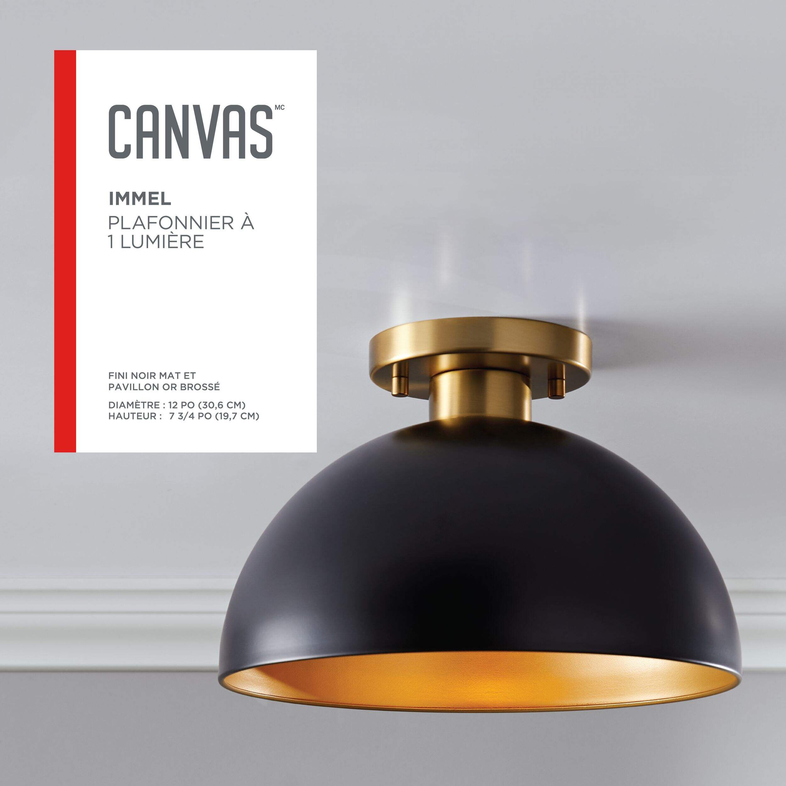 Elevate your space with the CANVAS Immel Semi-Flush Mount Ceiling Light, a perfect blend of modern design and subtle sophistication. Featuring a simple yet stylish shaded design, this fixture complements a variety of décor styles. The matte black outer shade is beautifully contrasted by a brushed gold interior, adding a refined touch that enhances any room. This minimalist fixture casts a warm, golden glow, creating a cozy and inviting atmosphere, perfect for those who love Hygge-inspired spaces. Whether it's your living room, bedroom, or hallway, the Immel light adds an understated elegance to your home.