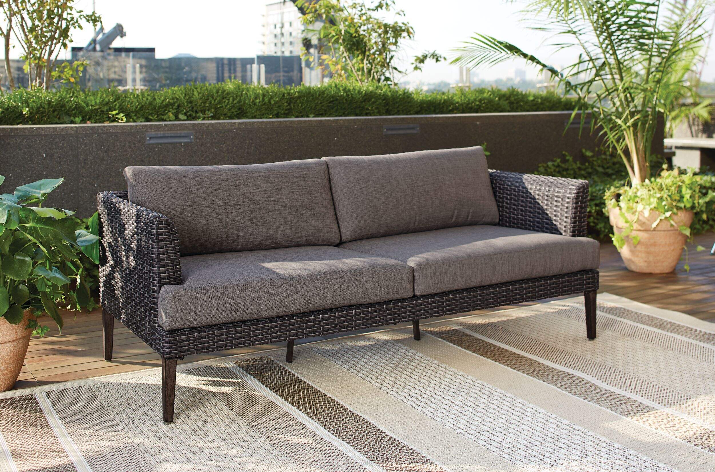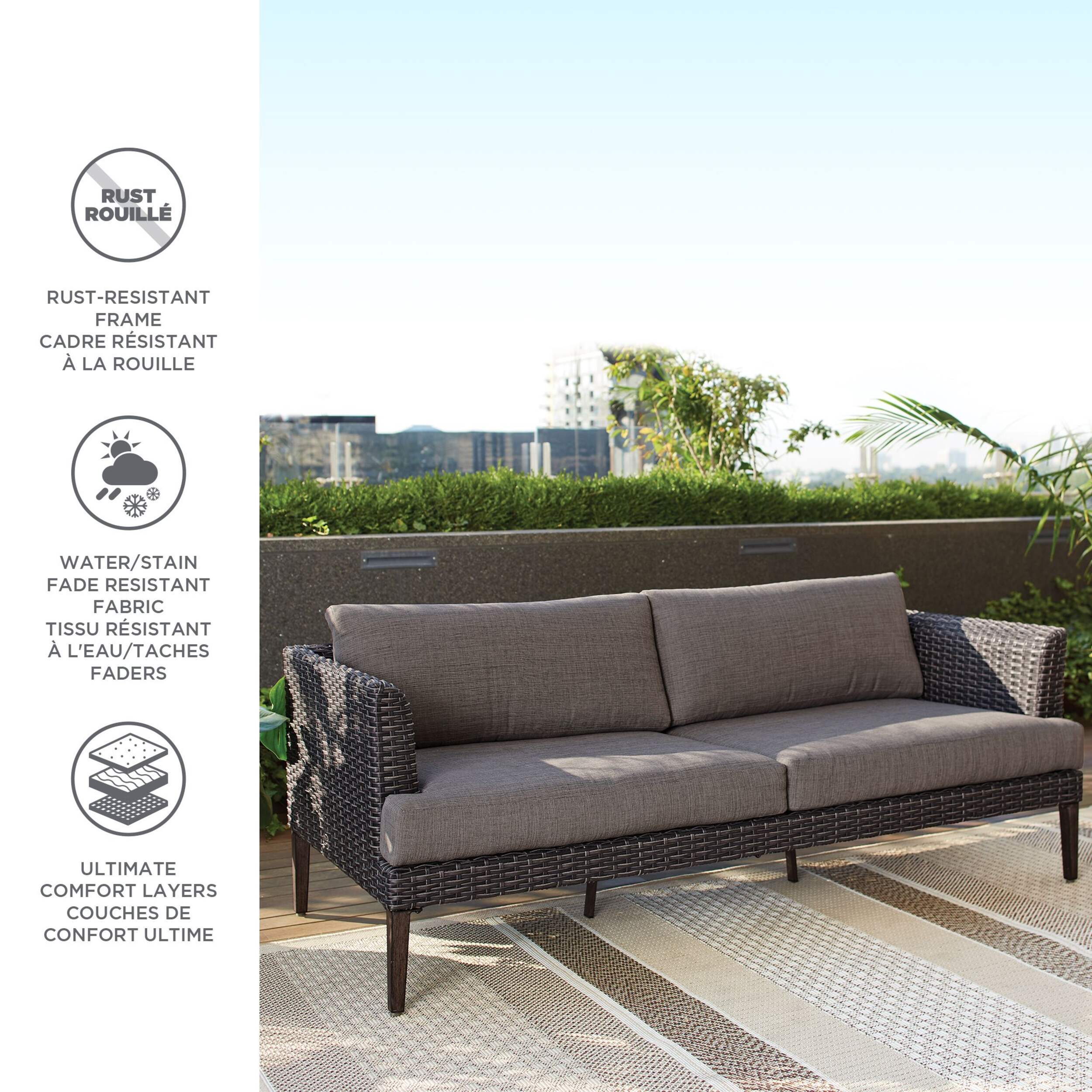 The CANVAS Jensen Conversation Collection Outdoor/Patio Sectional Couch brings comfort and design to your home. Designed to get your guests talking, this sectional couch with cushions is durable, with a rust-resistant, e-coated and powder-coated steel frame that can handle punishing weather. This outdoor couch’s hand woven grey wicker is a multi-toned mixed weave that stands up to rain or snow. The hand-painted faux wood finish adds a rustic touch, while the couch has deep seating for extra comfort. Its cushions are made from TRIPEL protected olefin fabric that is quick-drying and UV-resistant. The fabric repels both water and stains, too. As an added bonus, this outdoor metal couch with cushions comes with additional fast-drying plush cushions to help you and your guests get extra comfortable while you lounge in your yard. Measuring 74" L x 32.5" W x 26.5" H (188.5 x 83 x 67.5 cm), this comfortable piece of outdoor furniture has generous seating room. The couch coordinates easily with the rest of the CANVAS Jensen Conversation Collection, including the Jensen Coffee Table (0881927) and Jensen Side Table (0881928).
