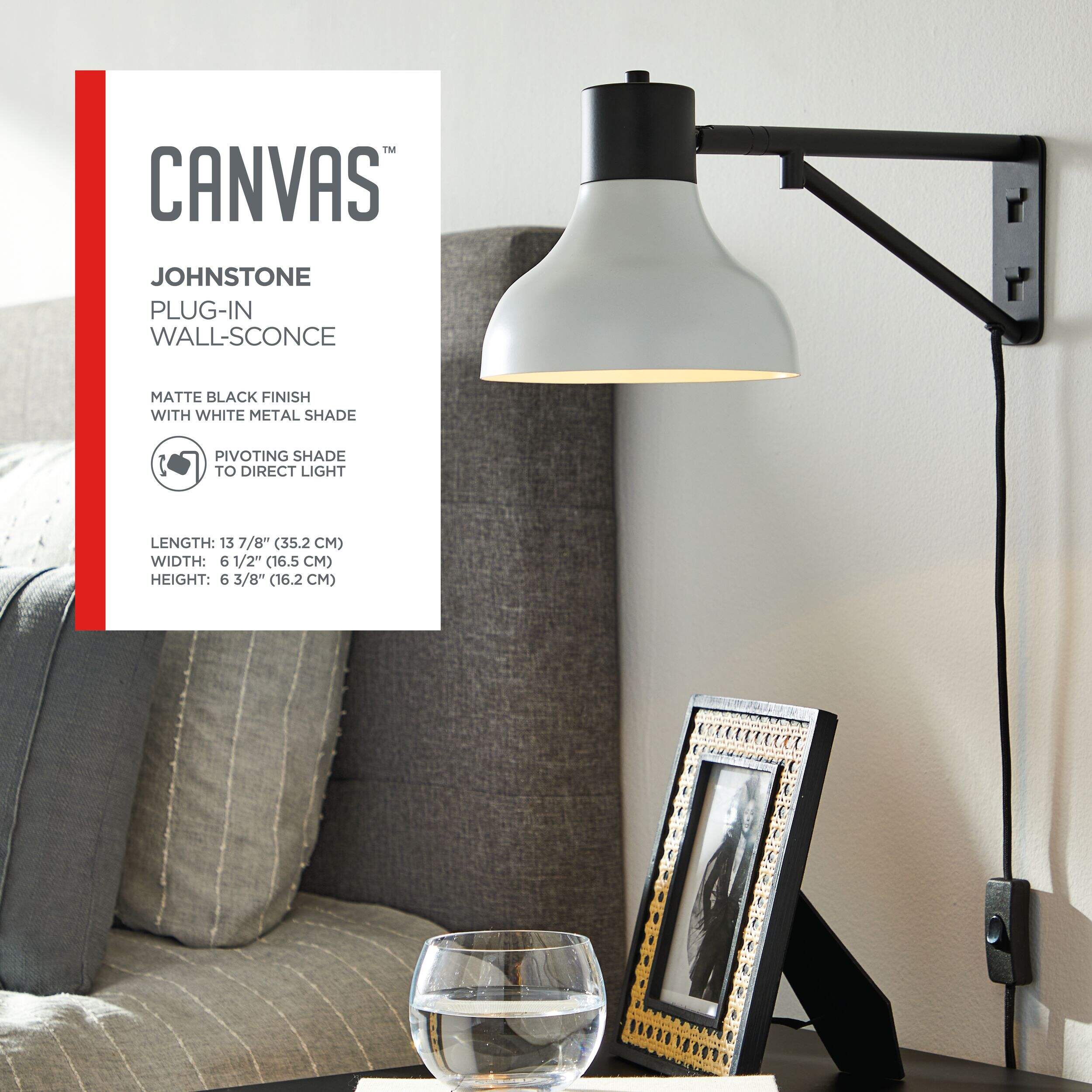 The CANVAS Johnstone Plug-In Wall Sconce adds timeless style and functionality to any room. With its matte black finish and pivoting shade, this modern yet classic sconce blends seamlessly with various decor schemes. Designed for easy plug-in installation, it’s perfect for creating a cozy bedside reading nook or illuminating your favourite space. Enjoy versatile lighting without the hassle of hardwiring.